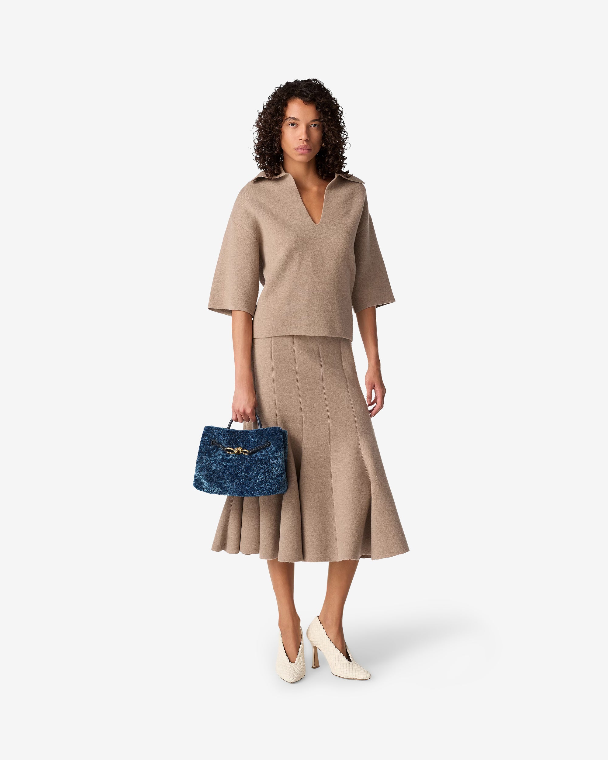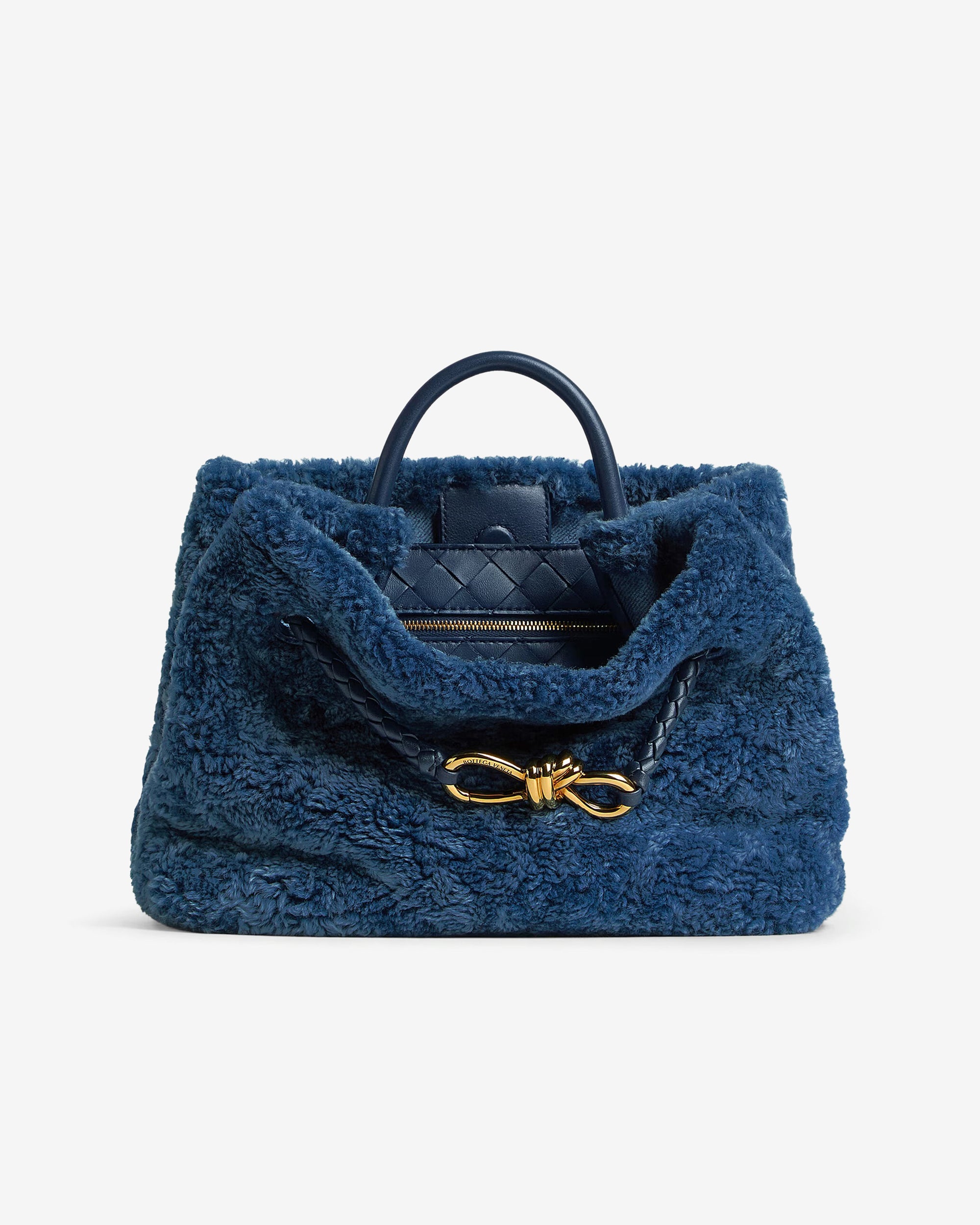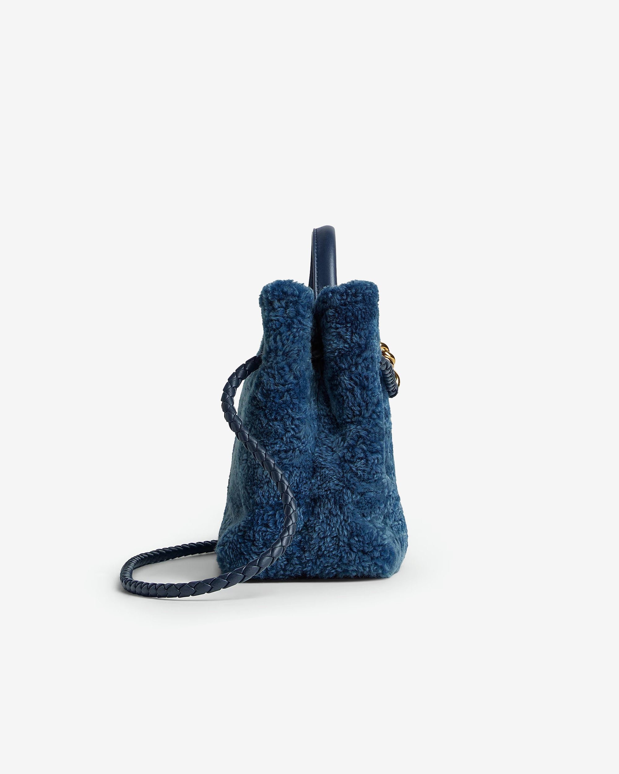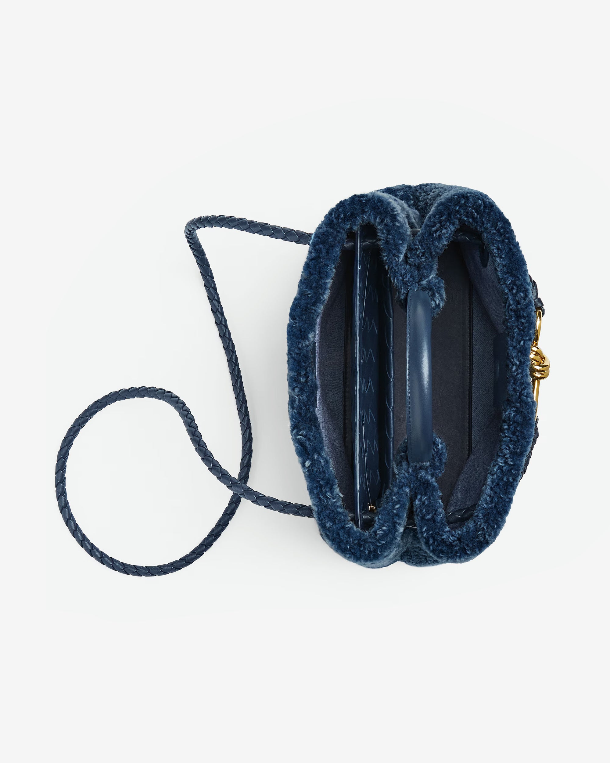 Top handle bag in merino shearling with denim effect. Featuring signature knot detail and sliding cross-body strap.