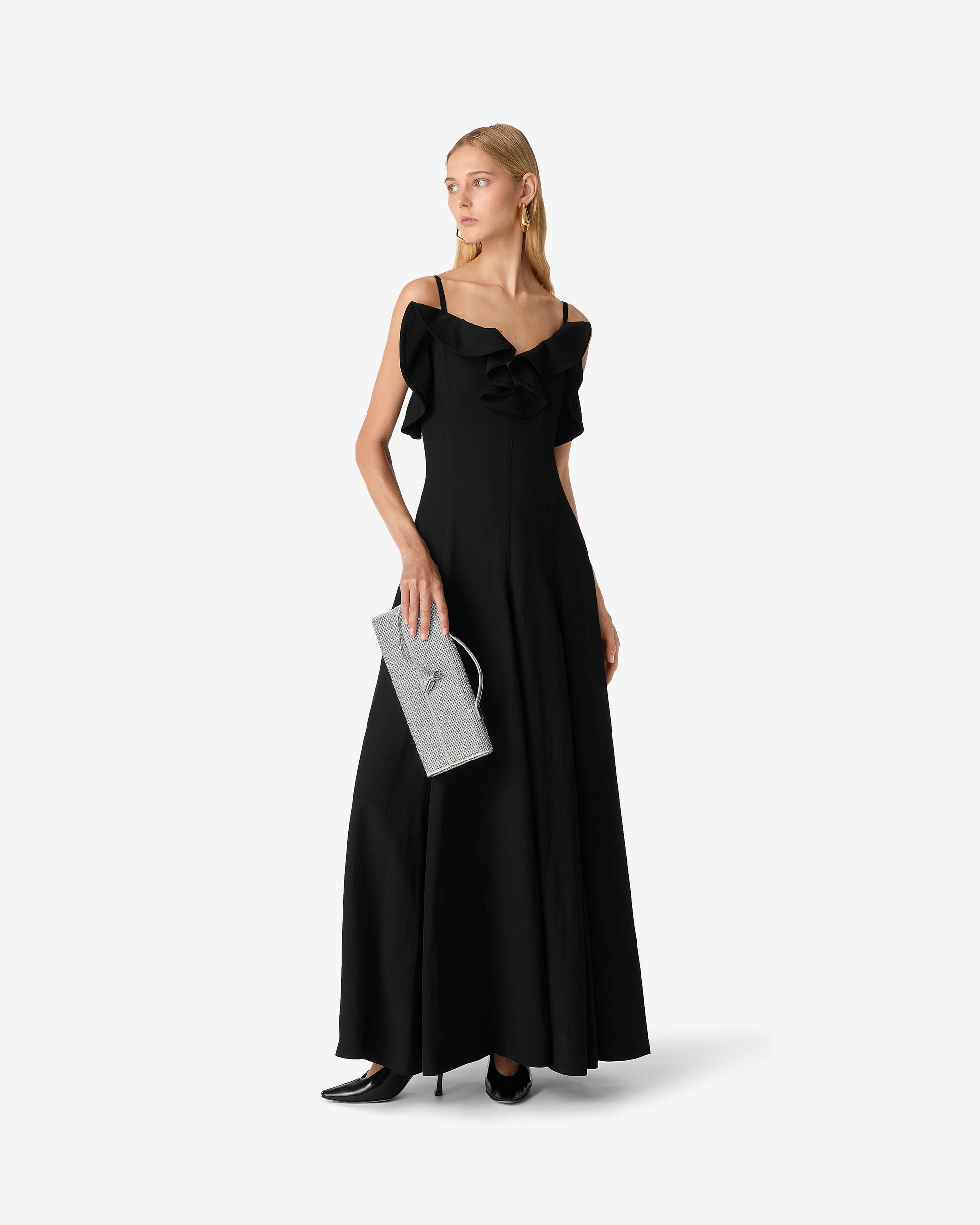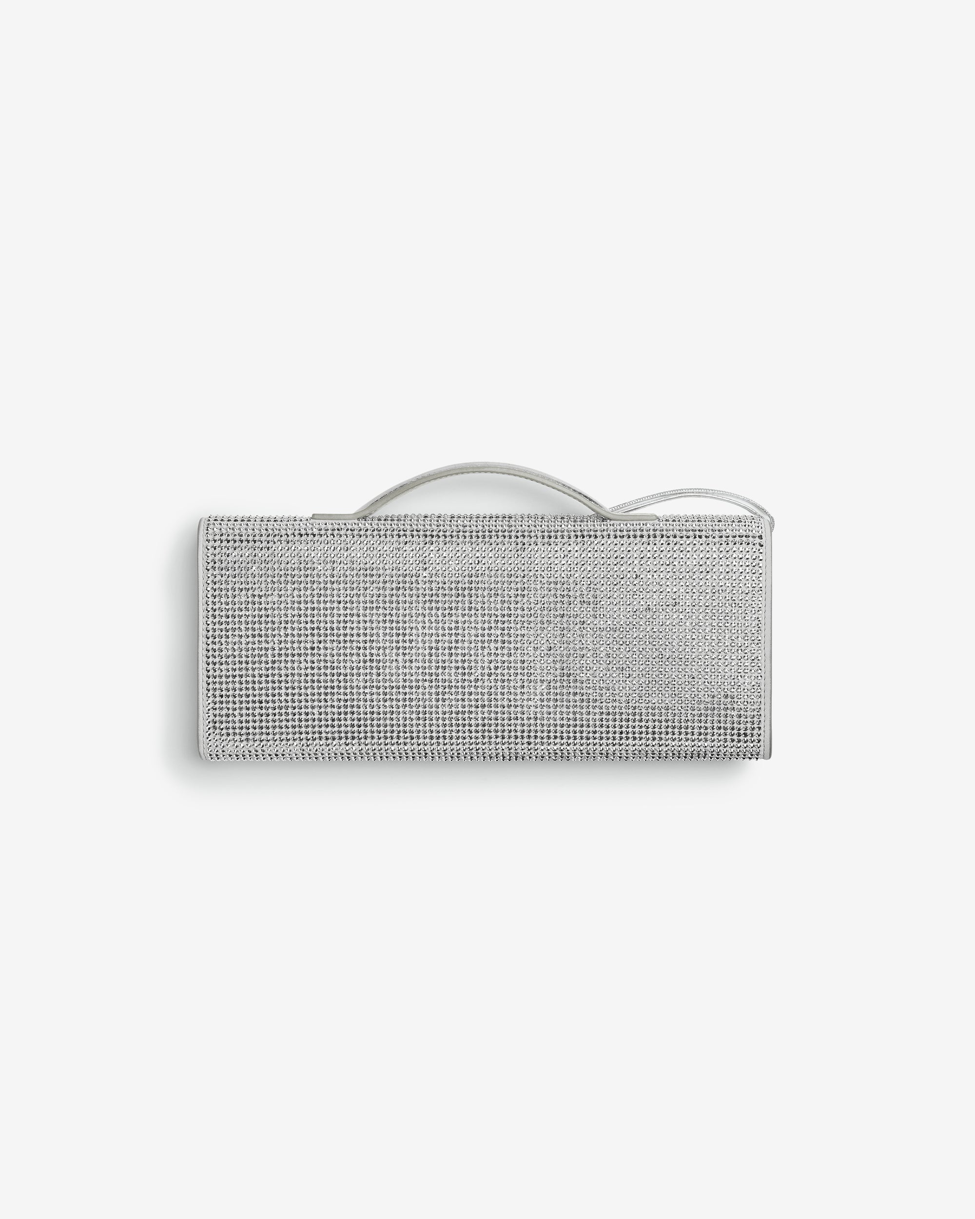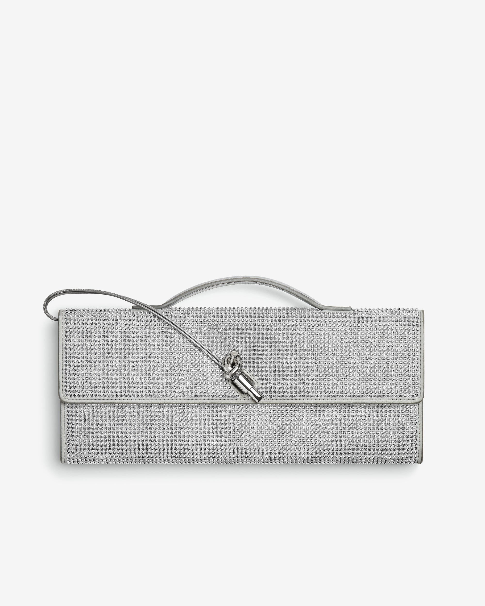 Top handle clutch in supple leather with all-over crystal detailing and signature knot closure.