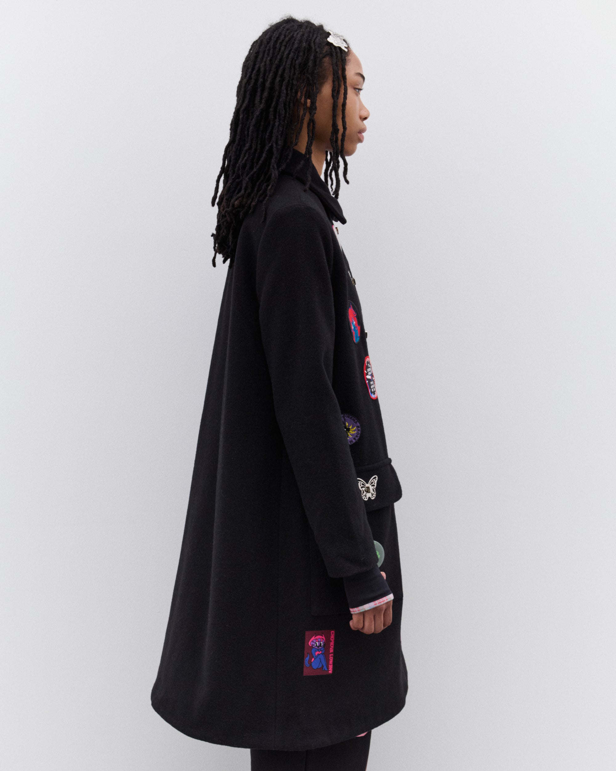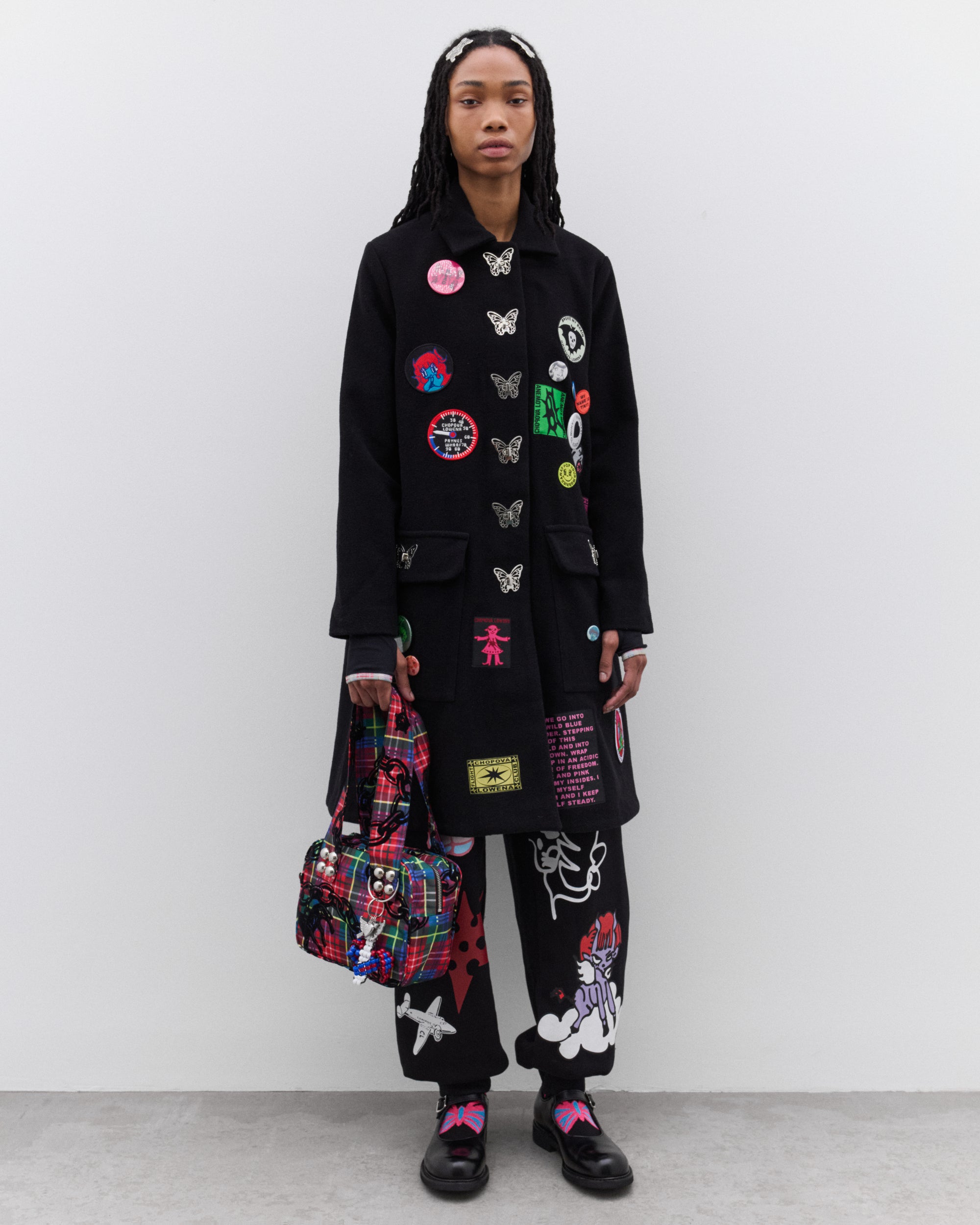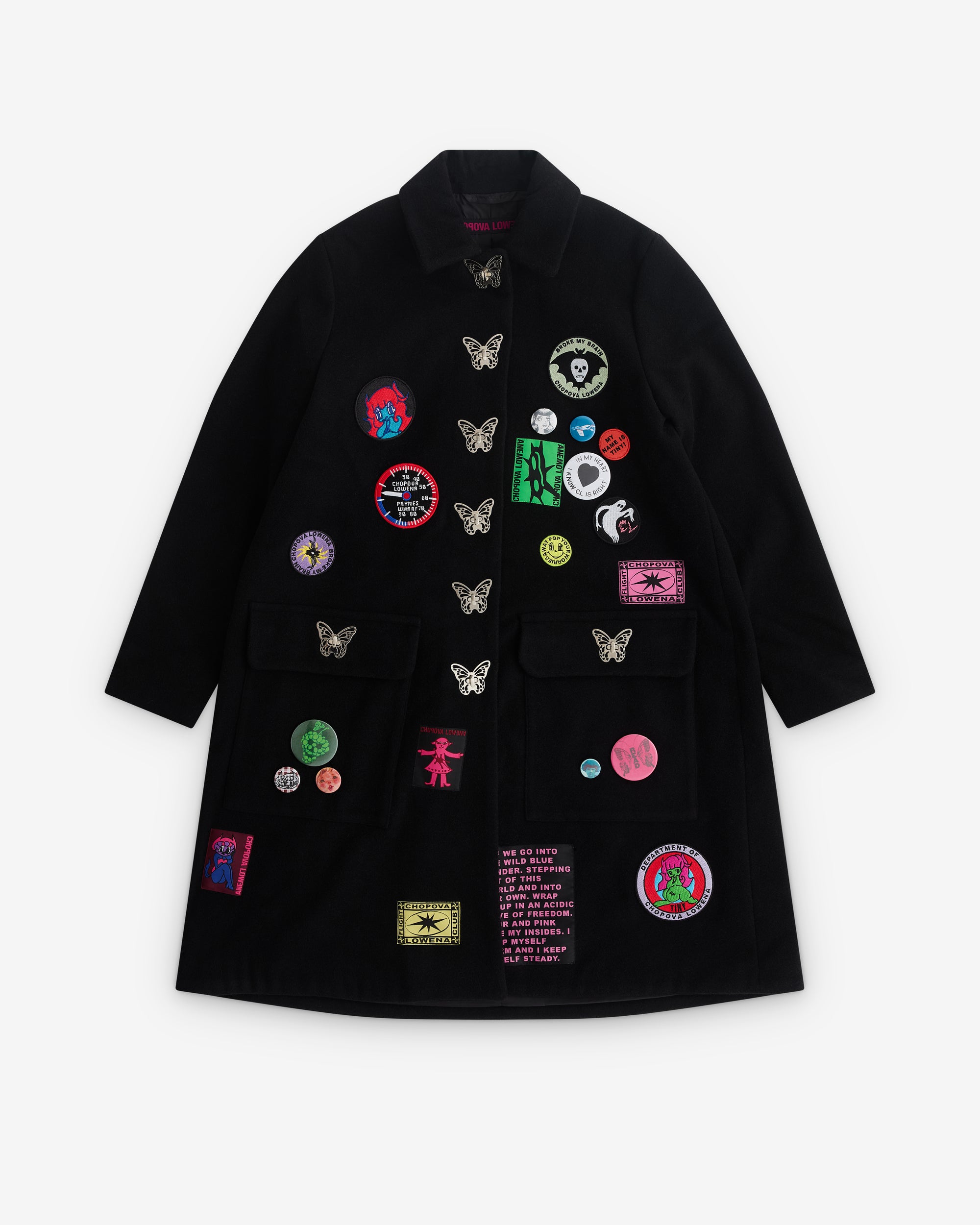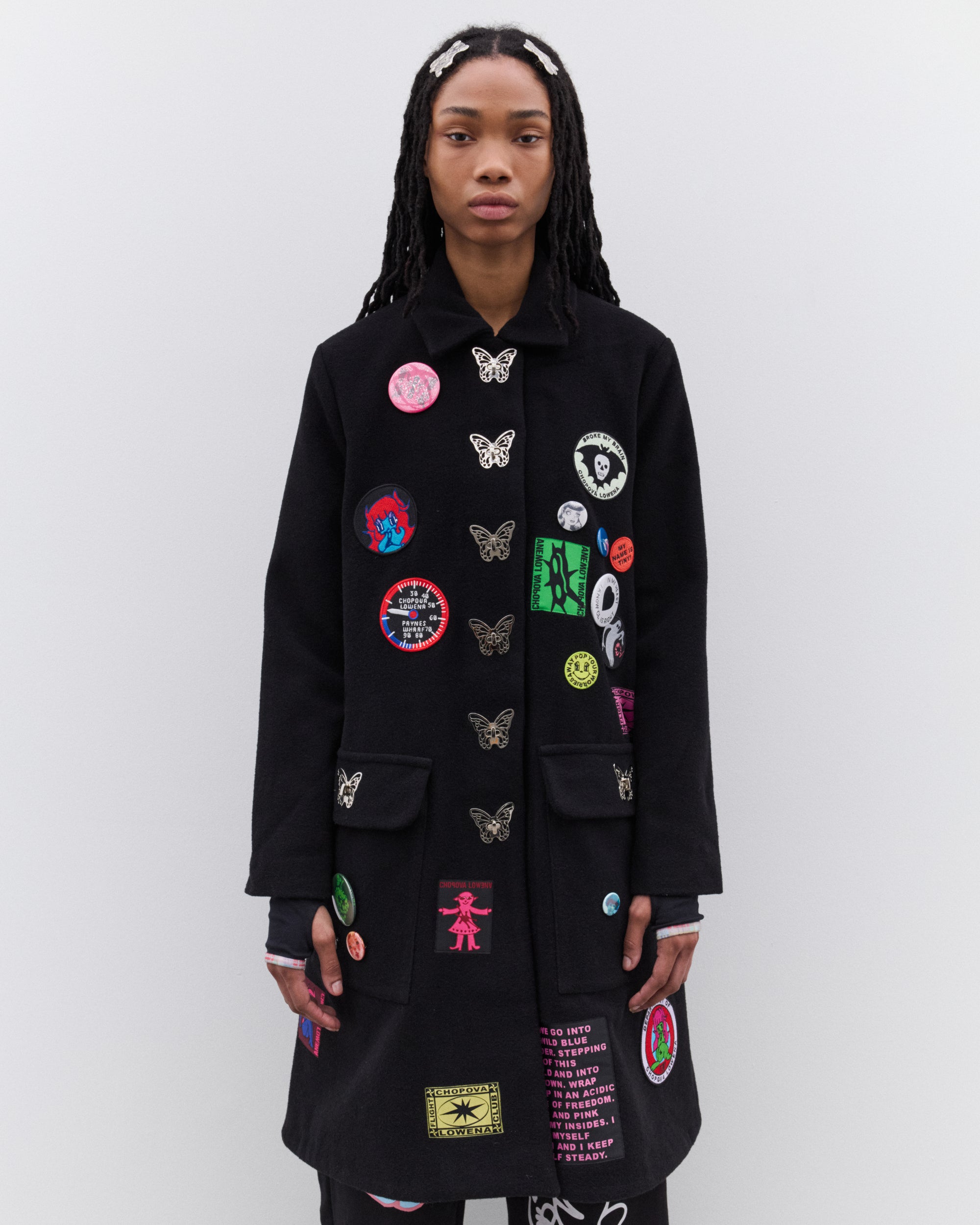 Turnlock butterfly buttonsEmbroidered patchesRemovable pin badgesCollaredLinedFlap patch pockets