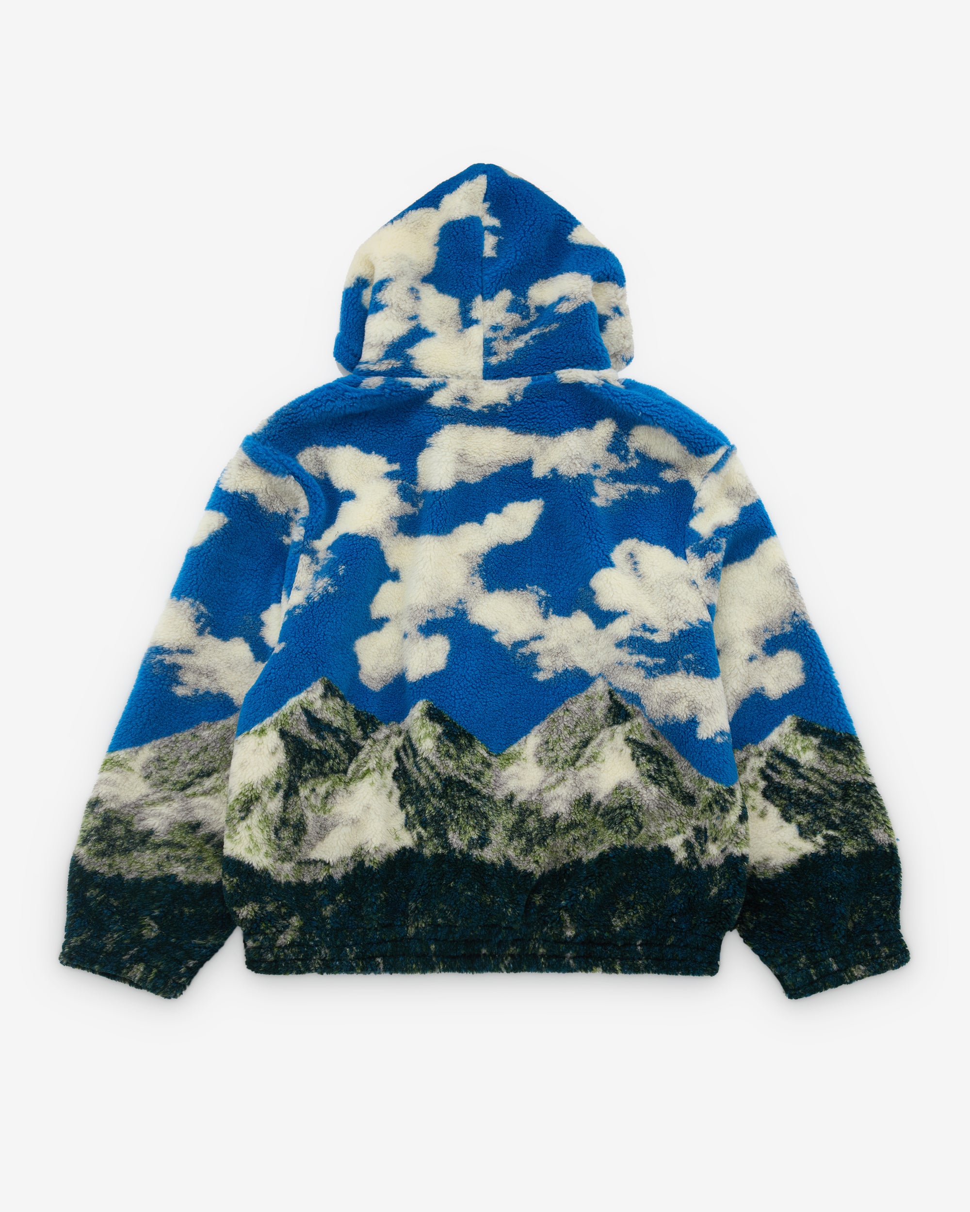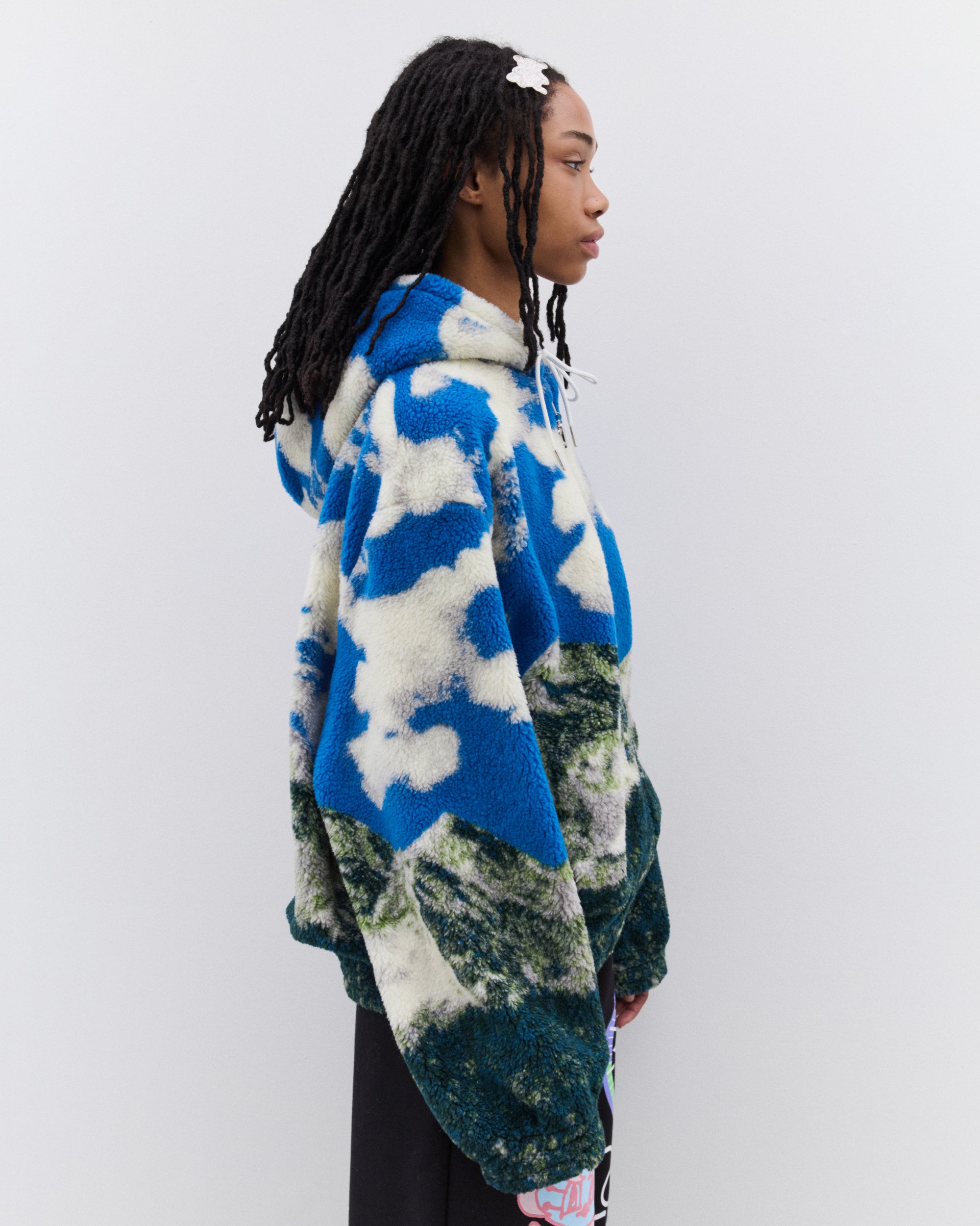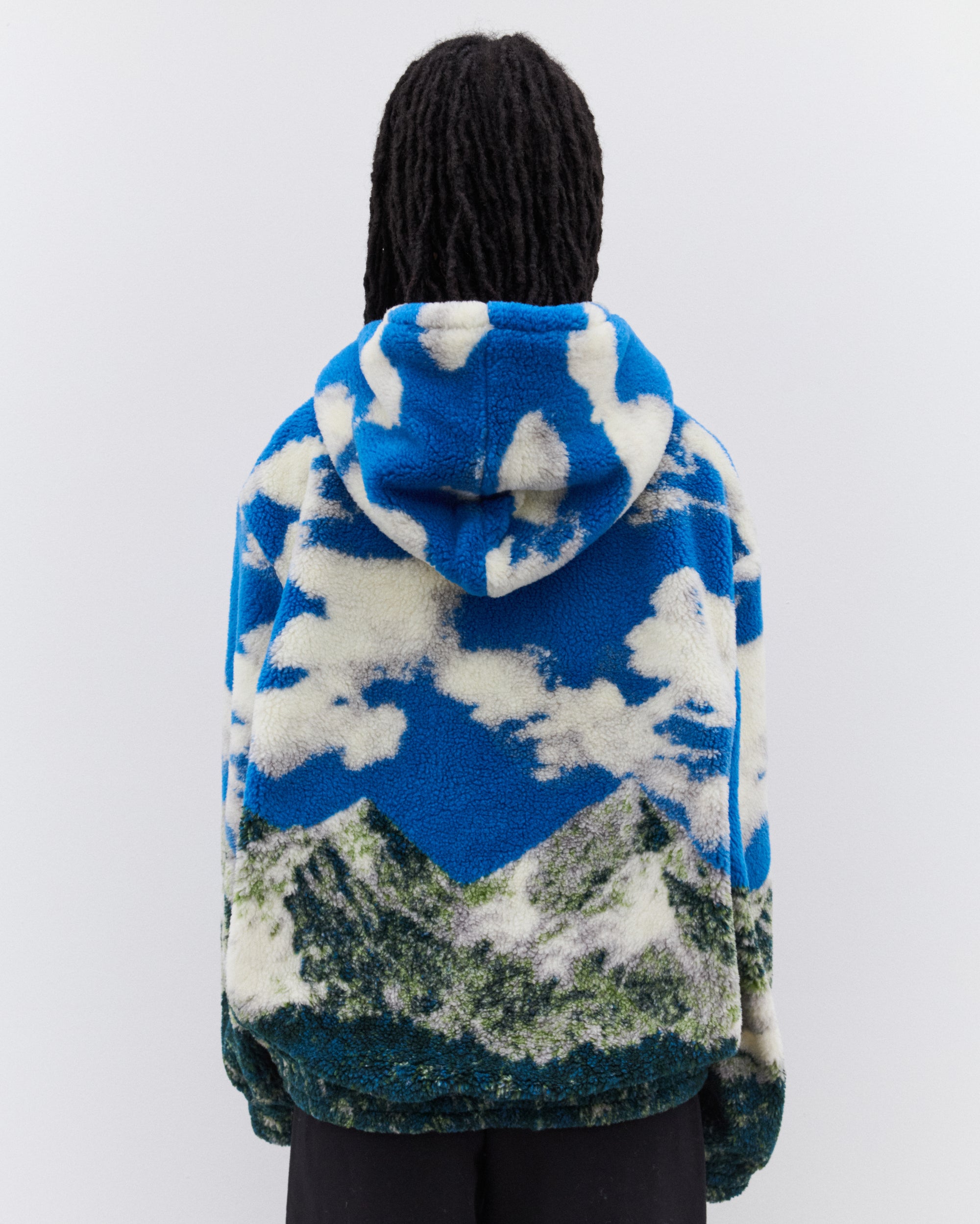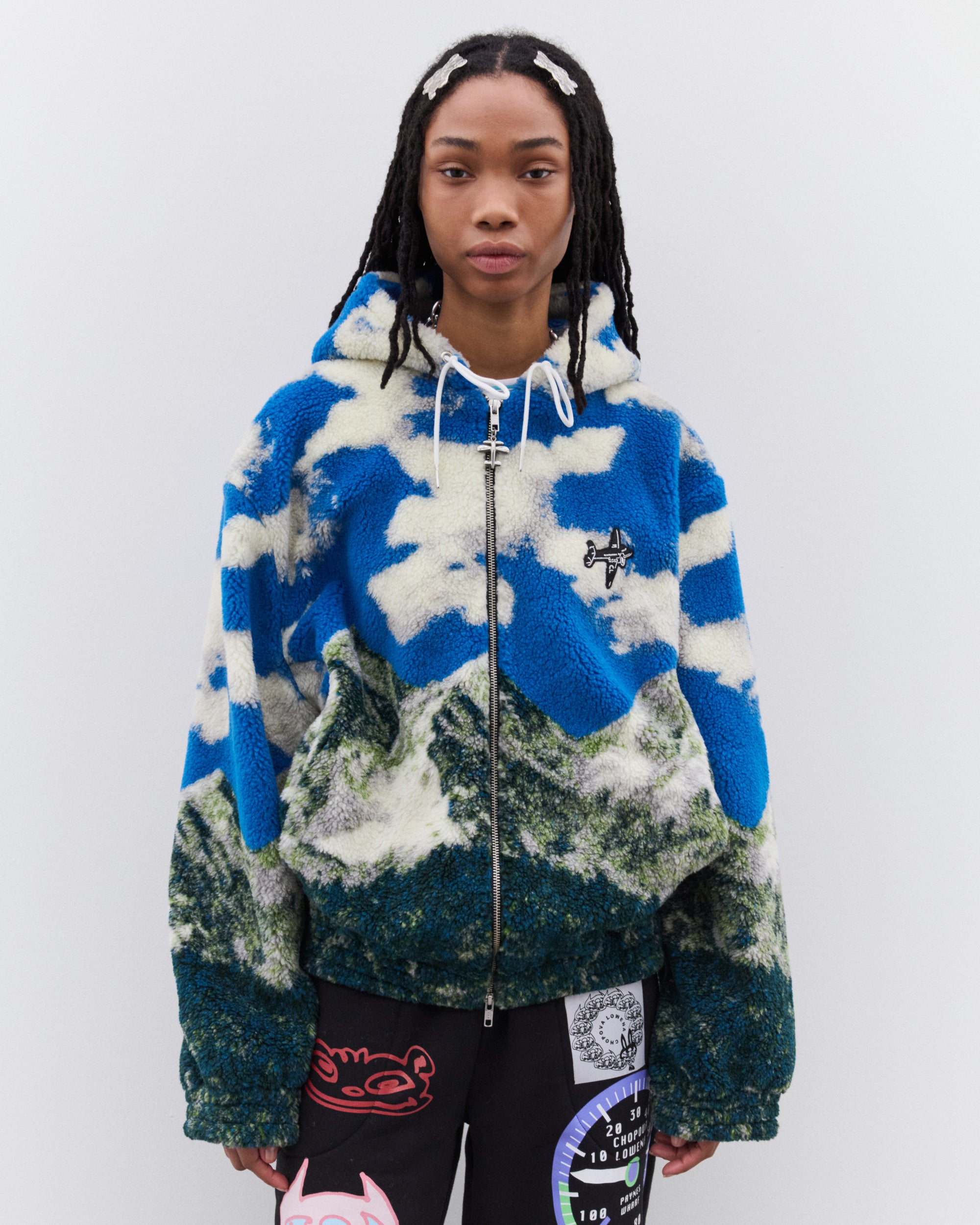 Relaxed fitAllover blue landscape printElasticated waist and cuffsEmbroidered patchTwo-way zipAirplane charm zip pullDrawstring hoodieSide pockets