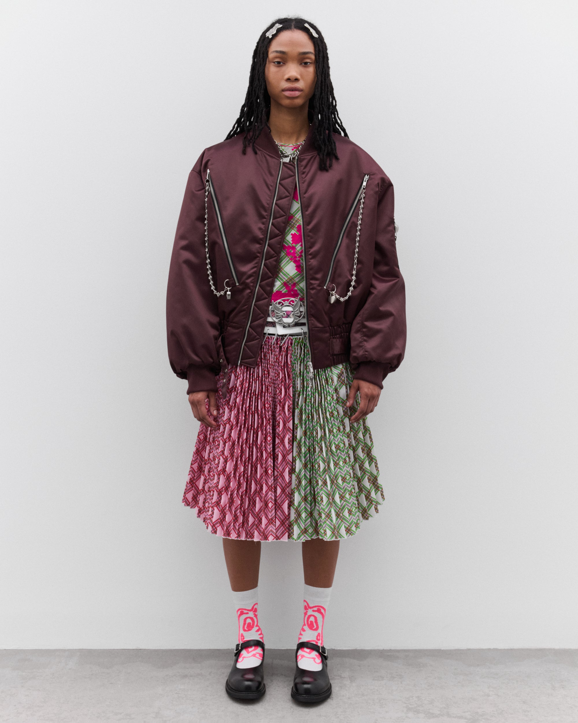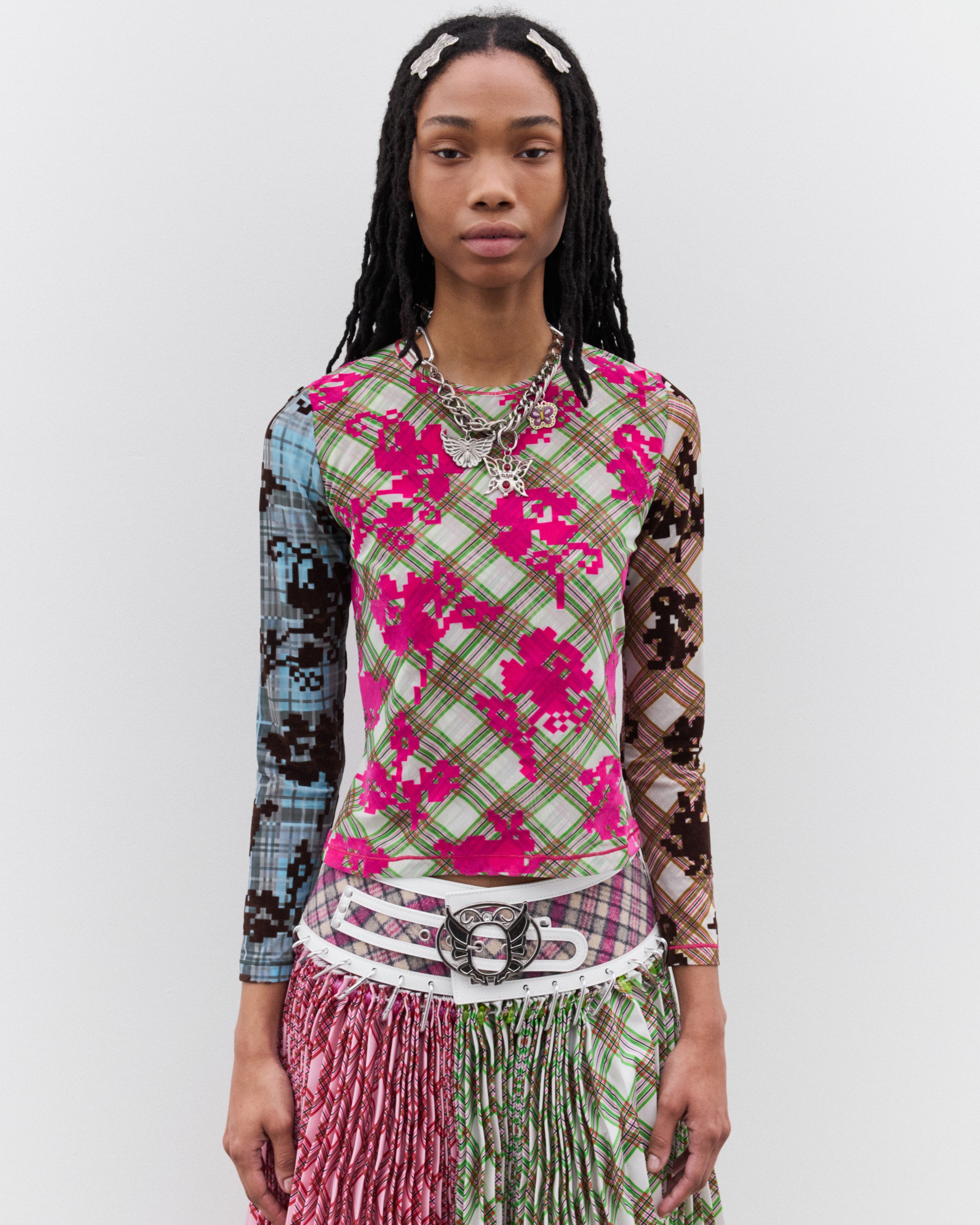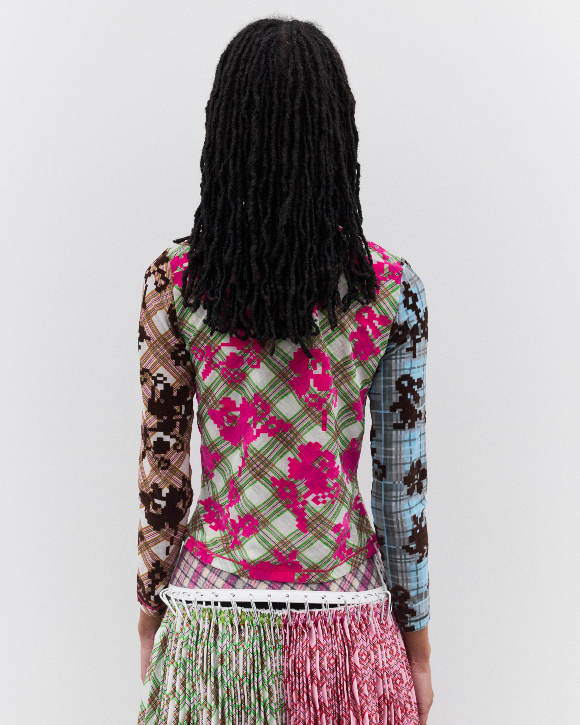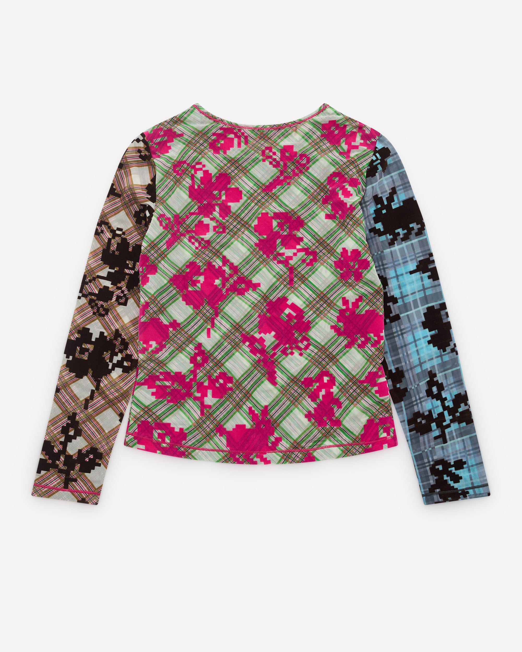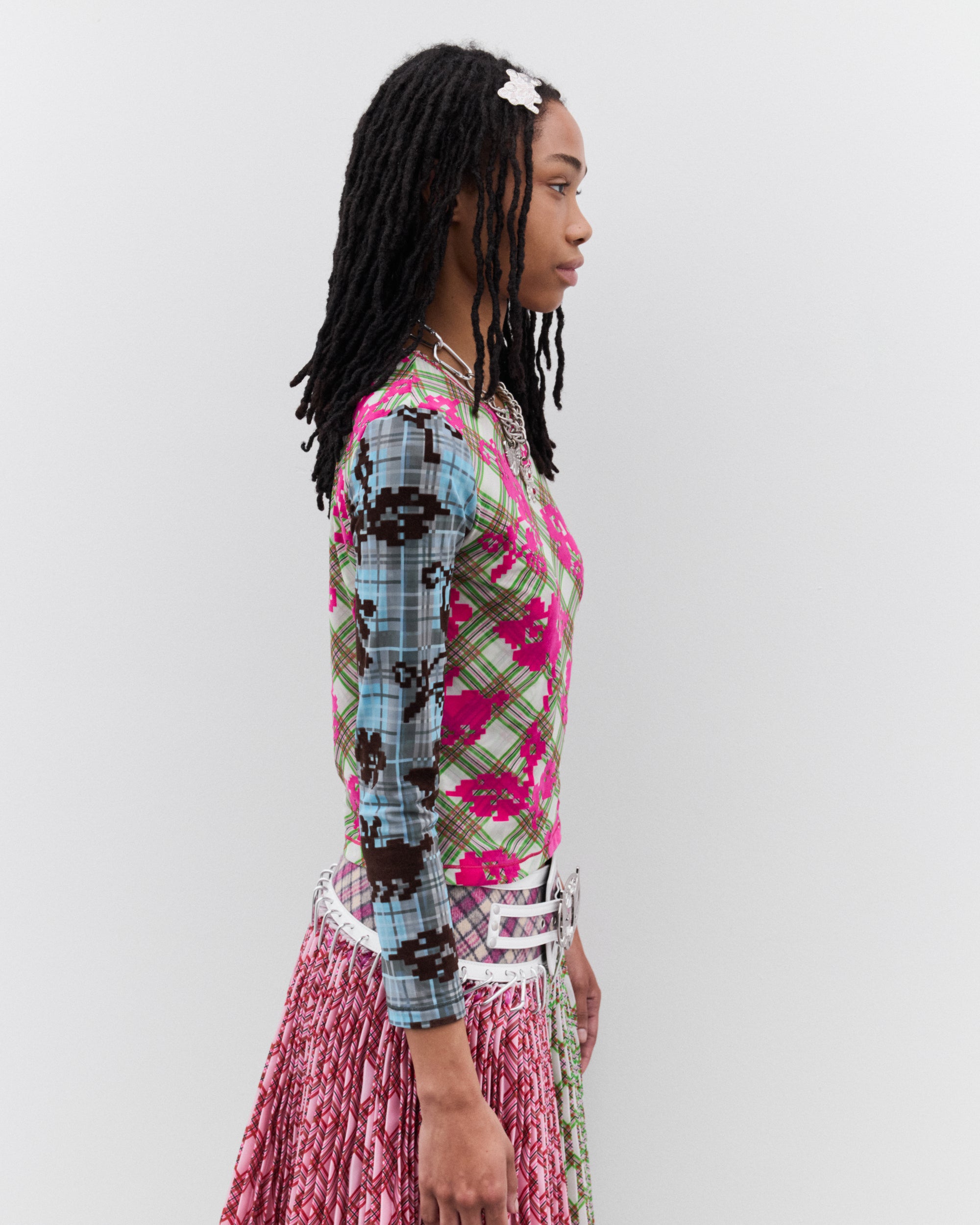 Double layer meshGreen and white tartan printContrast blue and brown tartan sleevesPink and black pixel bunny and flower flockingCrewneckLong sleeve