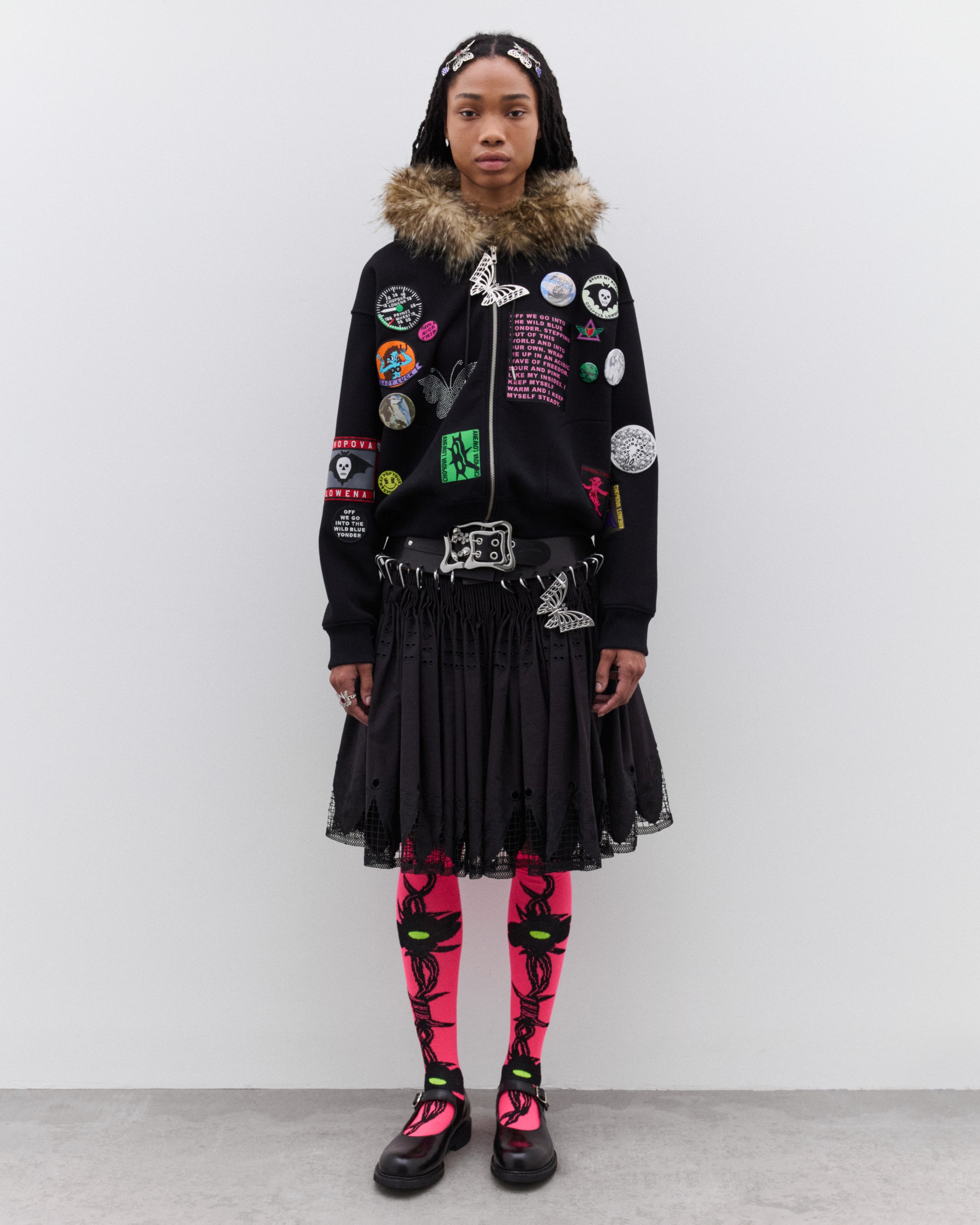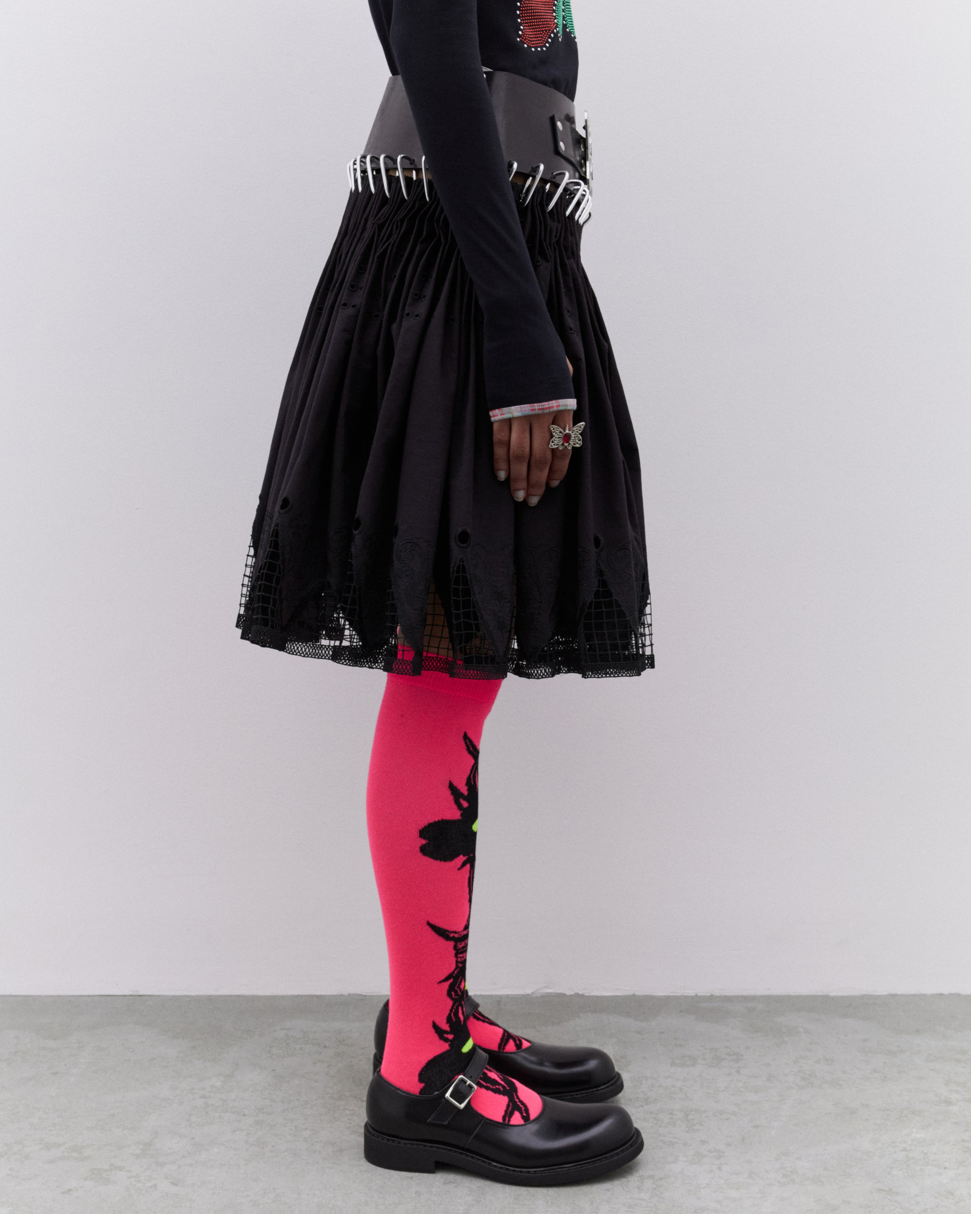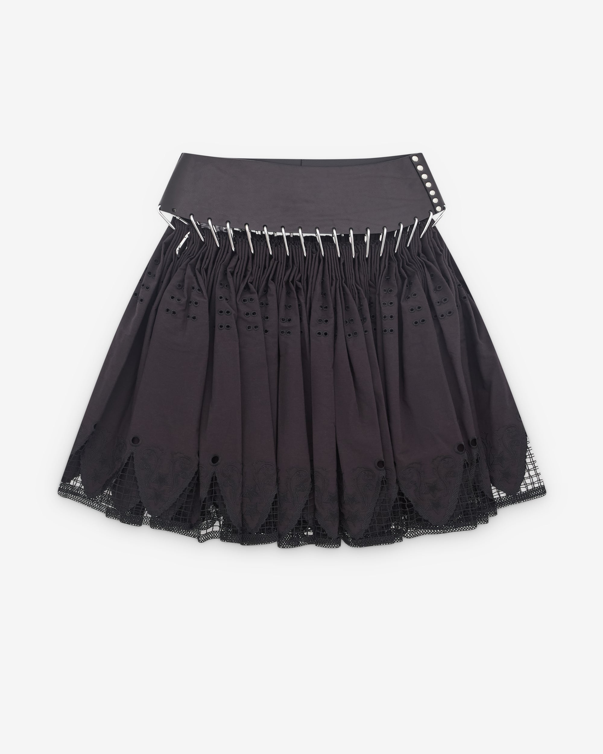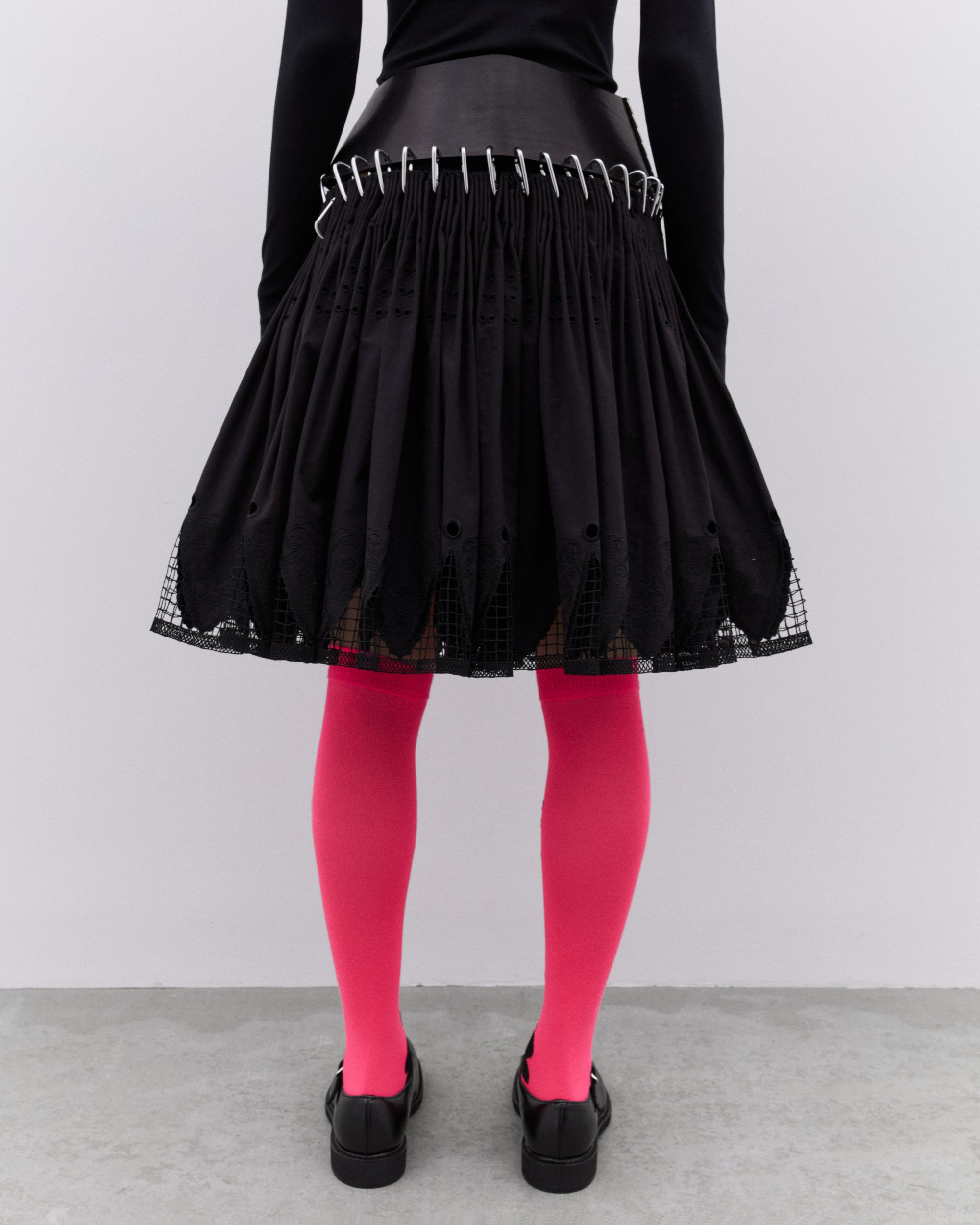 Wide, leather belt fasteningSkirt affixed by carabinerButterfly charmBroderie anglaise and lace trim at hemMini-lengthSilver-tone hardware