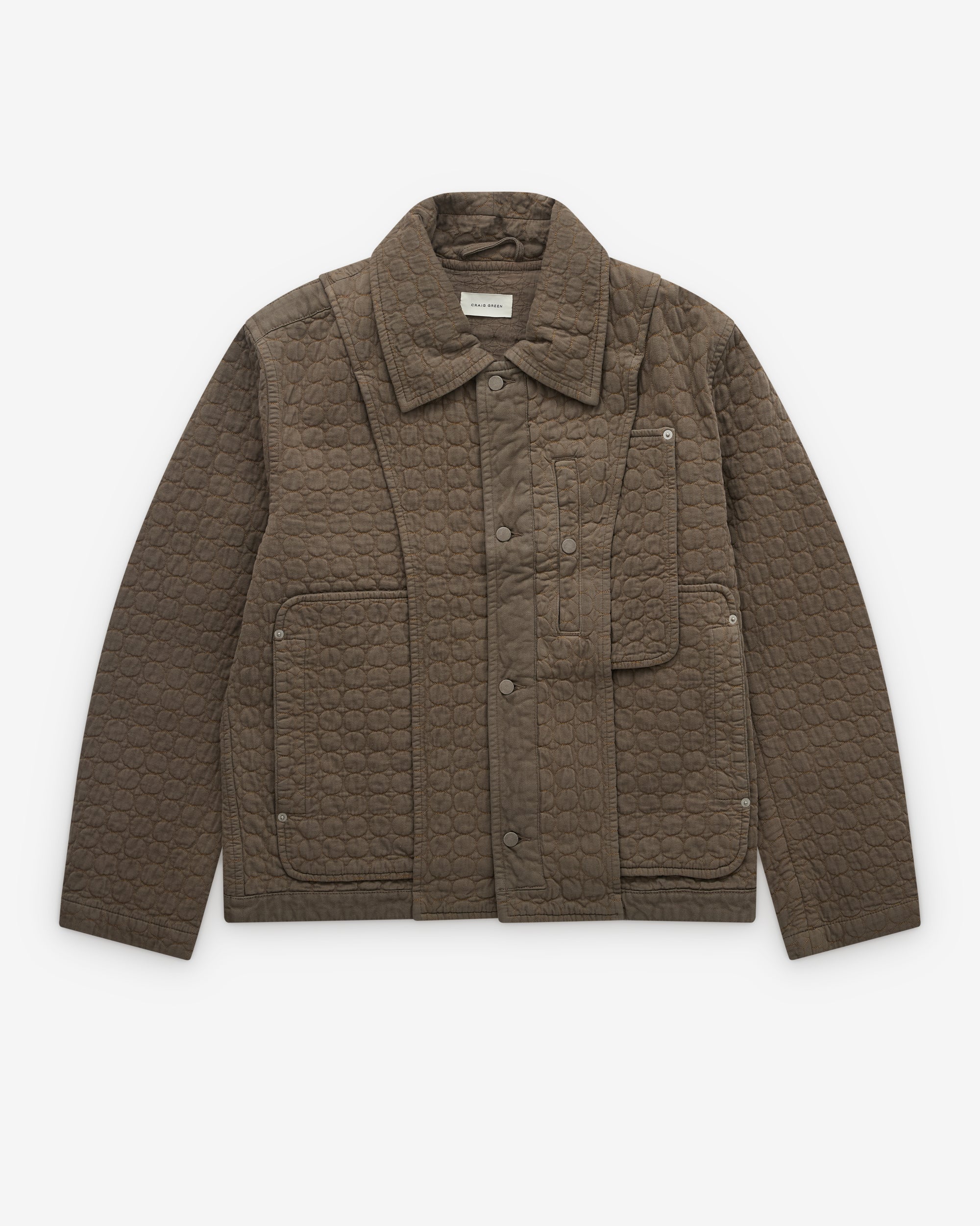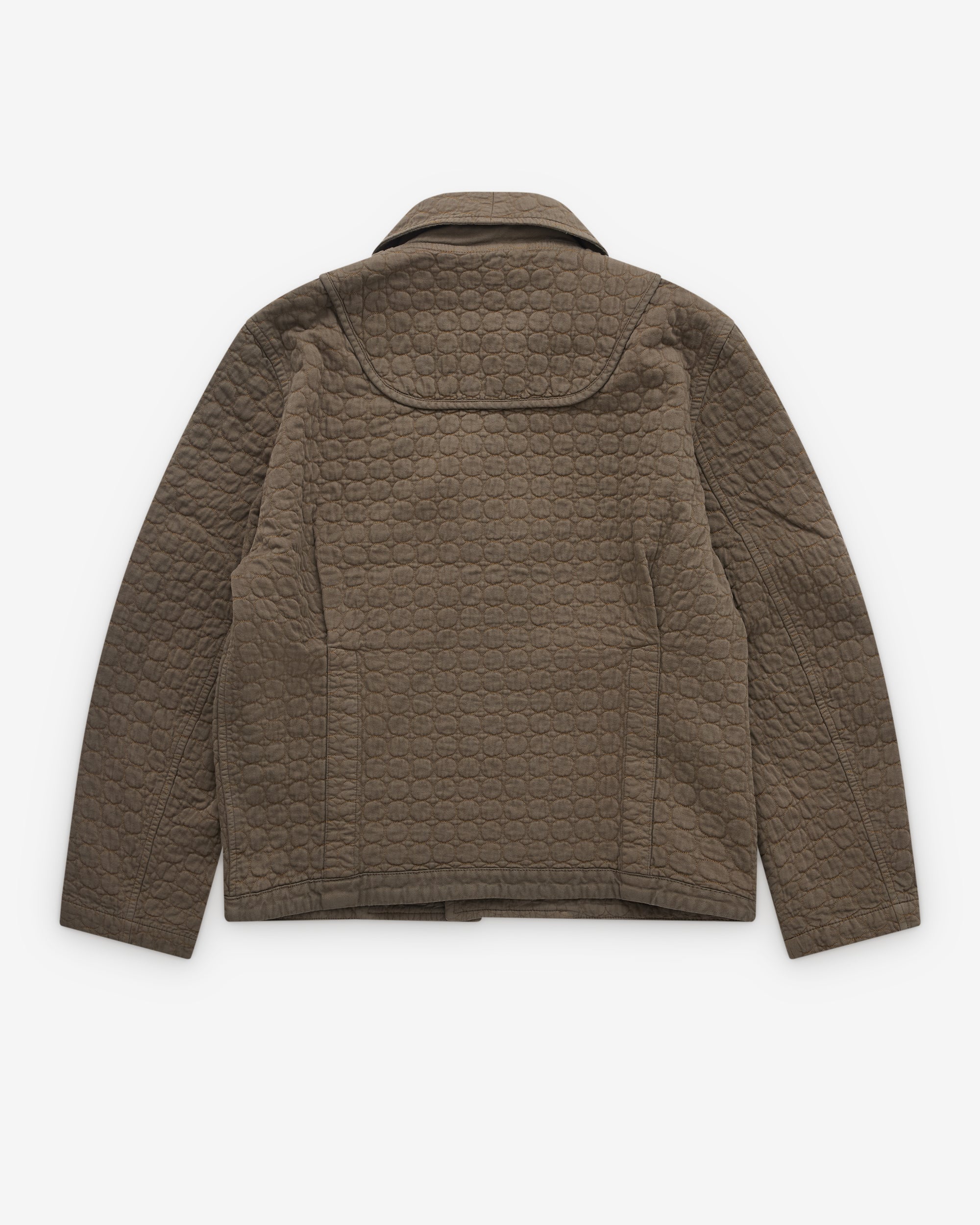 Circle quilted fabricFront button closureClassic collarSlip pocketsMetal rivet details