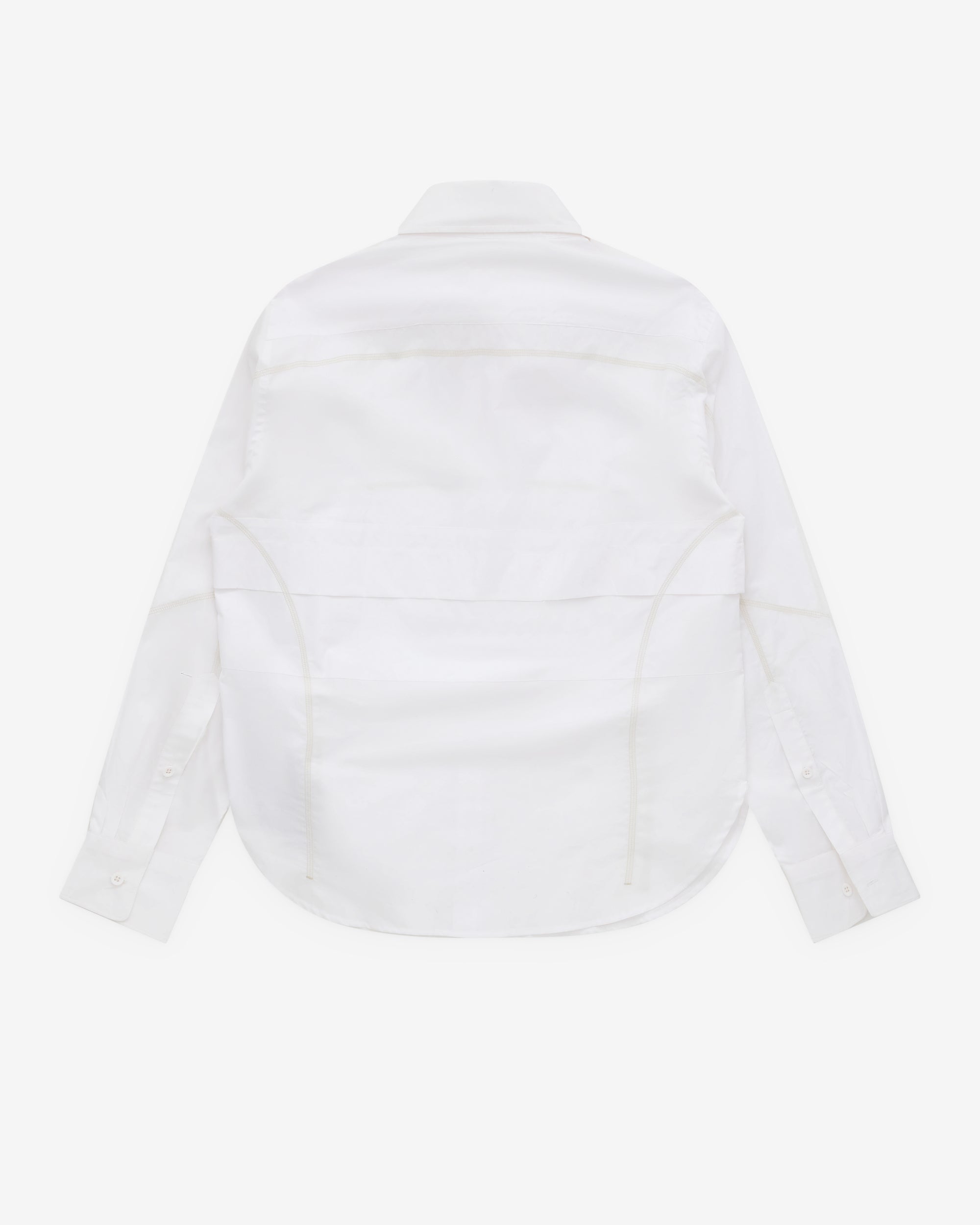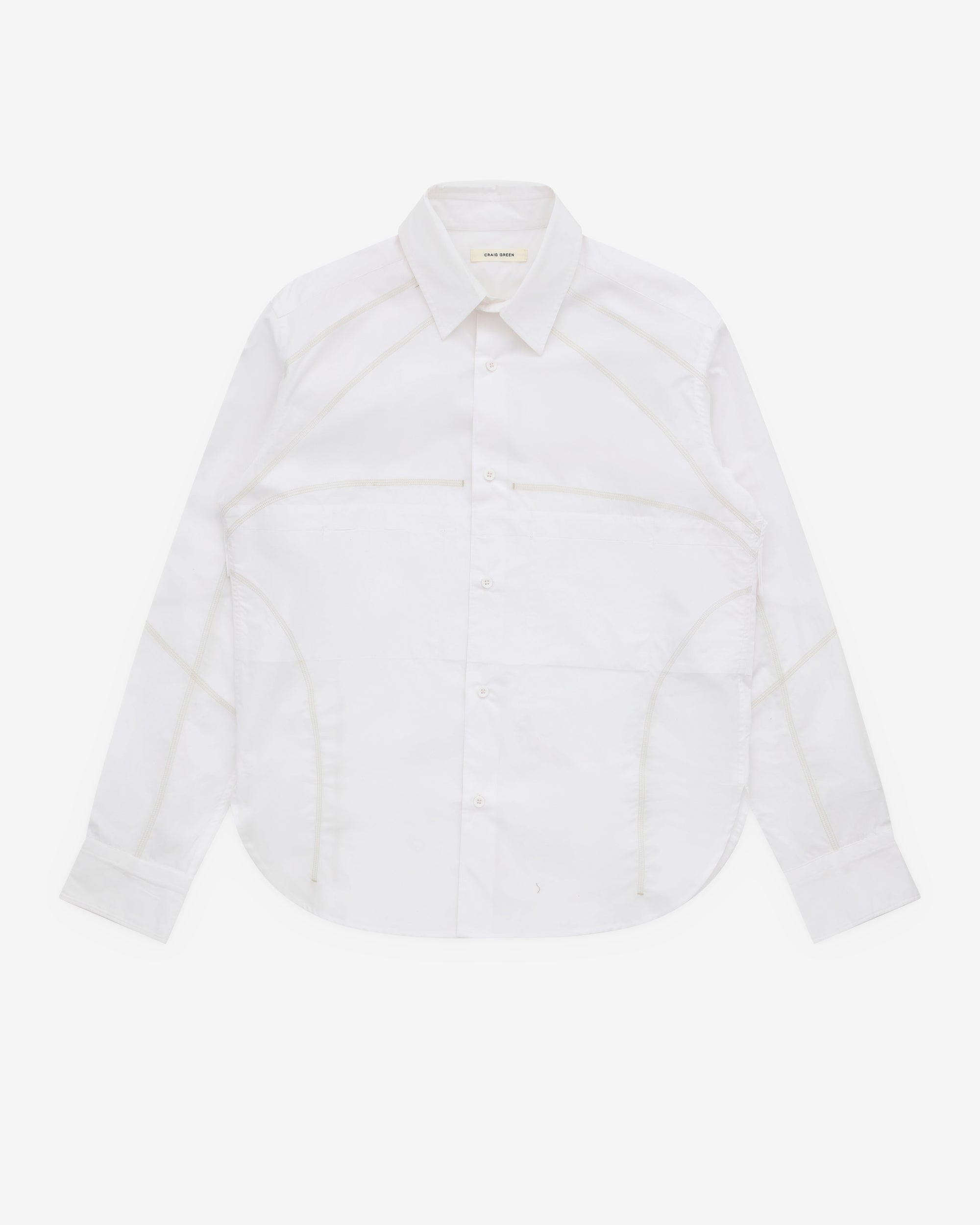 Point collarFront button closurePiping detail throughoutRounded hemButton close cuffs