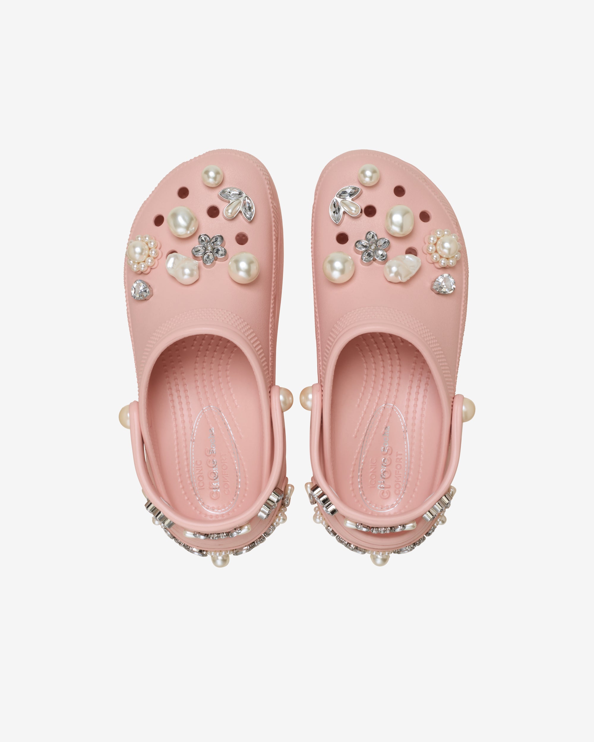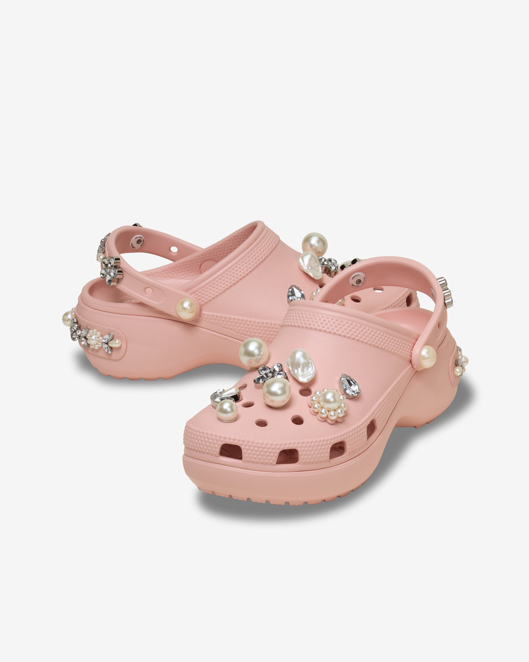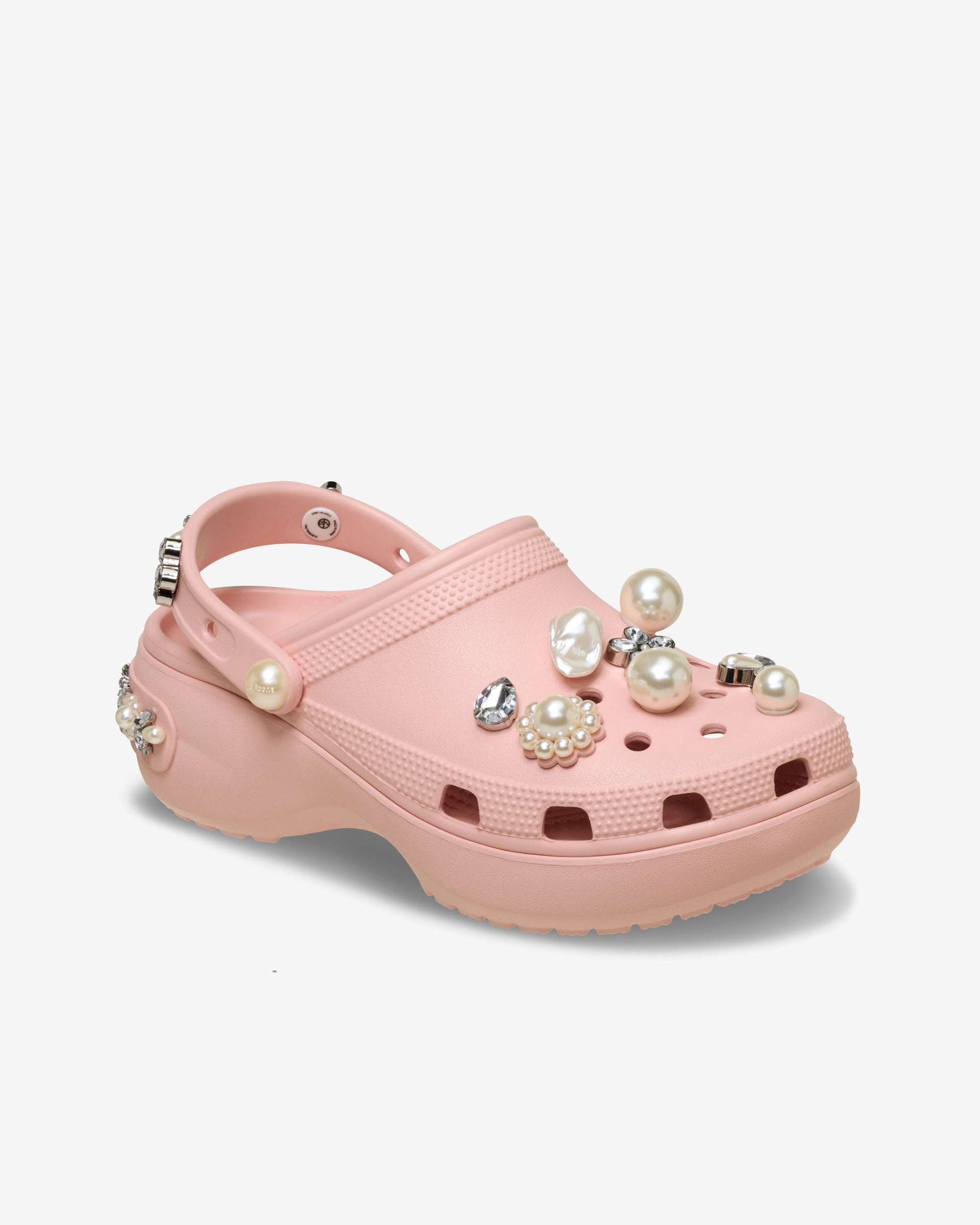 The Platform Clog is an elegant adaptation of an everyday classic. The clog is supported by a cushioned footbed and contoured outsole for comfort, while elevated by a platform sole for style. Adorned with Simone Rocha’s signature embellishments, this stunning style shines with dazzling gemstones and drop pearl Jibbitz™ charms.