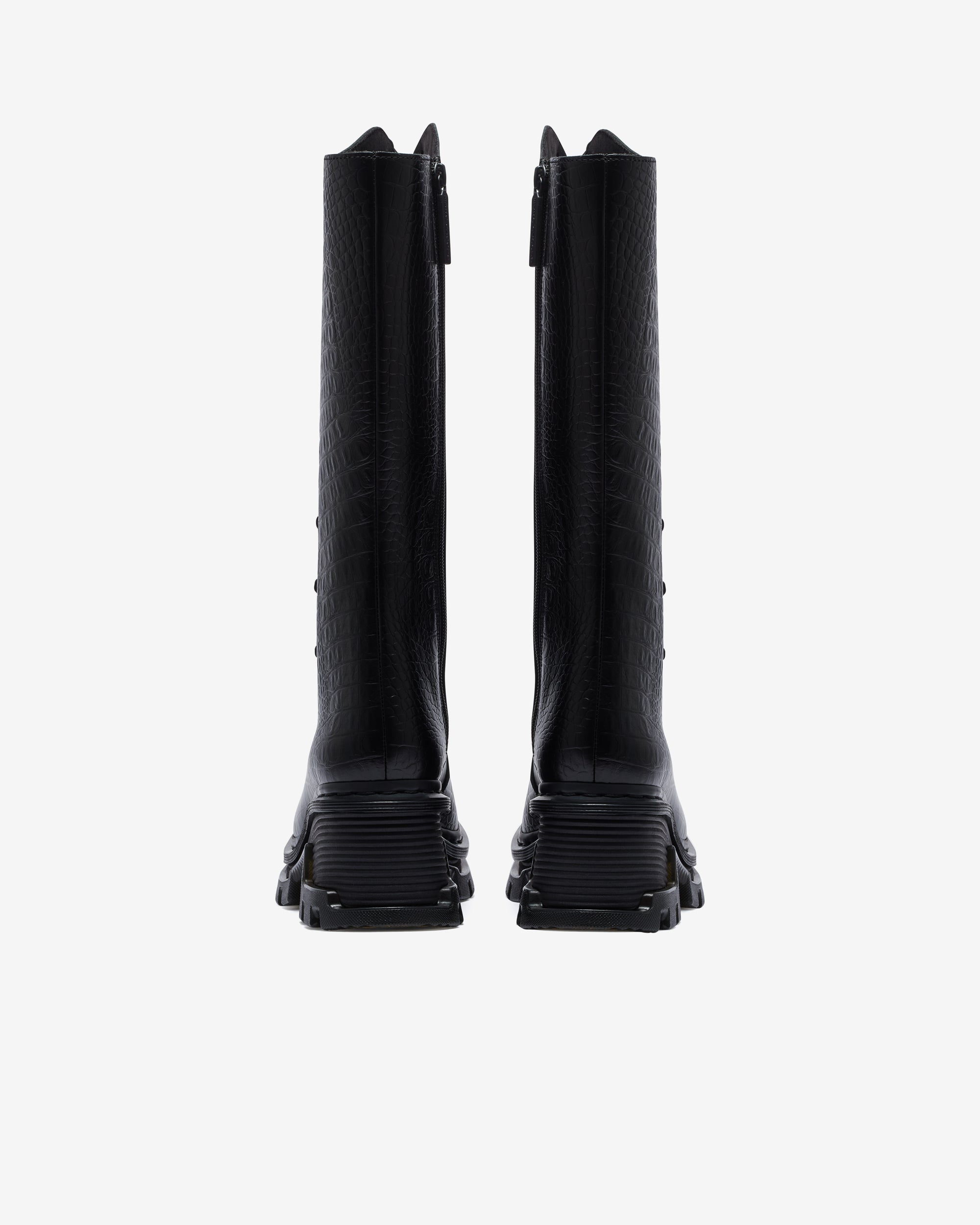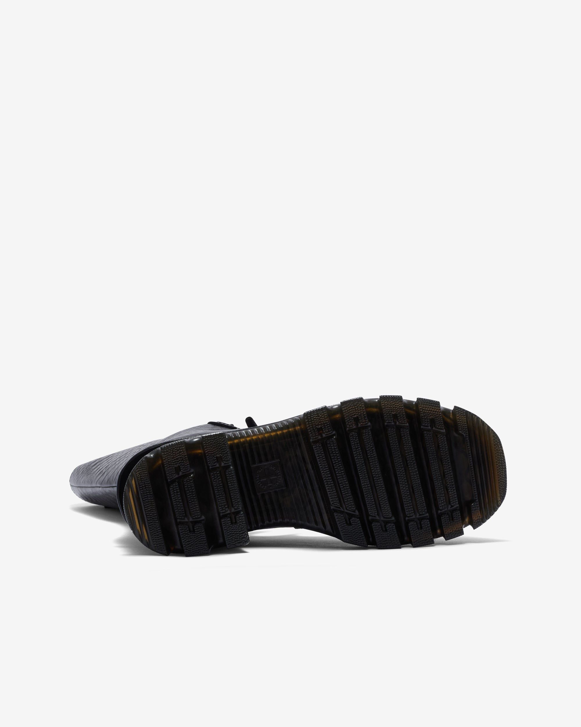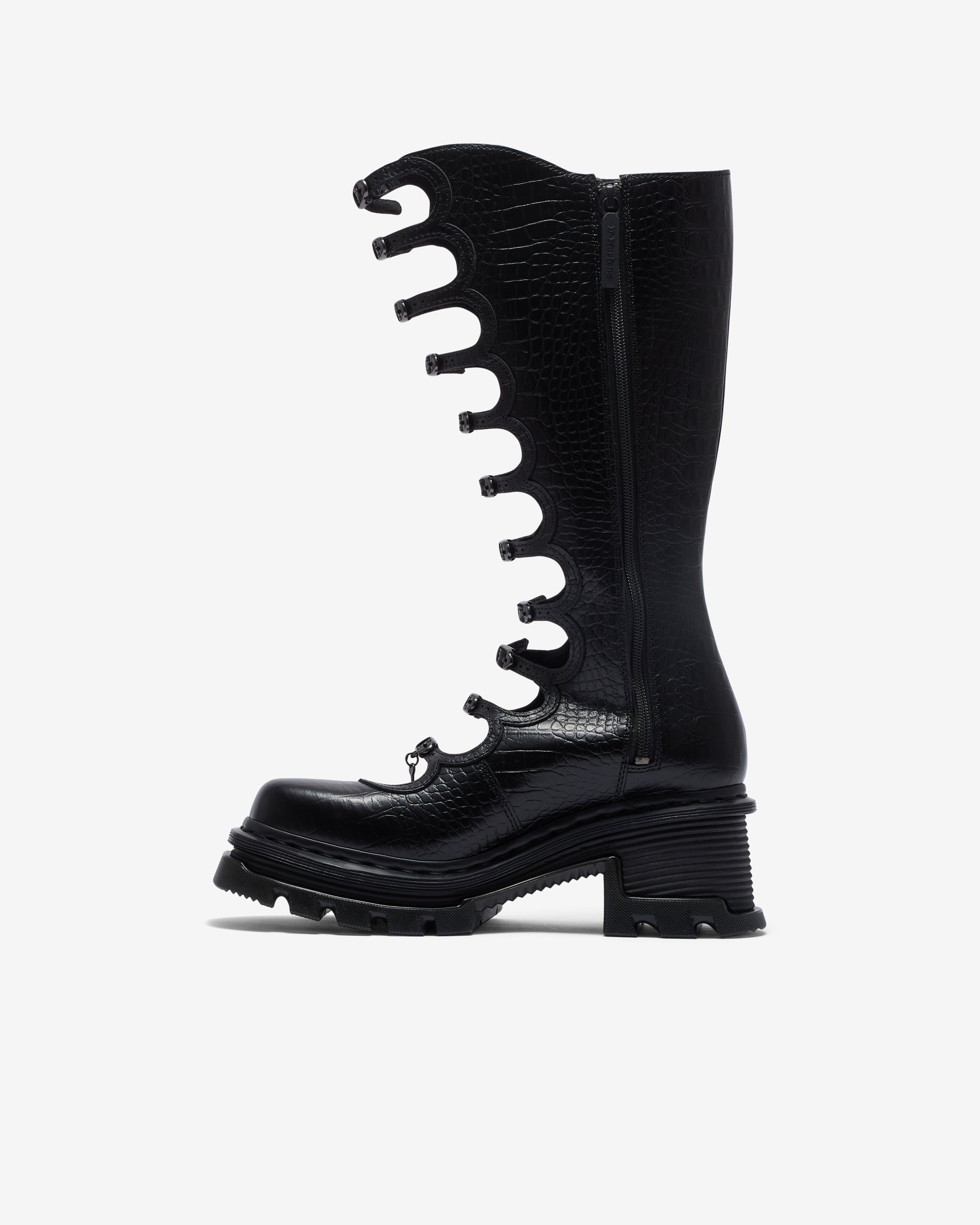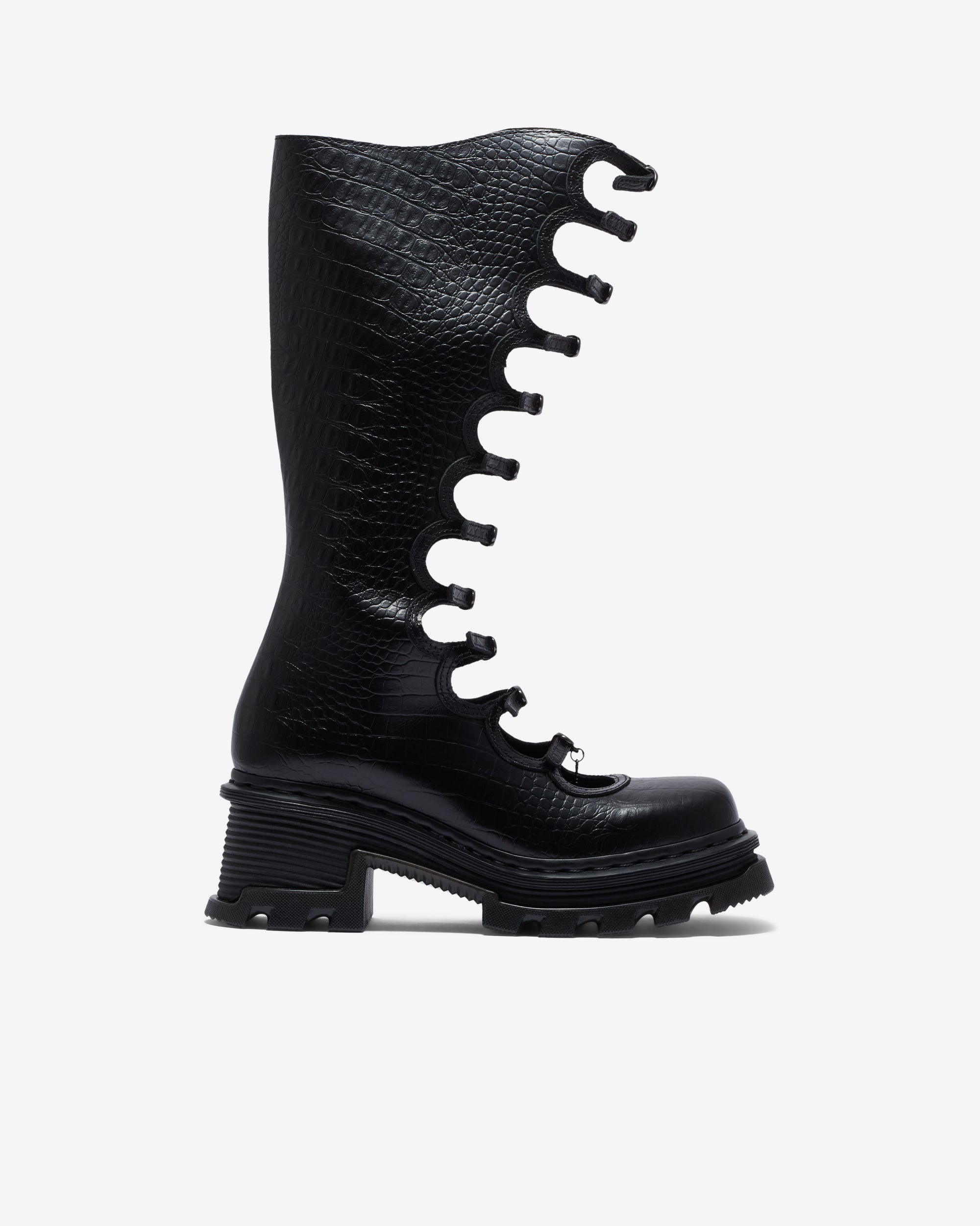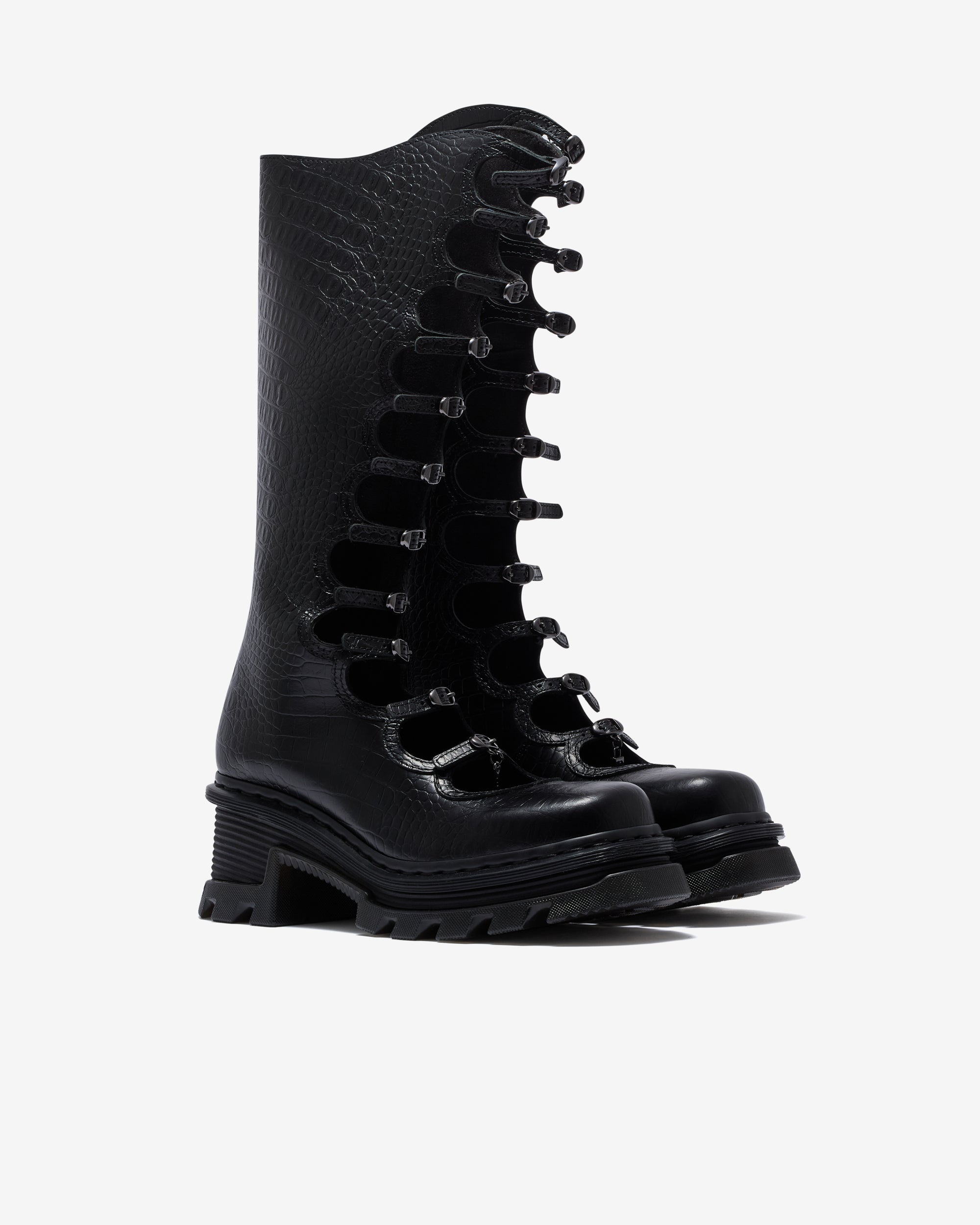 Collaboration between Dr. Martens and Marc JacobsMock croc leatherMulti-buckle fasteningYellow welt stitchingExaggerated cleated sole
