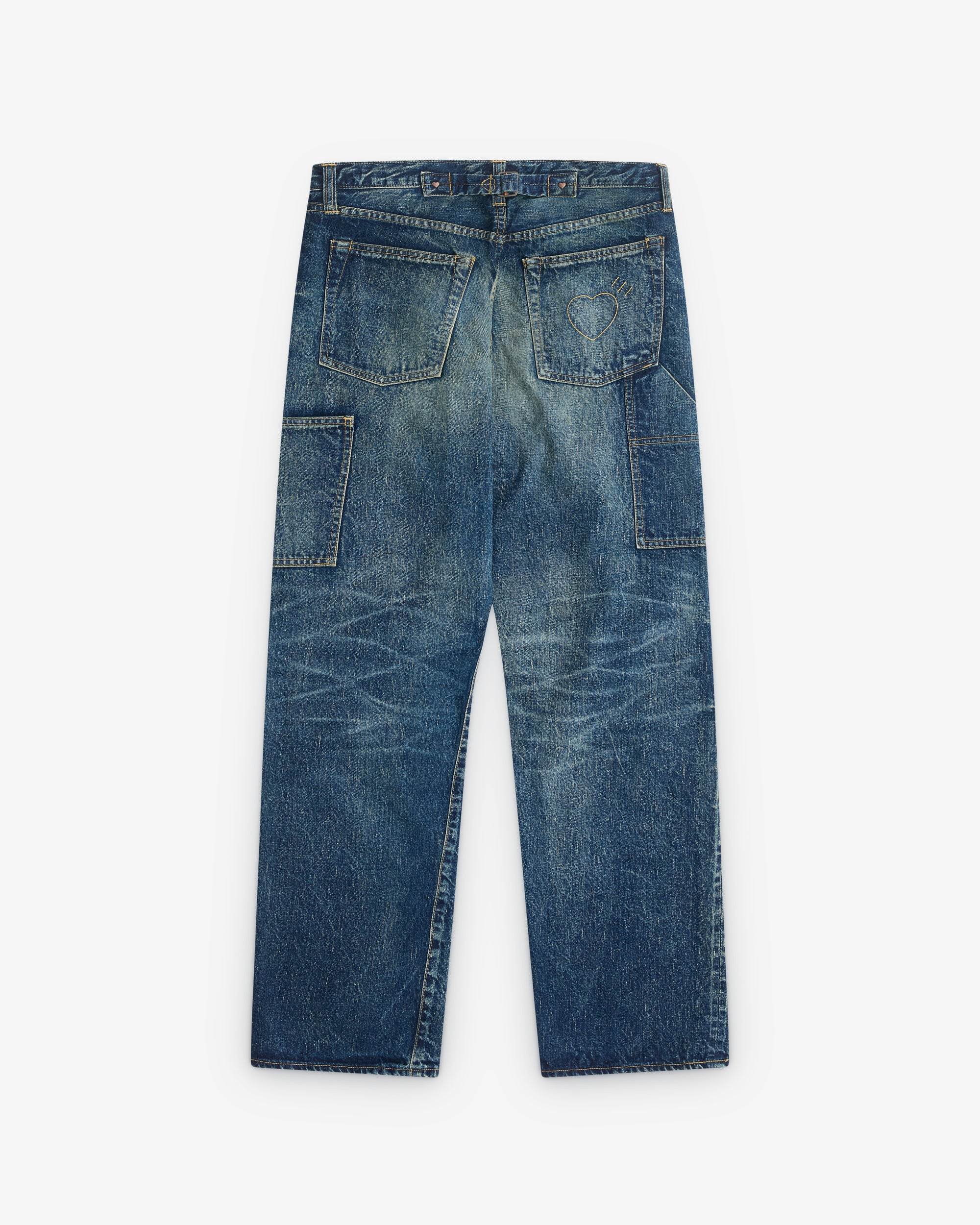 Straight legButton waist closure5 pocket constructionEmbroidered graphicsCargo leg pocketsAged washed denim