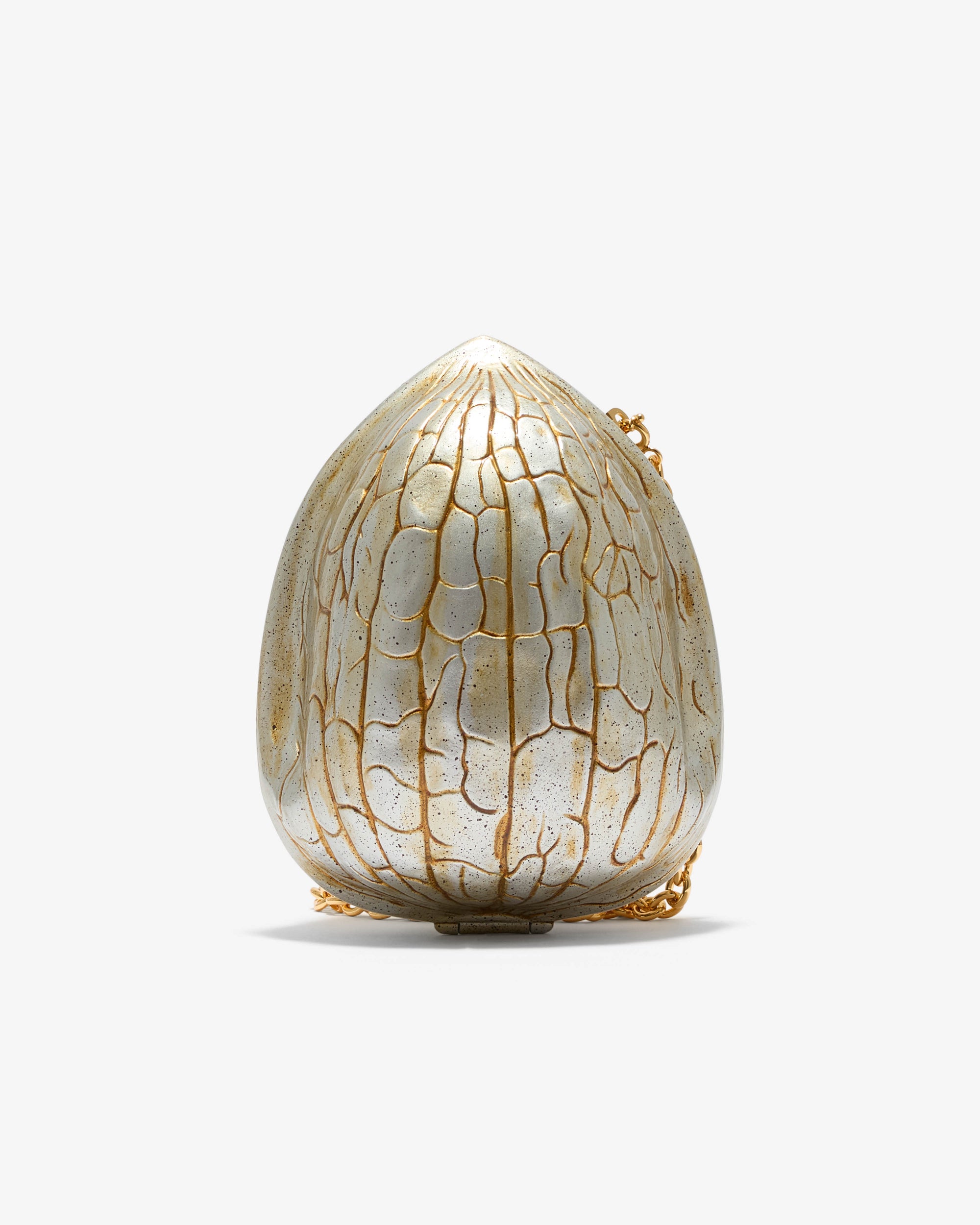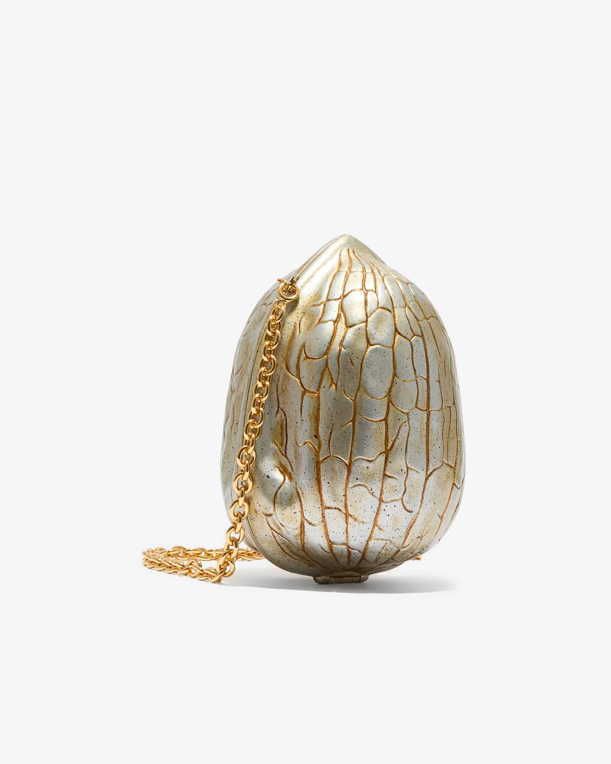 Walnut shaped clutch bag in patina gold-toned resin with special aged effect