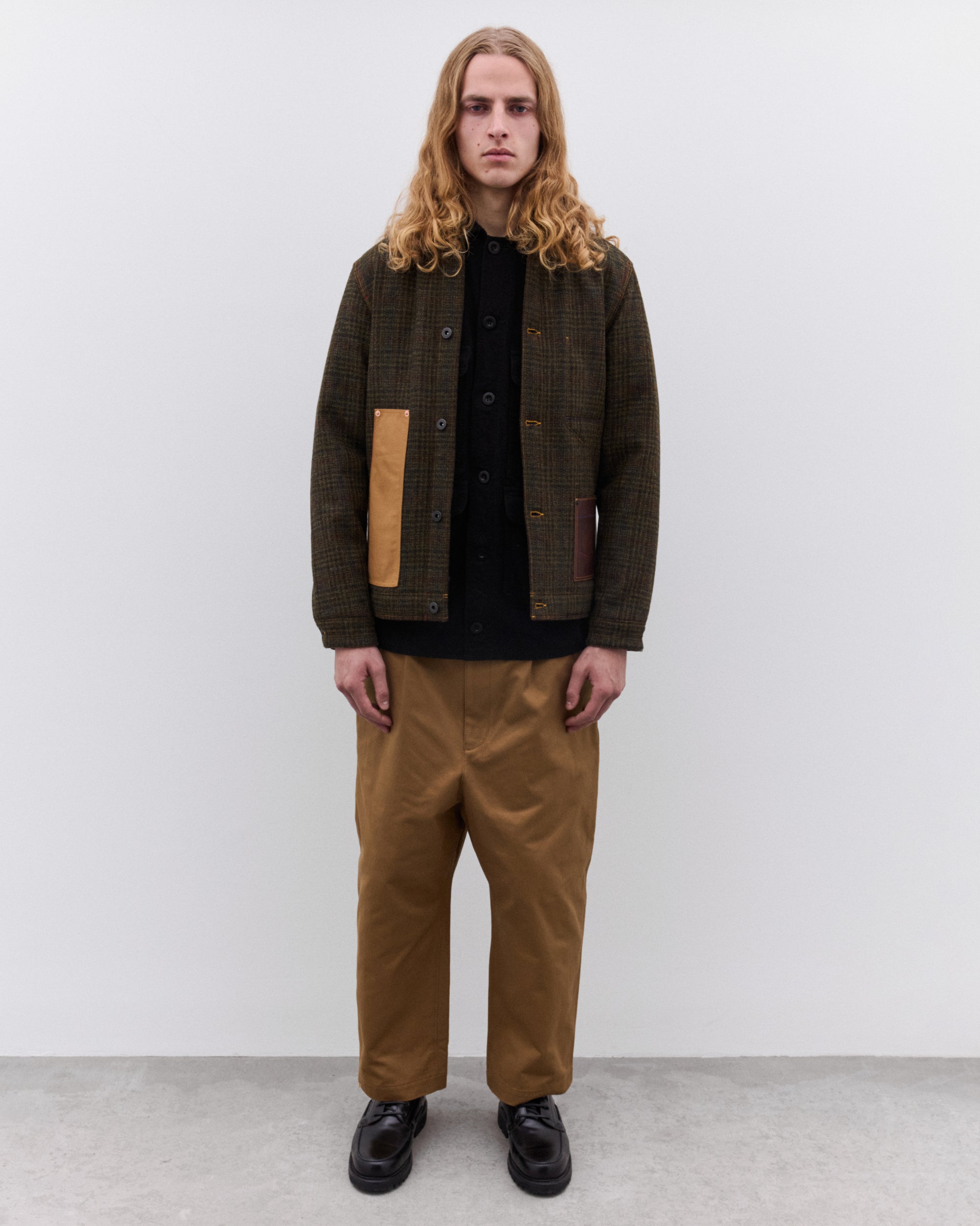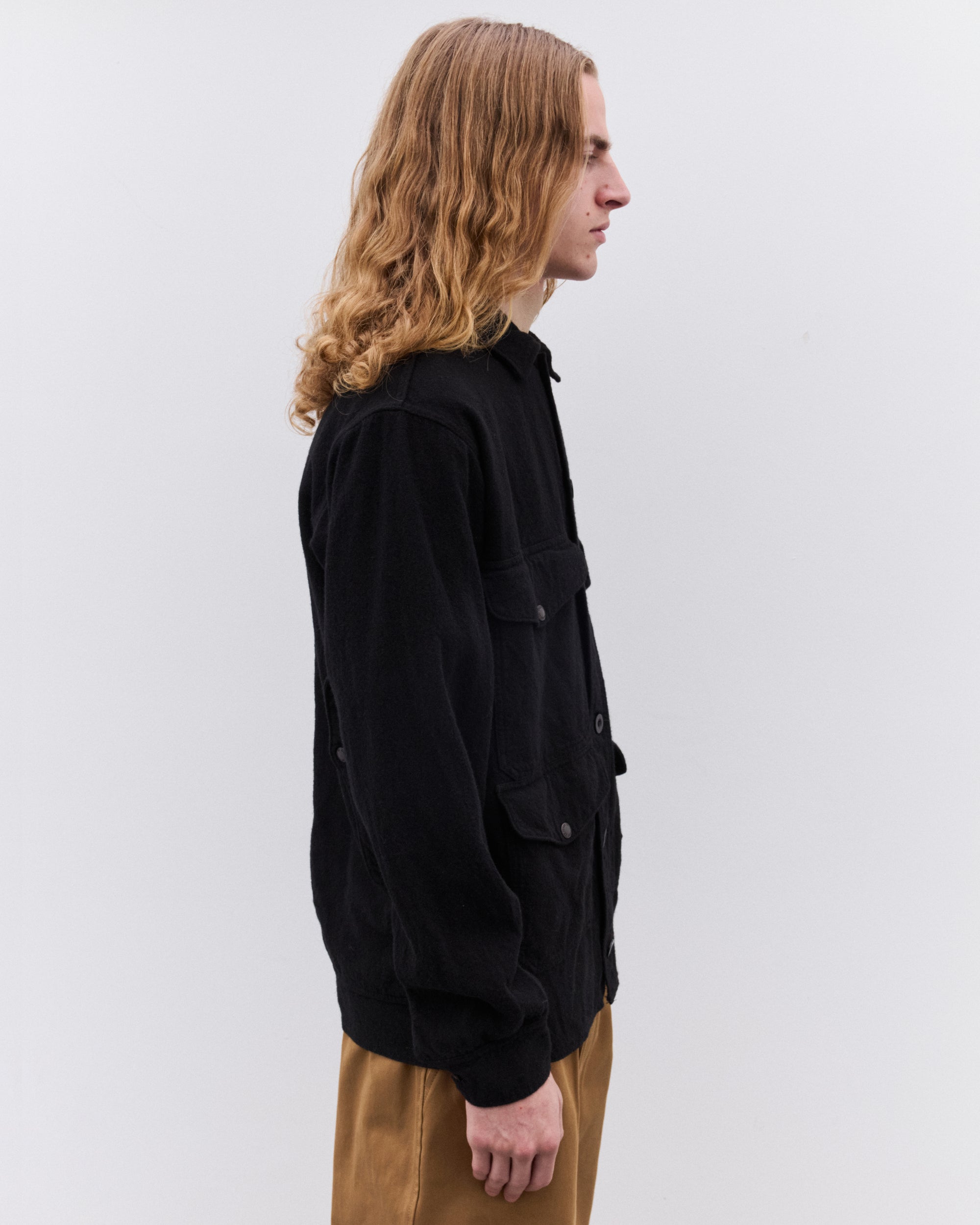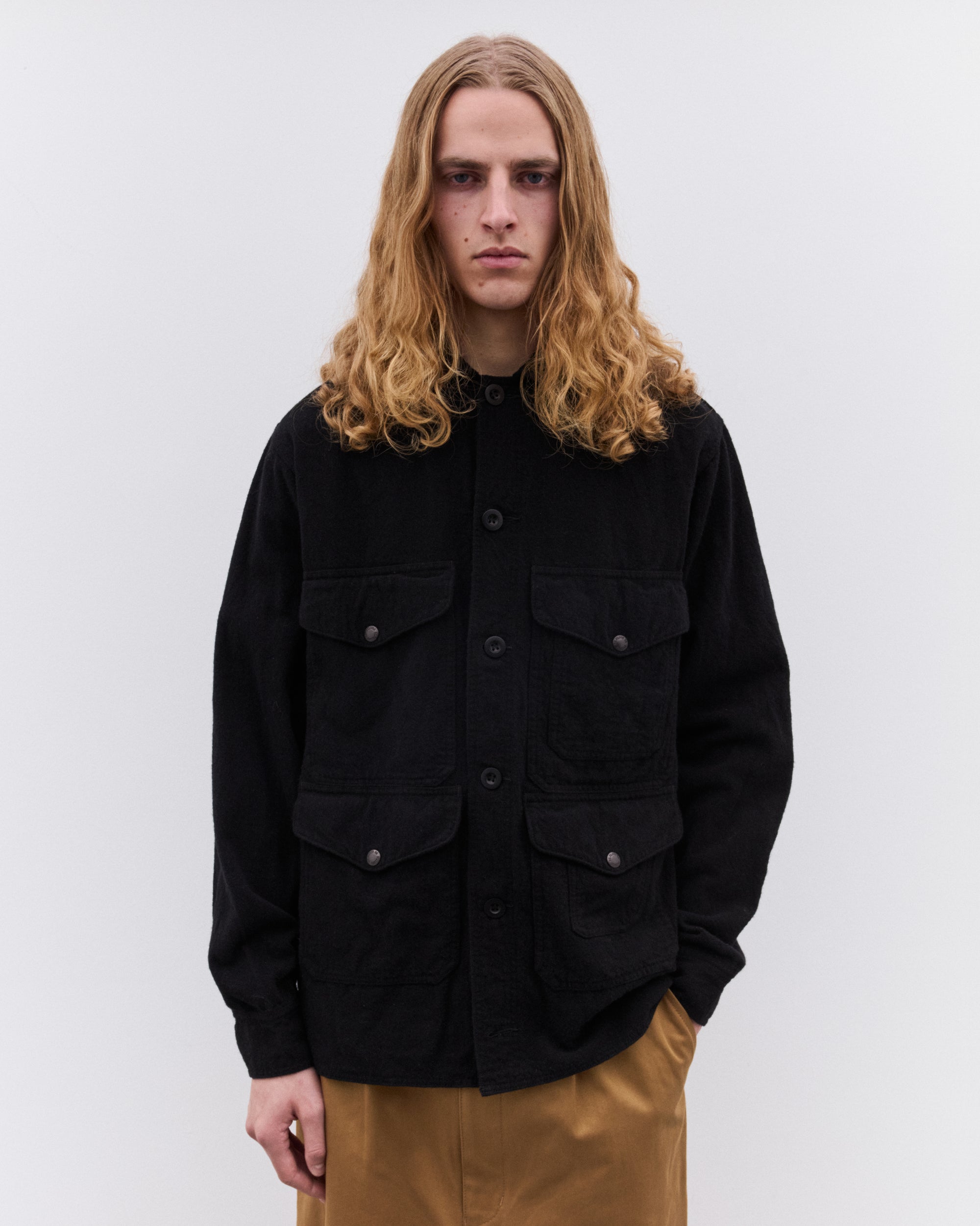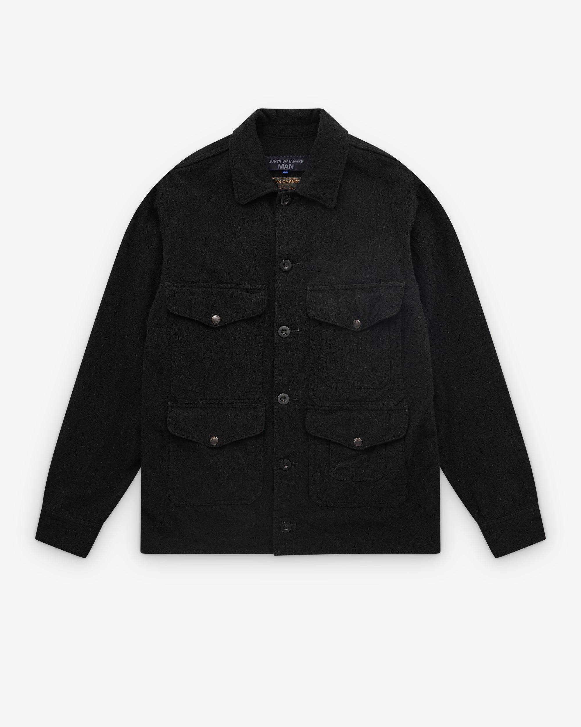 Made in collaboration with FilsonContrast point collarButton placketFront flap pocketsGarment dyed60% Wool, 40% AcrylicMade in Japan