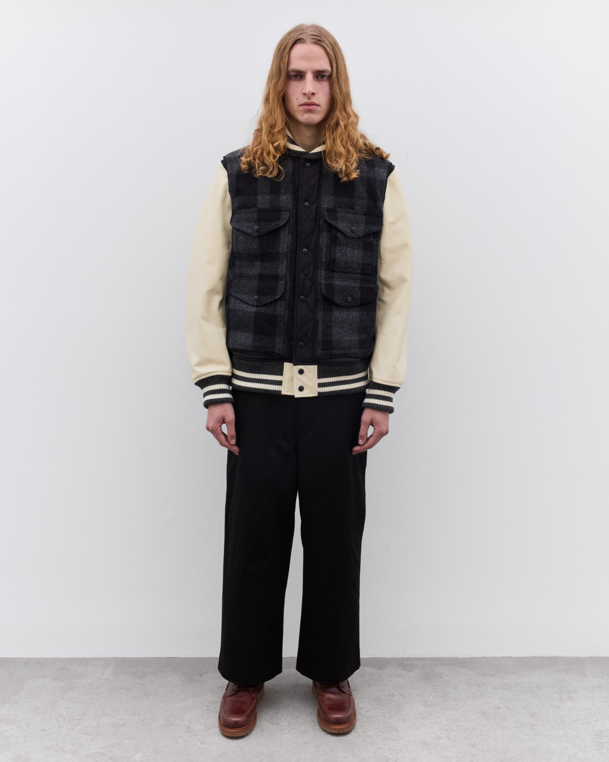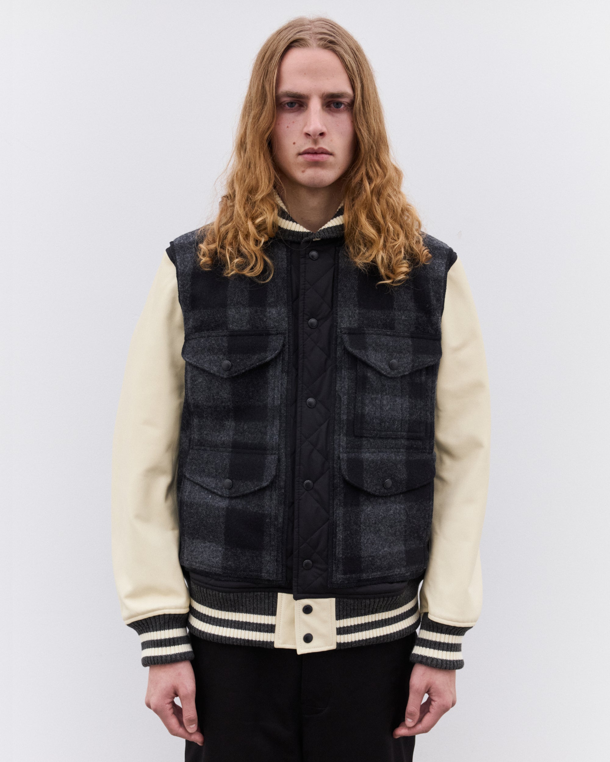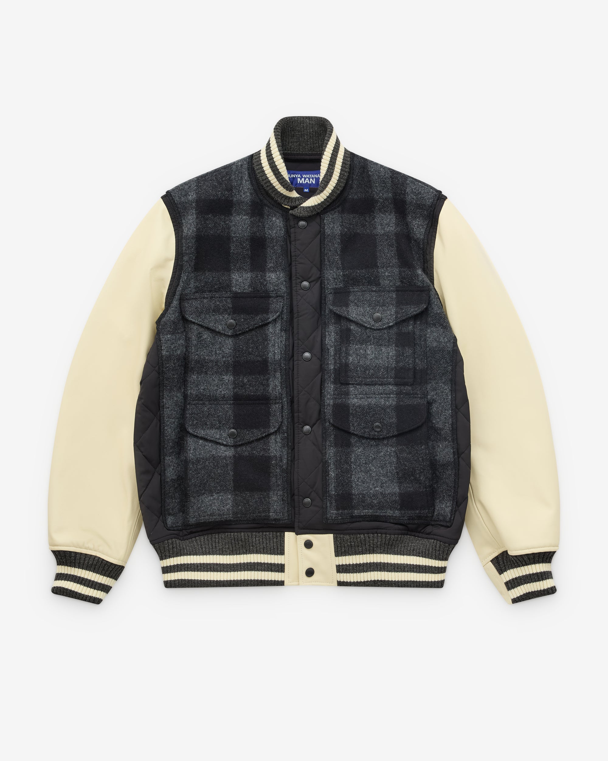 Check panelPress stud closureRib knit trimsLeather sleevesFront flap pockets100% Leather100% Polyester100% Cowhide