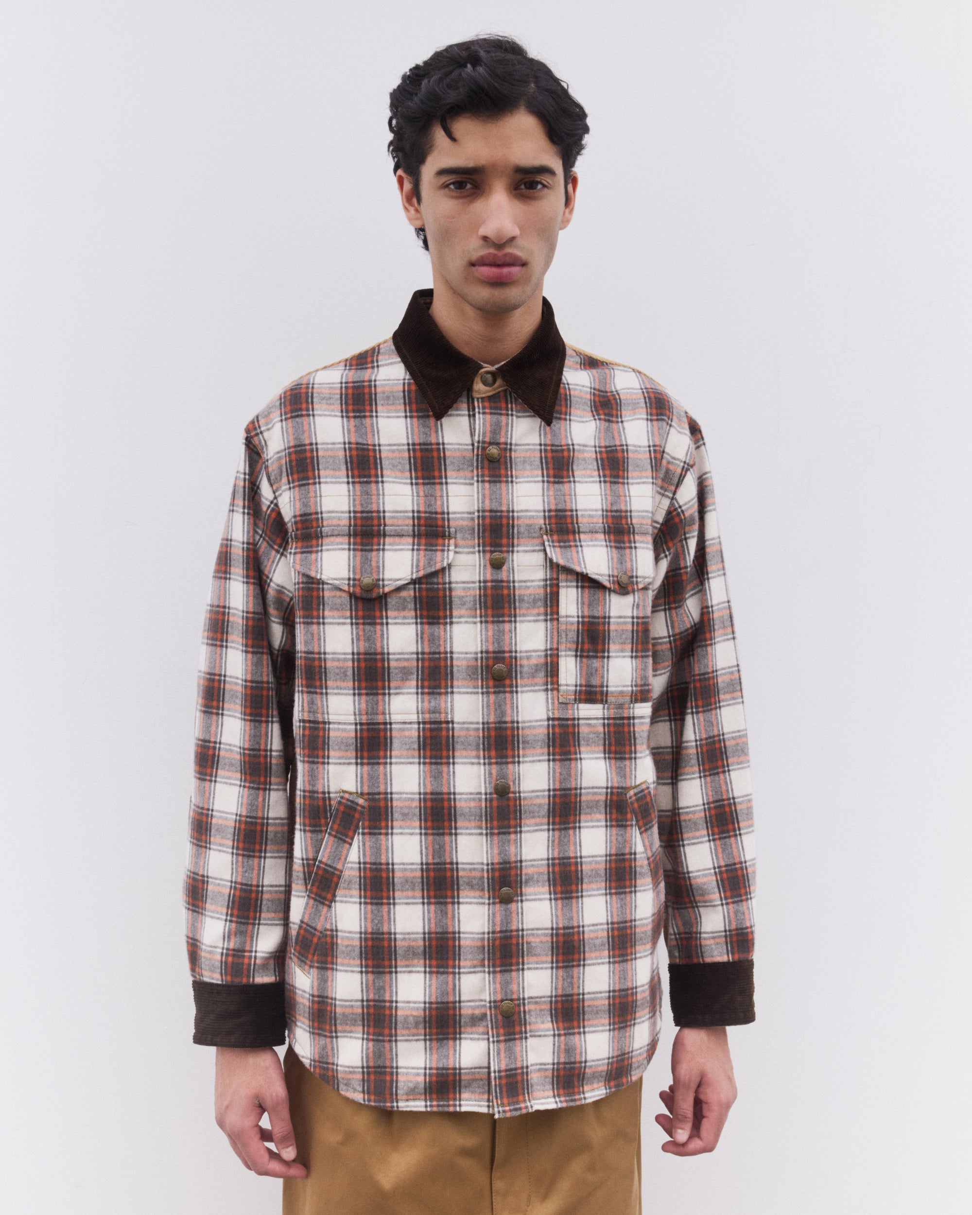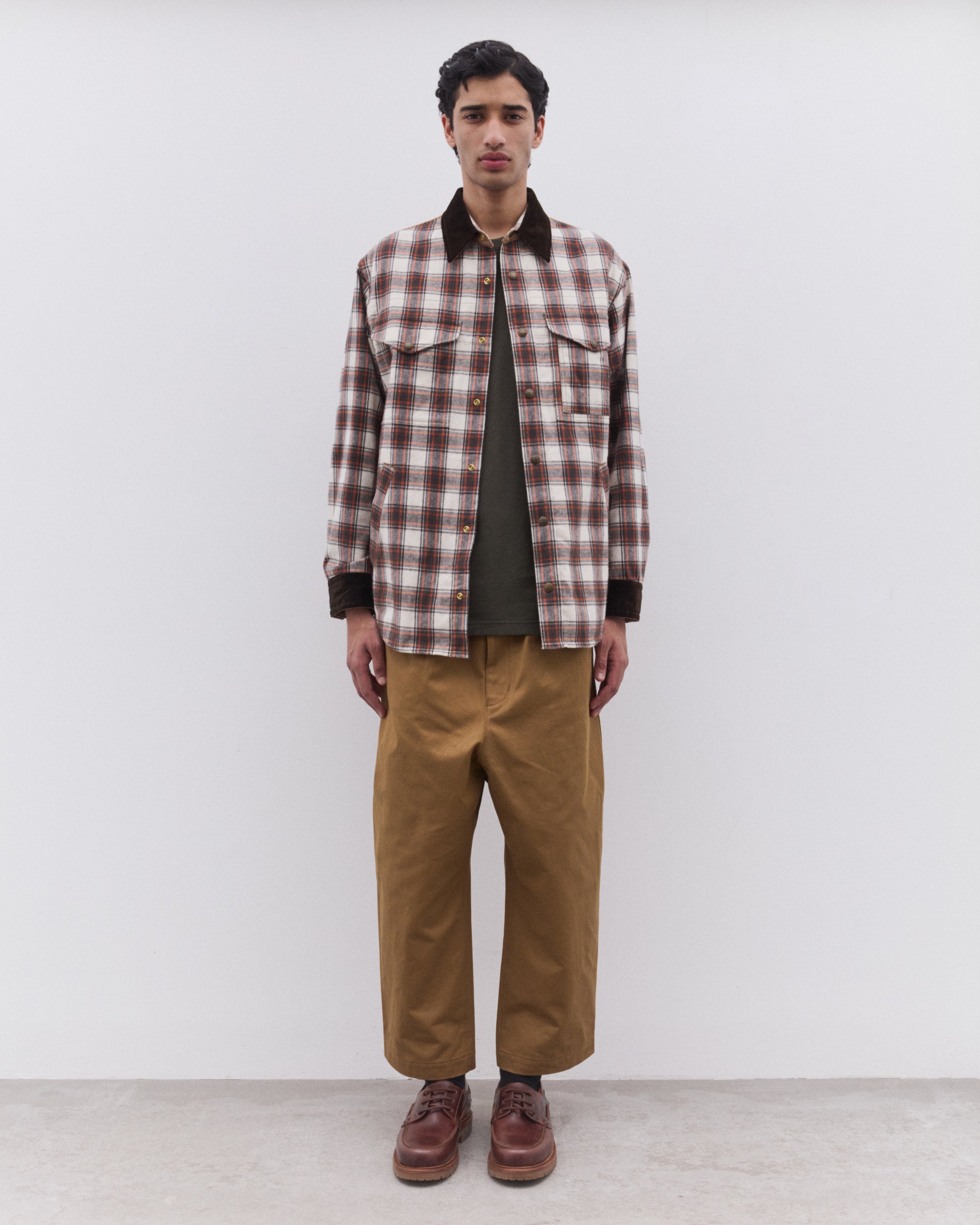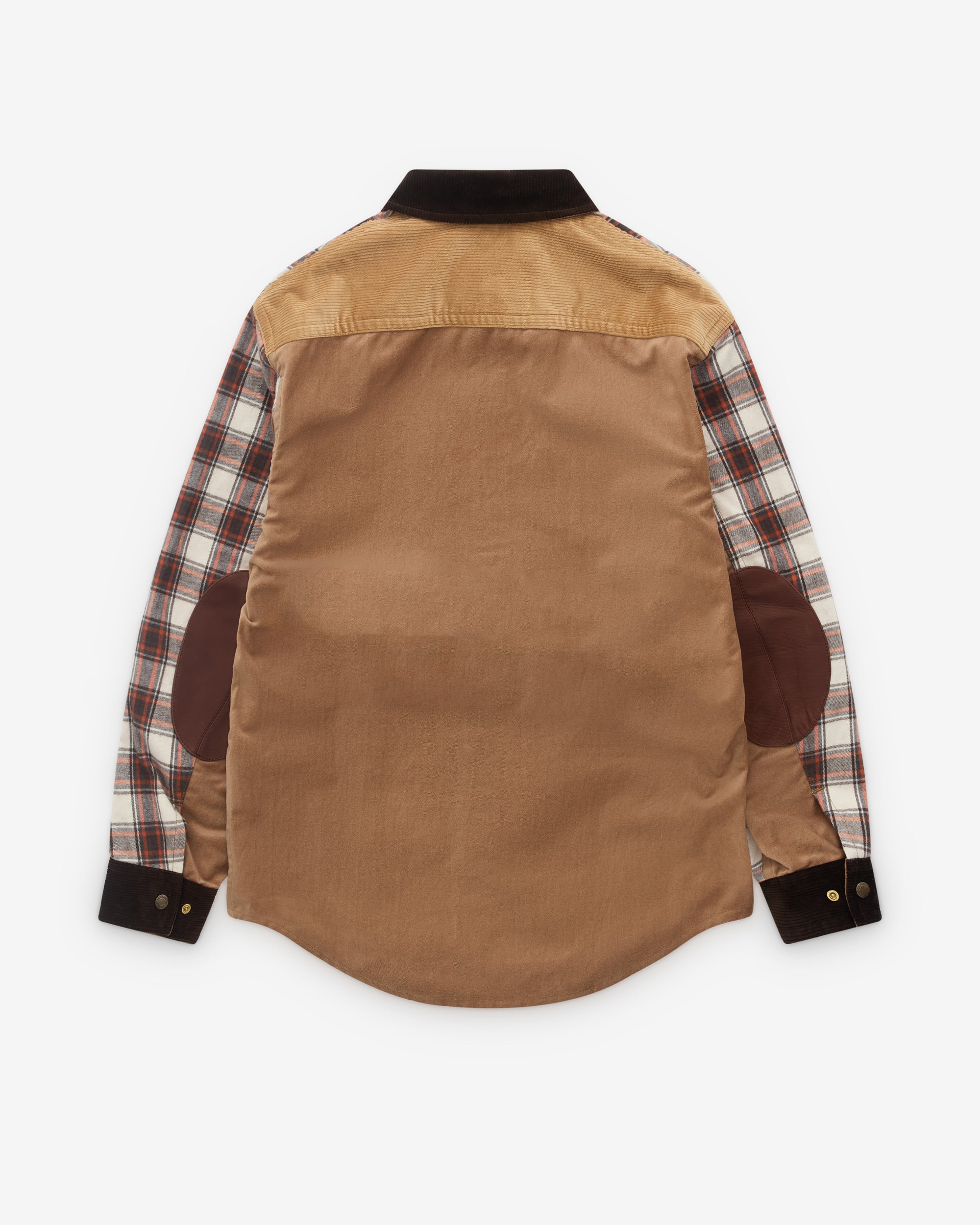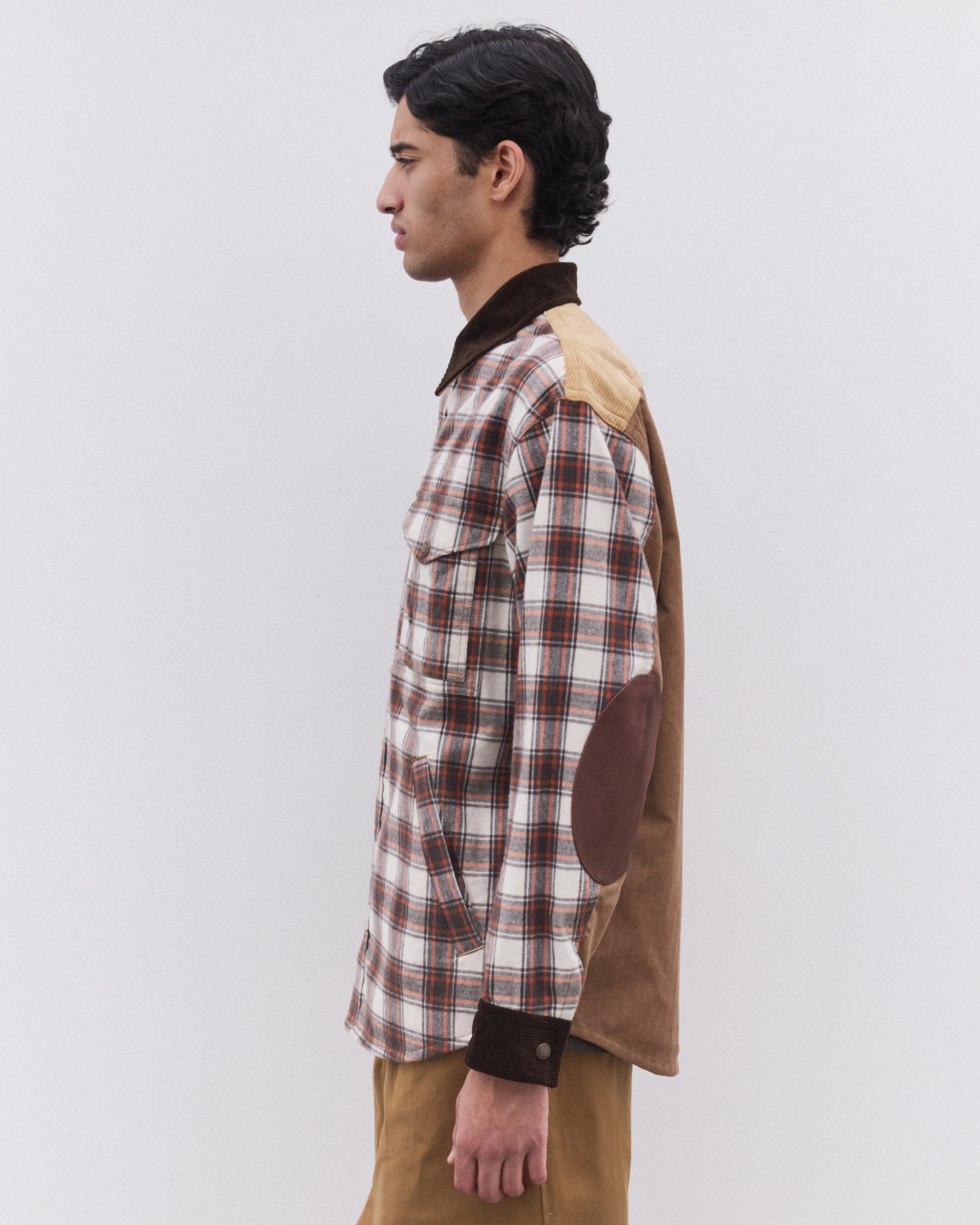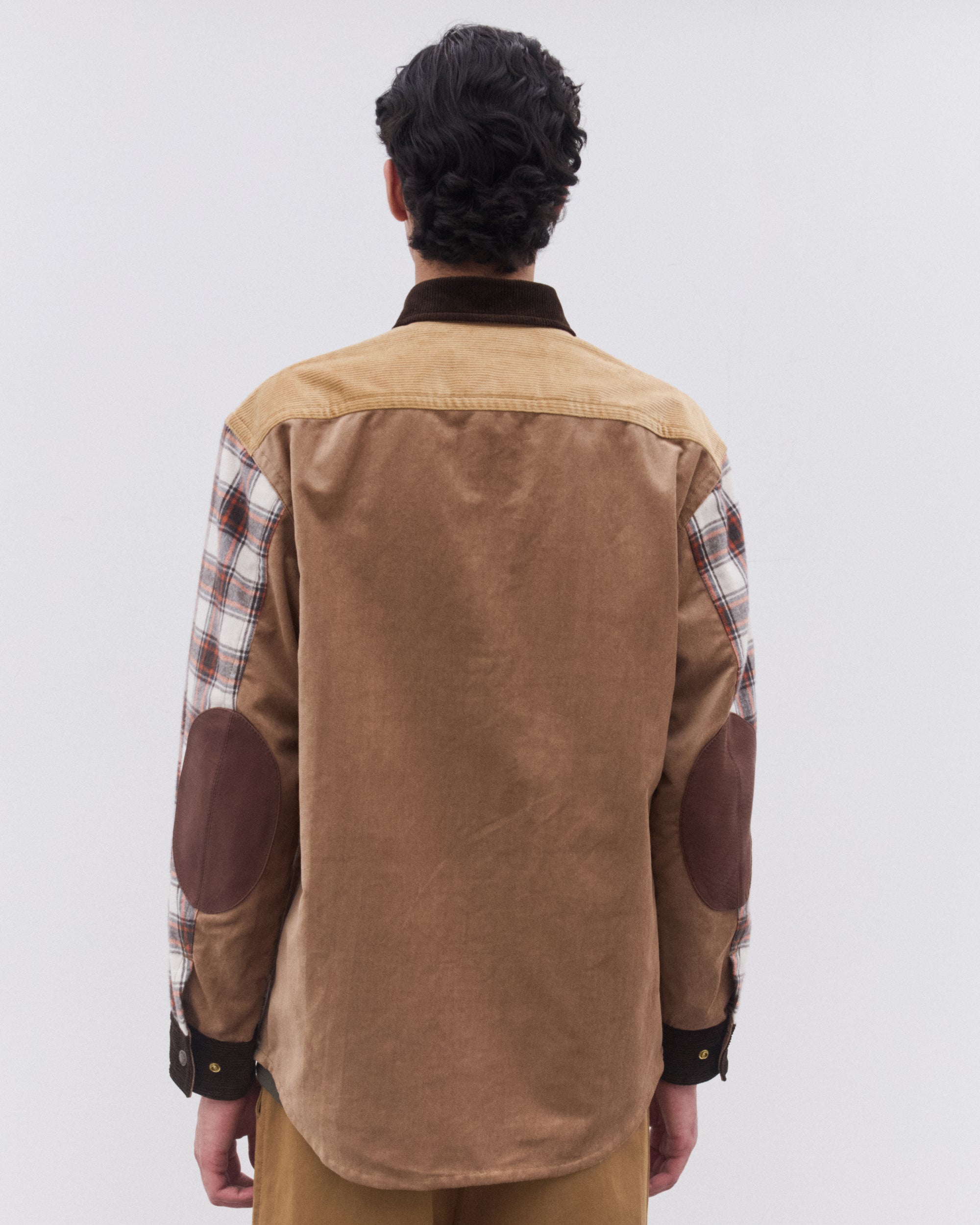 Point collarPress stud fasteningCurved hemFlap pocketsLeather elbow patchesCorduroy collar and cuffsRear brushed cotton panel