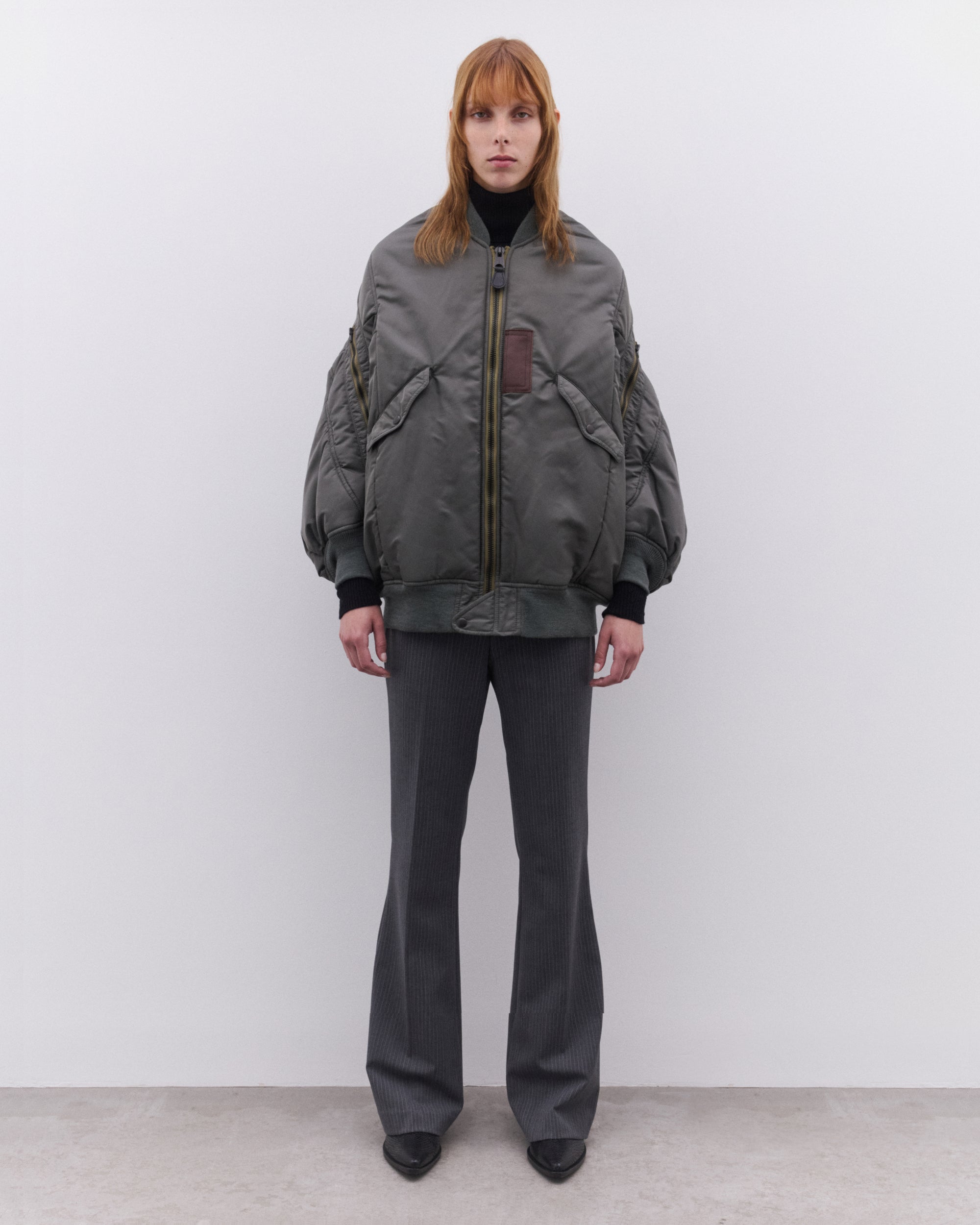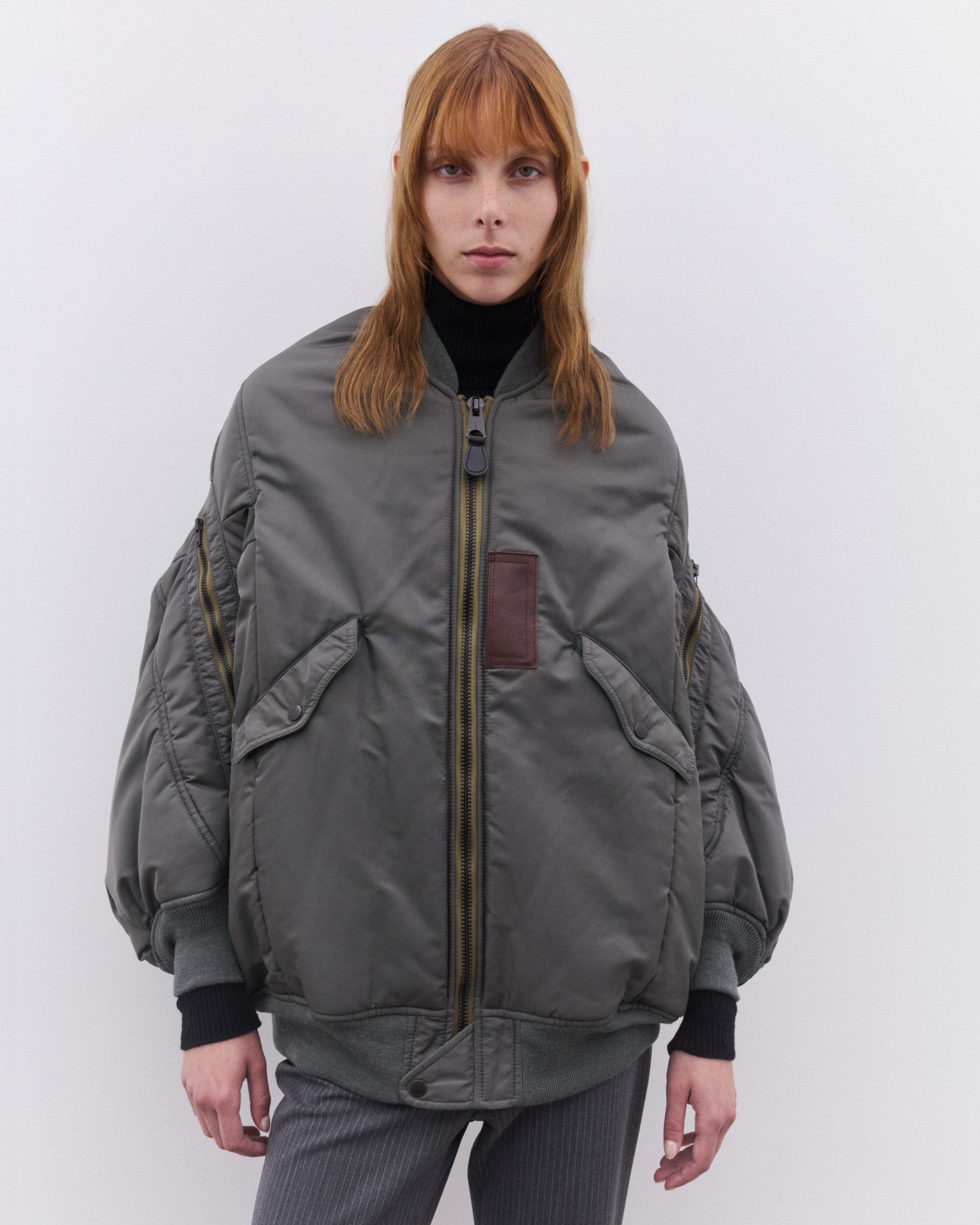 Rib knit trimsZip off sleevesDropped shoulderZip fasteningDouble press stud flap pocketsExaggerated fit100% NylonMade in Japan