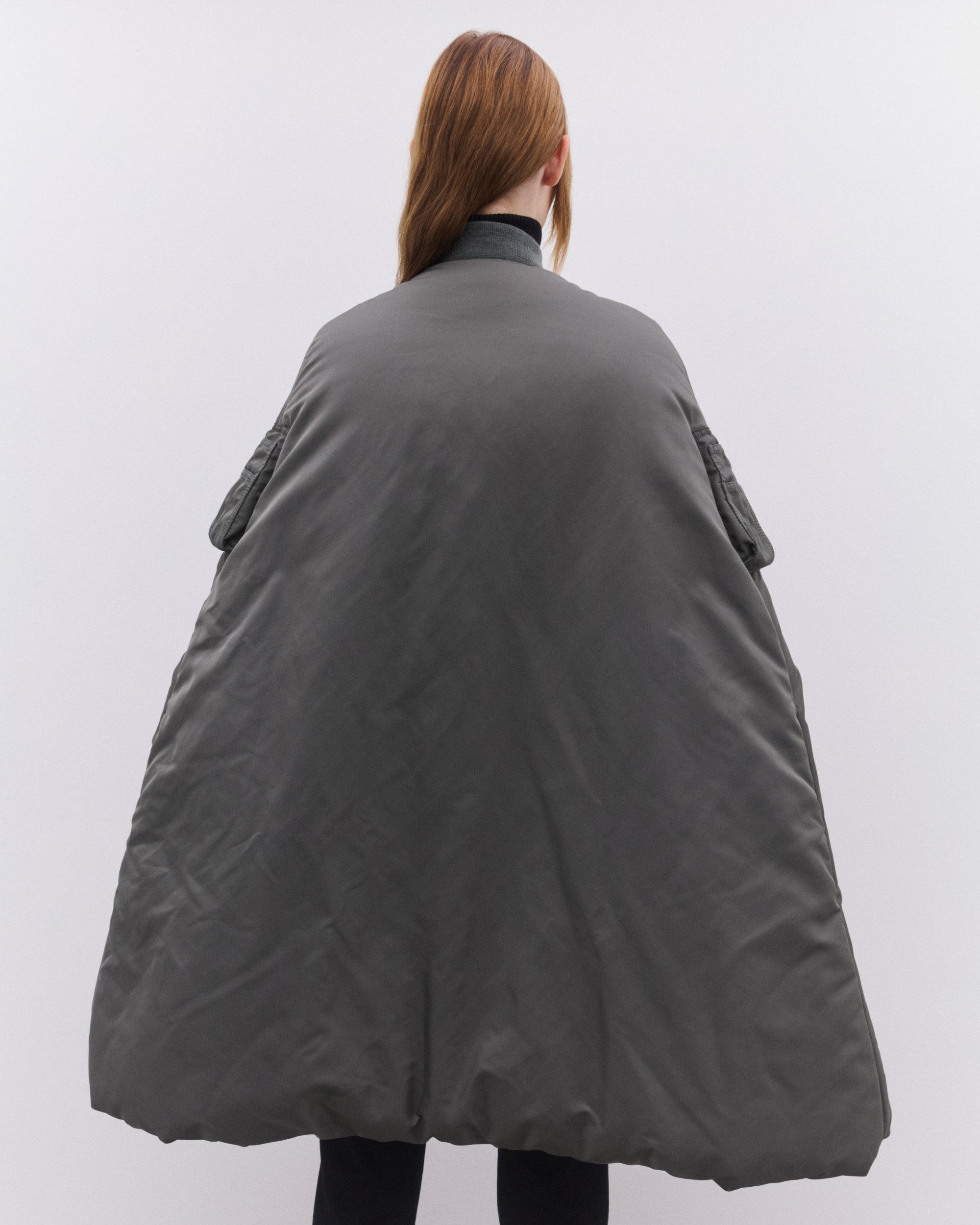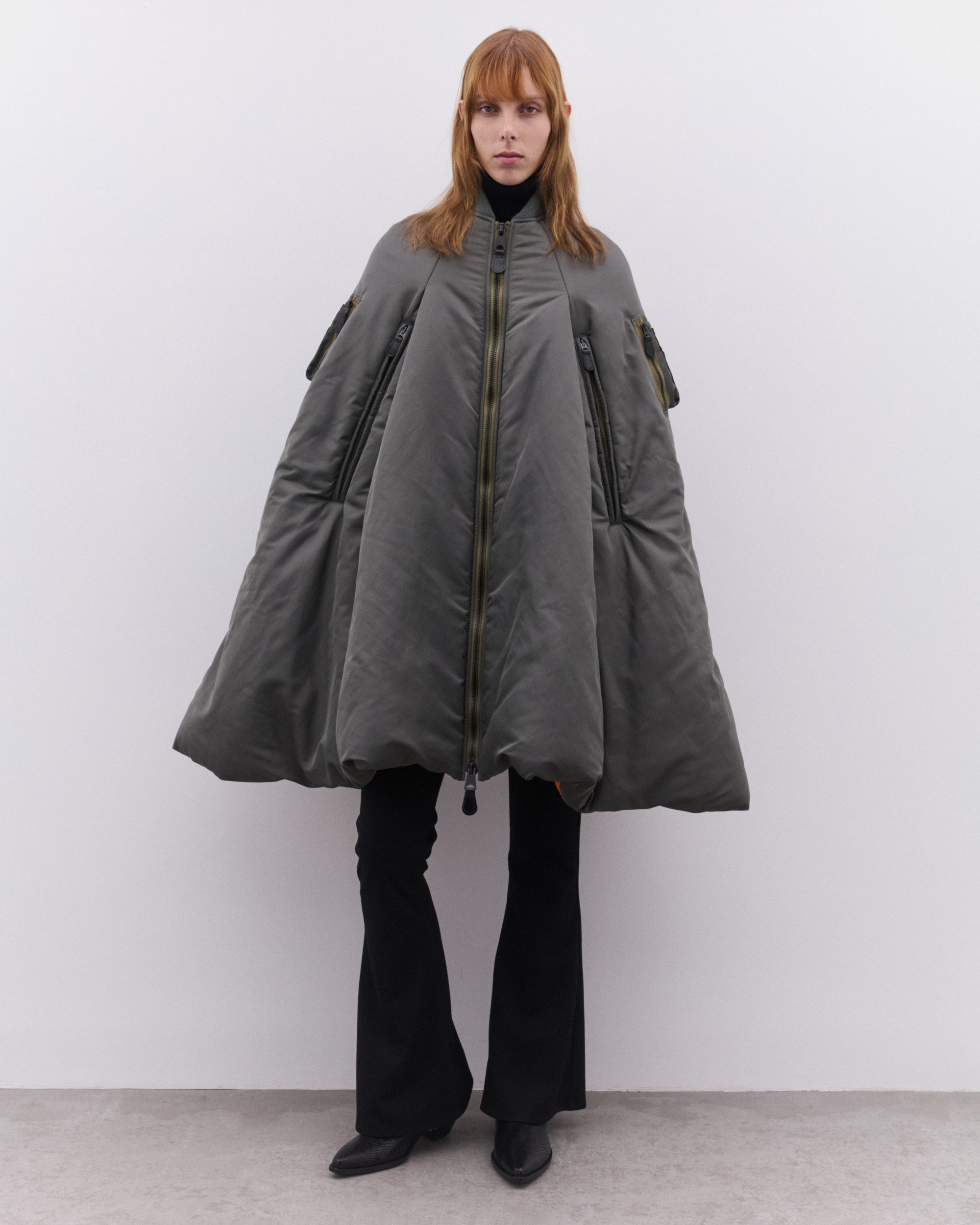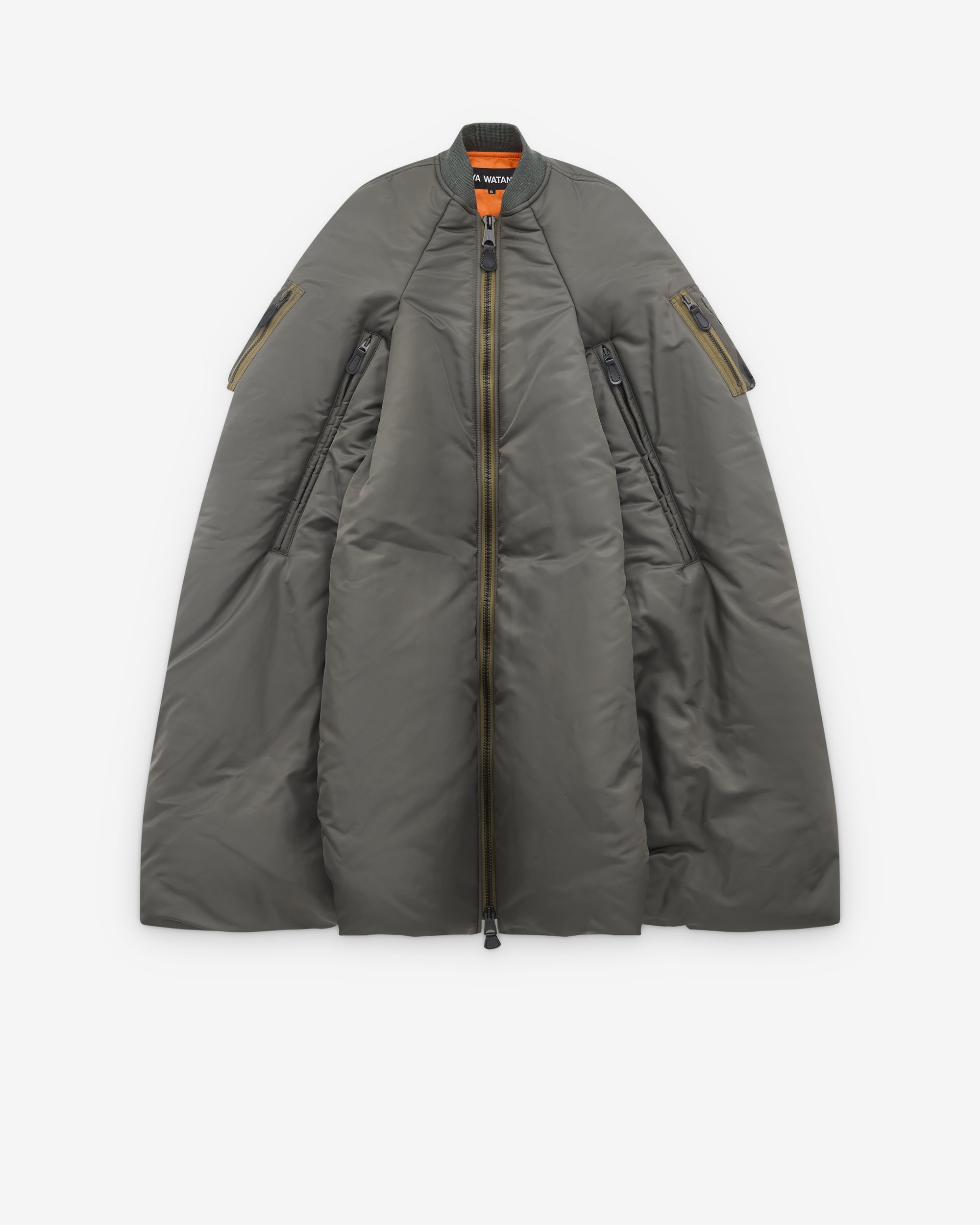 Rib knit trimsTwo-way zip fasteningZip armholesZip pockets at shouldersWaddedContrast liningLong-line