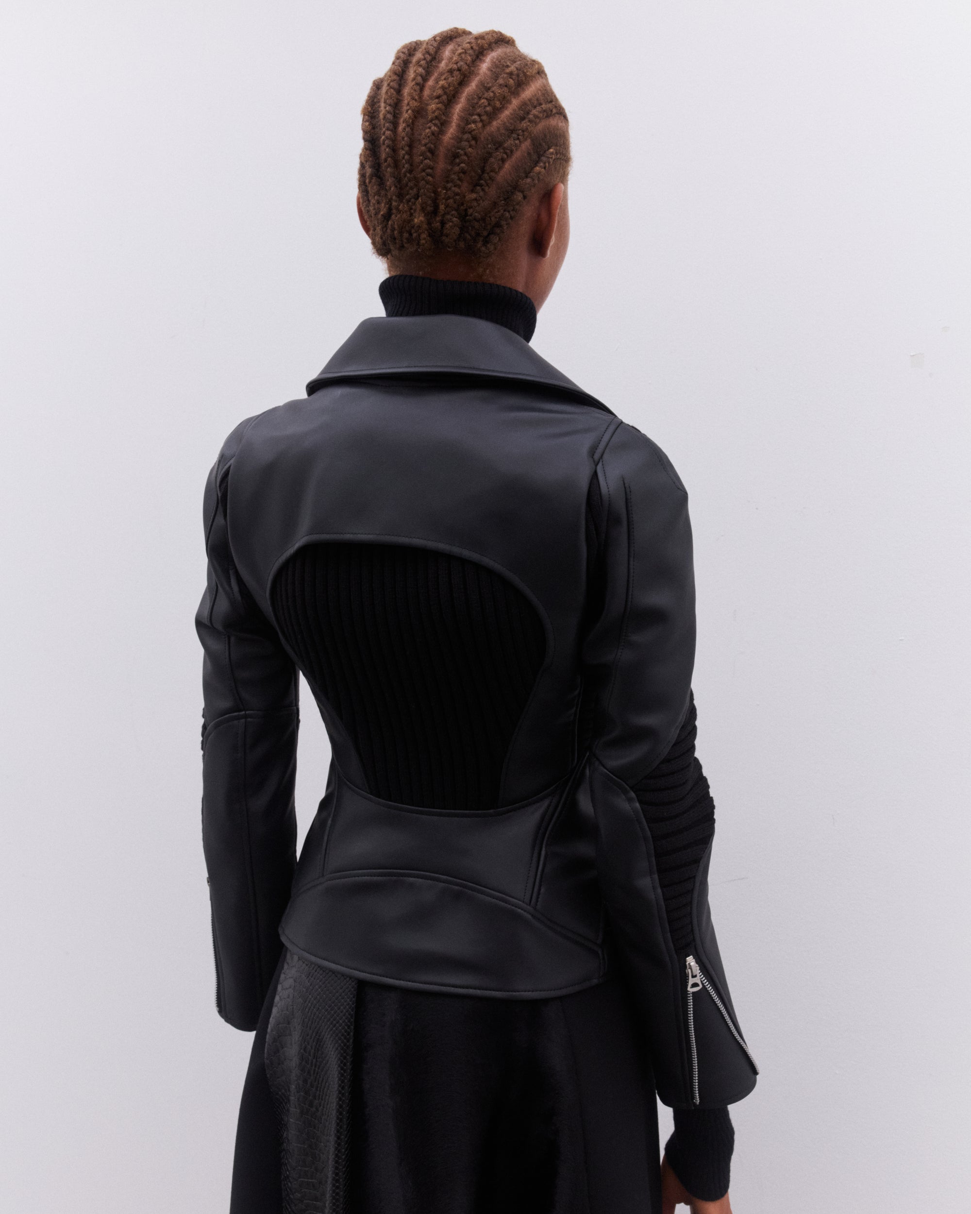 Open collarYKK zip fastening and cuffsBelt at hemThick rib panelling LinedSilver-tone hardware