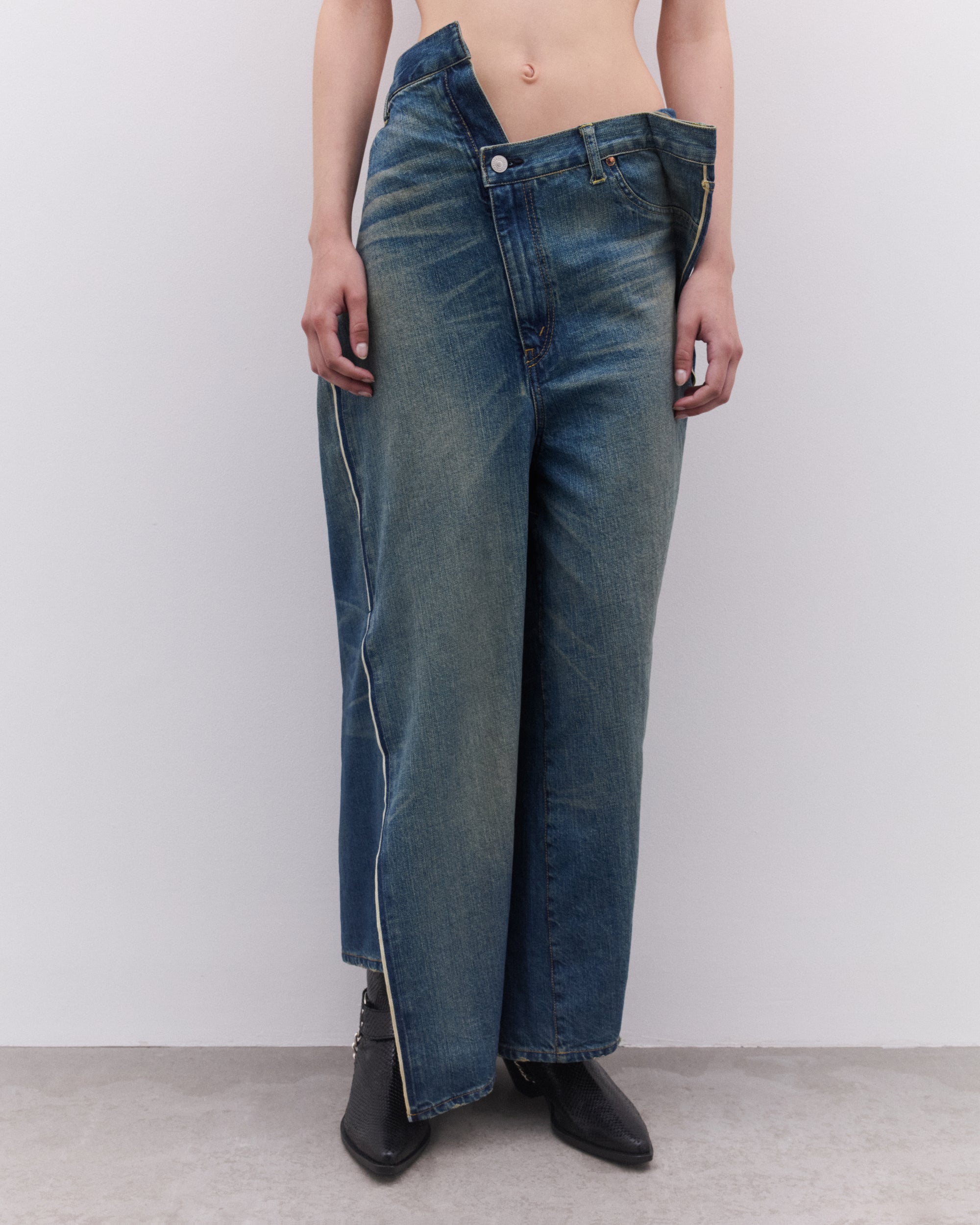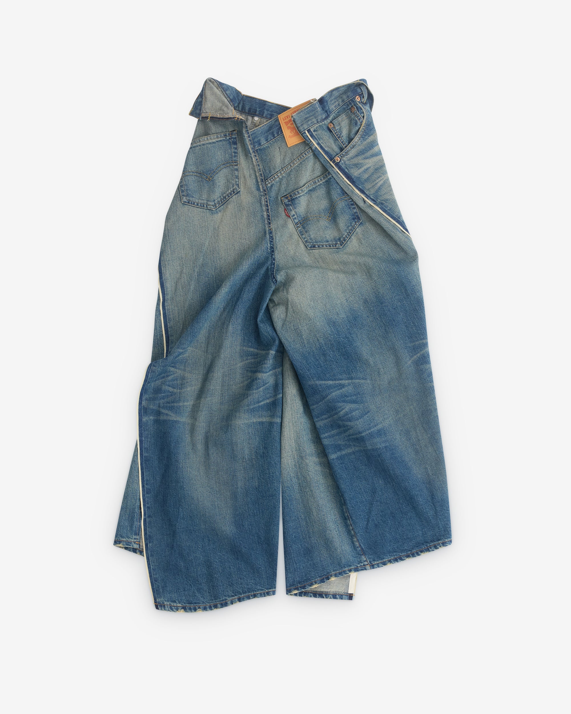 Made in collaboration with Levi'sAsymmetric, wide leg Fold over waistband detail5 pocket constructionButton and zip flyWashed finish100% Cotton Made in Japan
