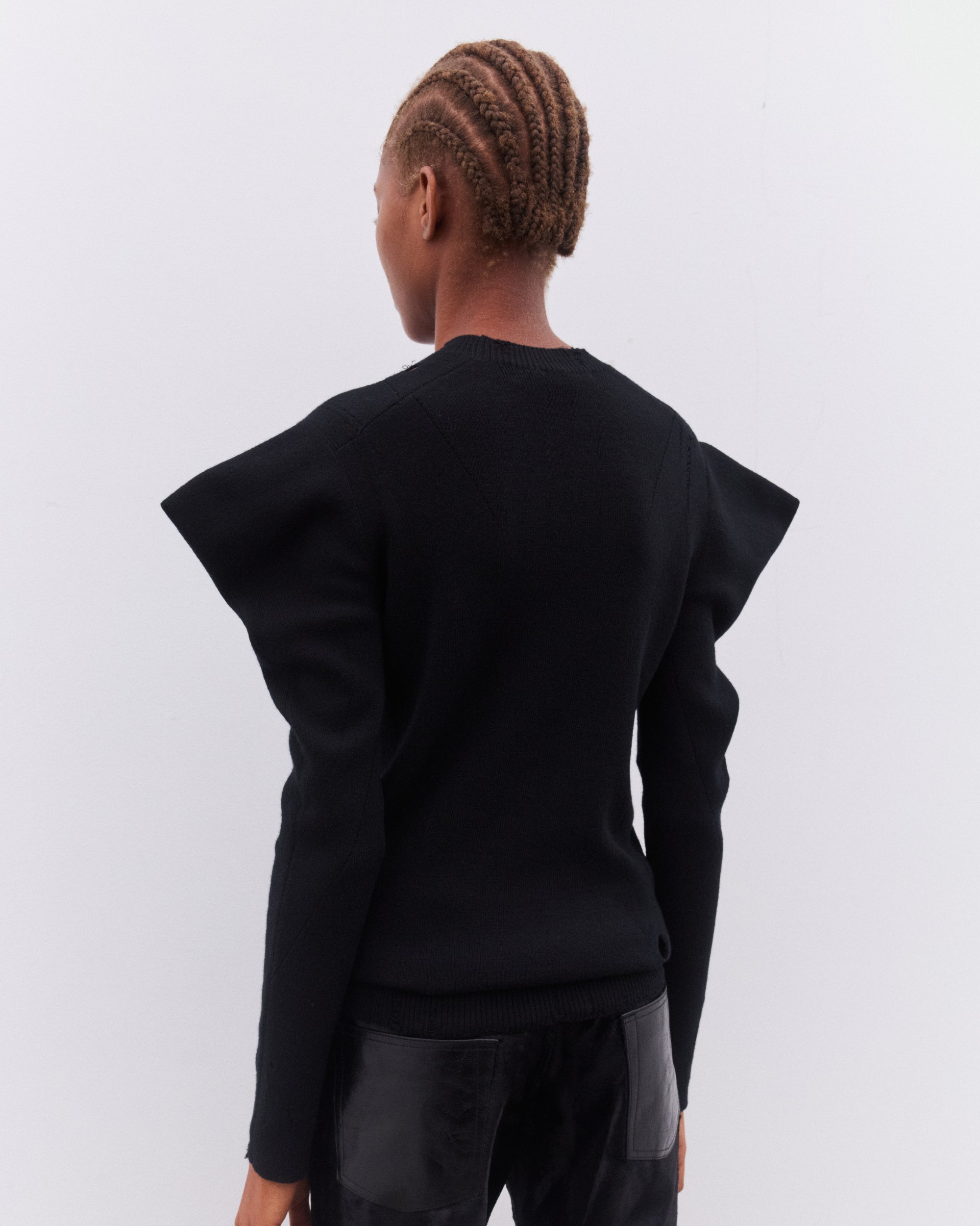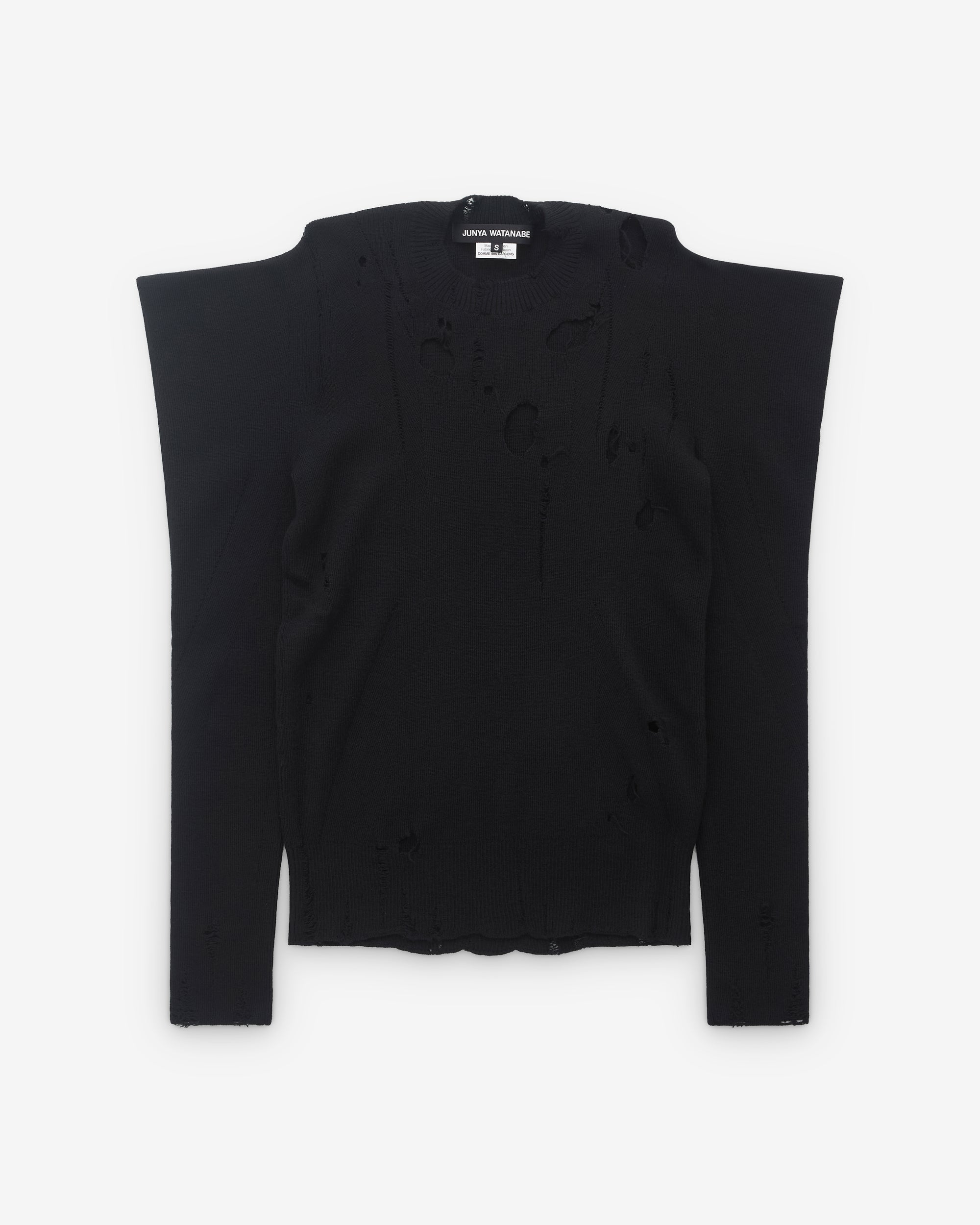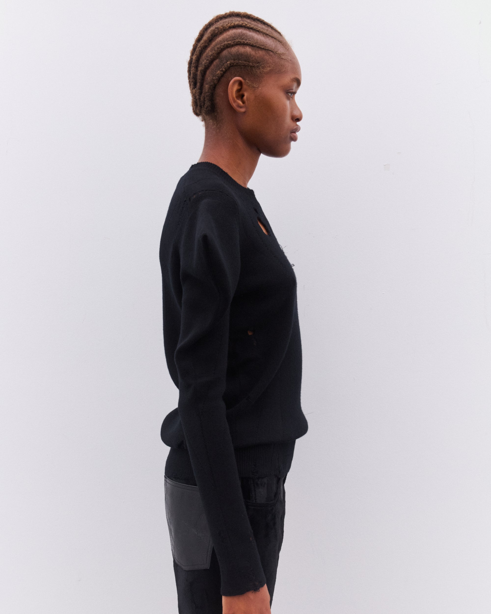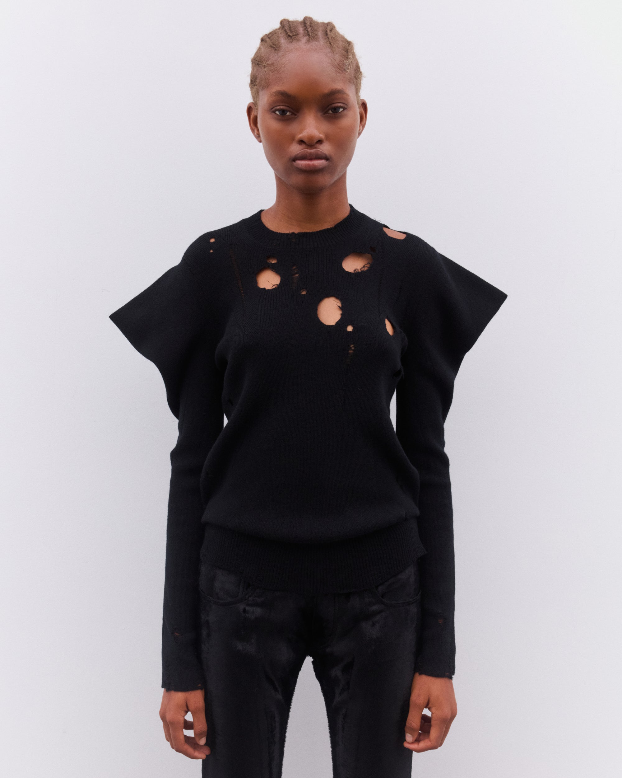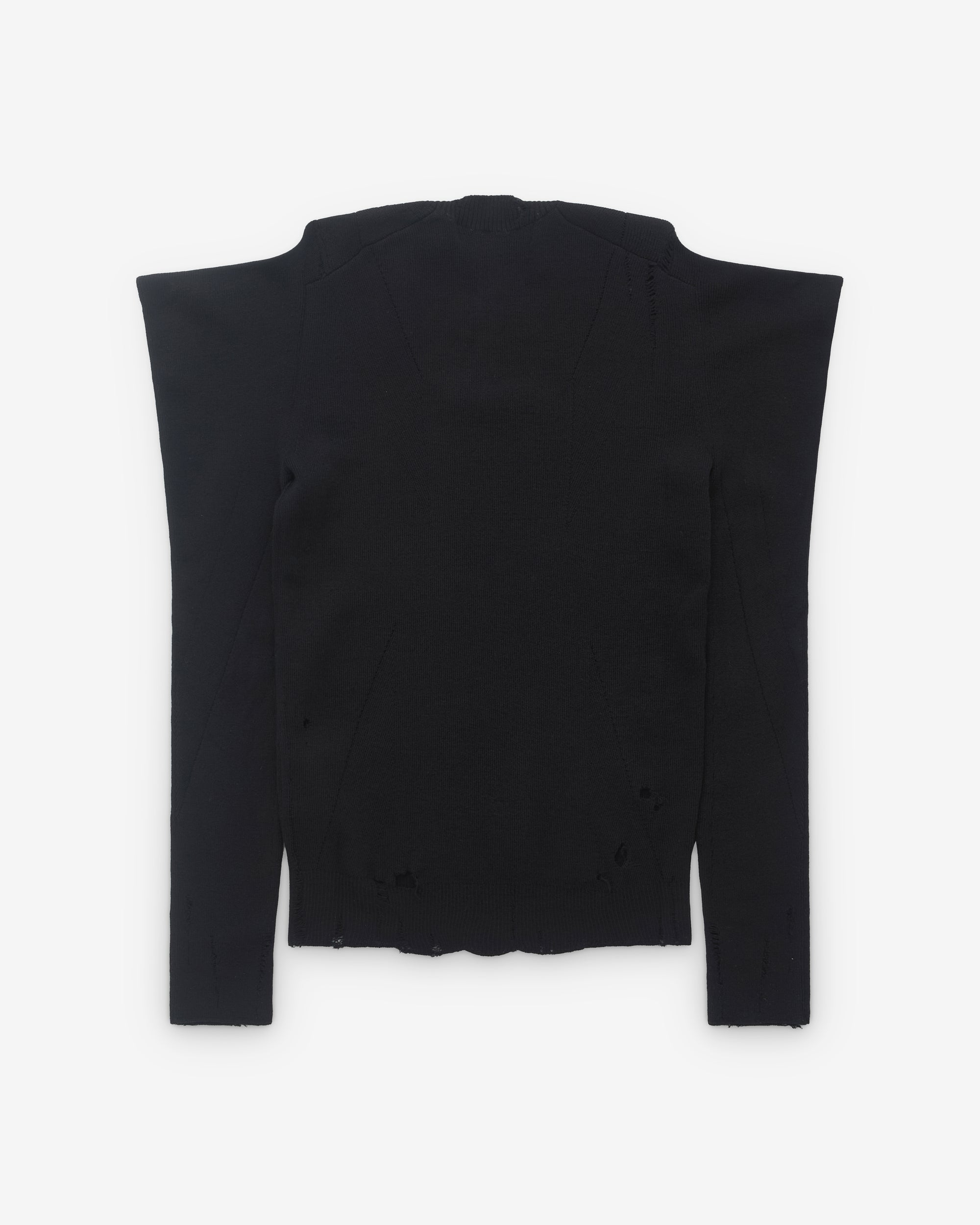 Round neckDistressing throughoutPointed shouldersRib knit trims