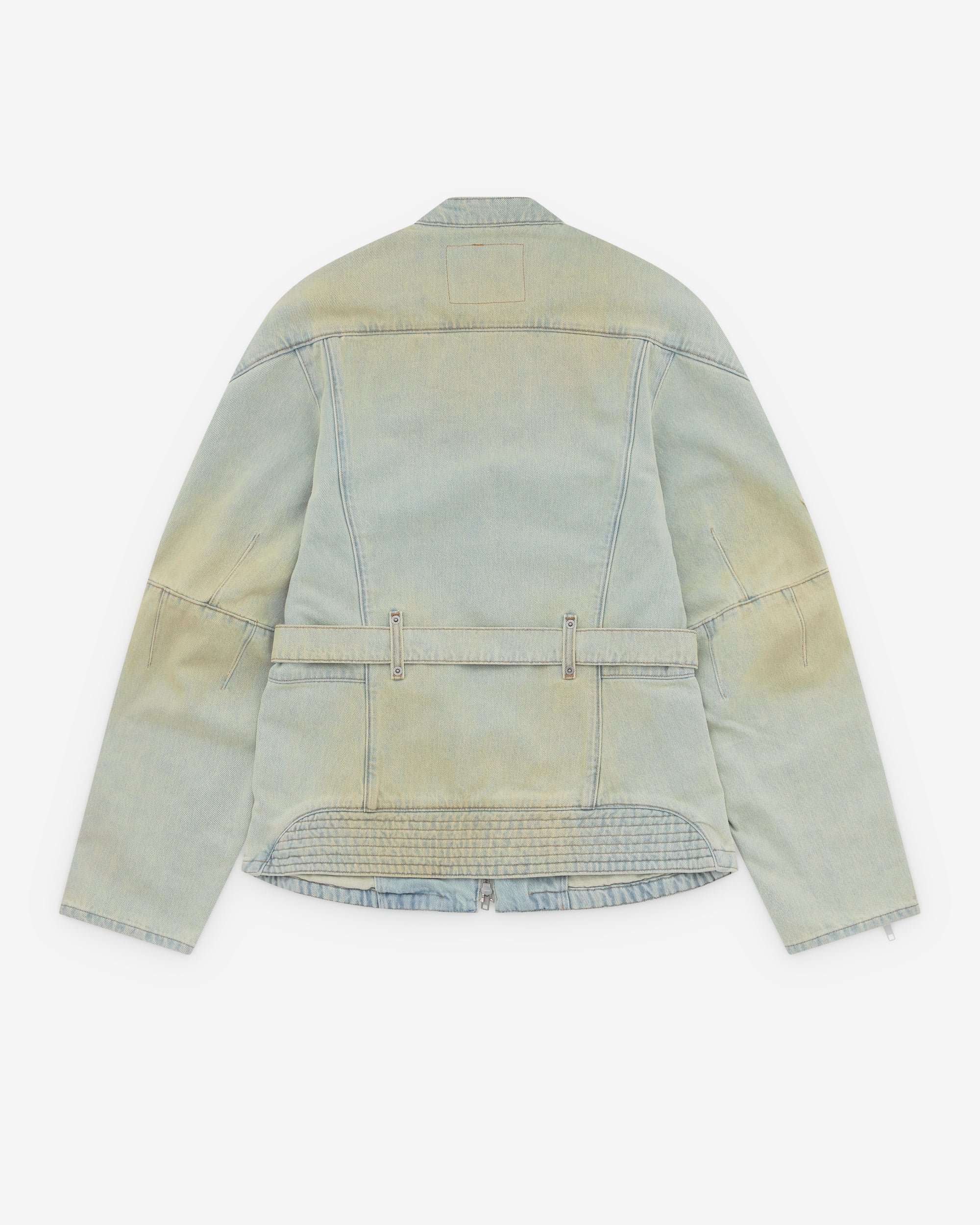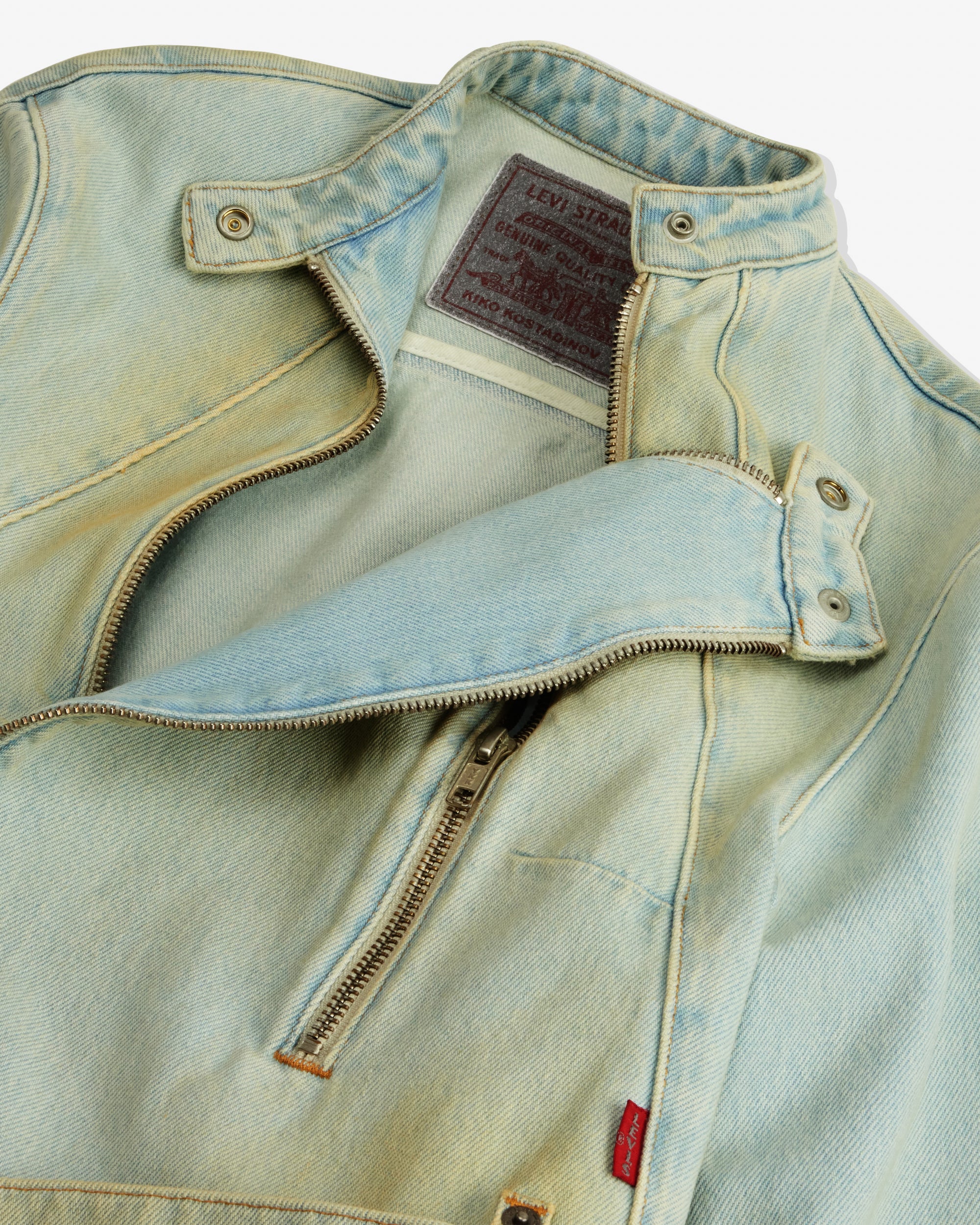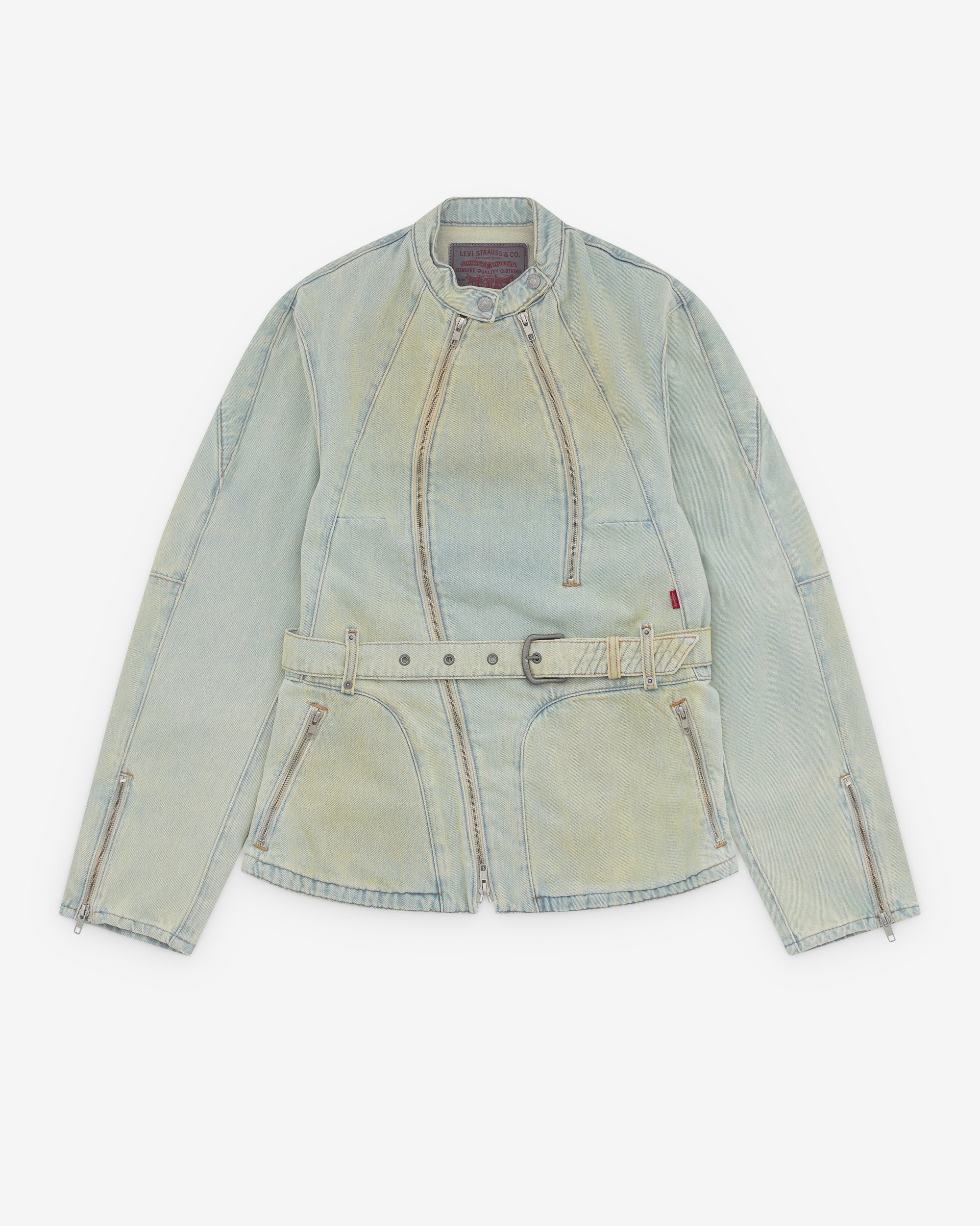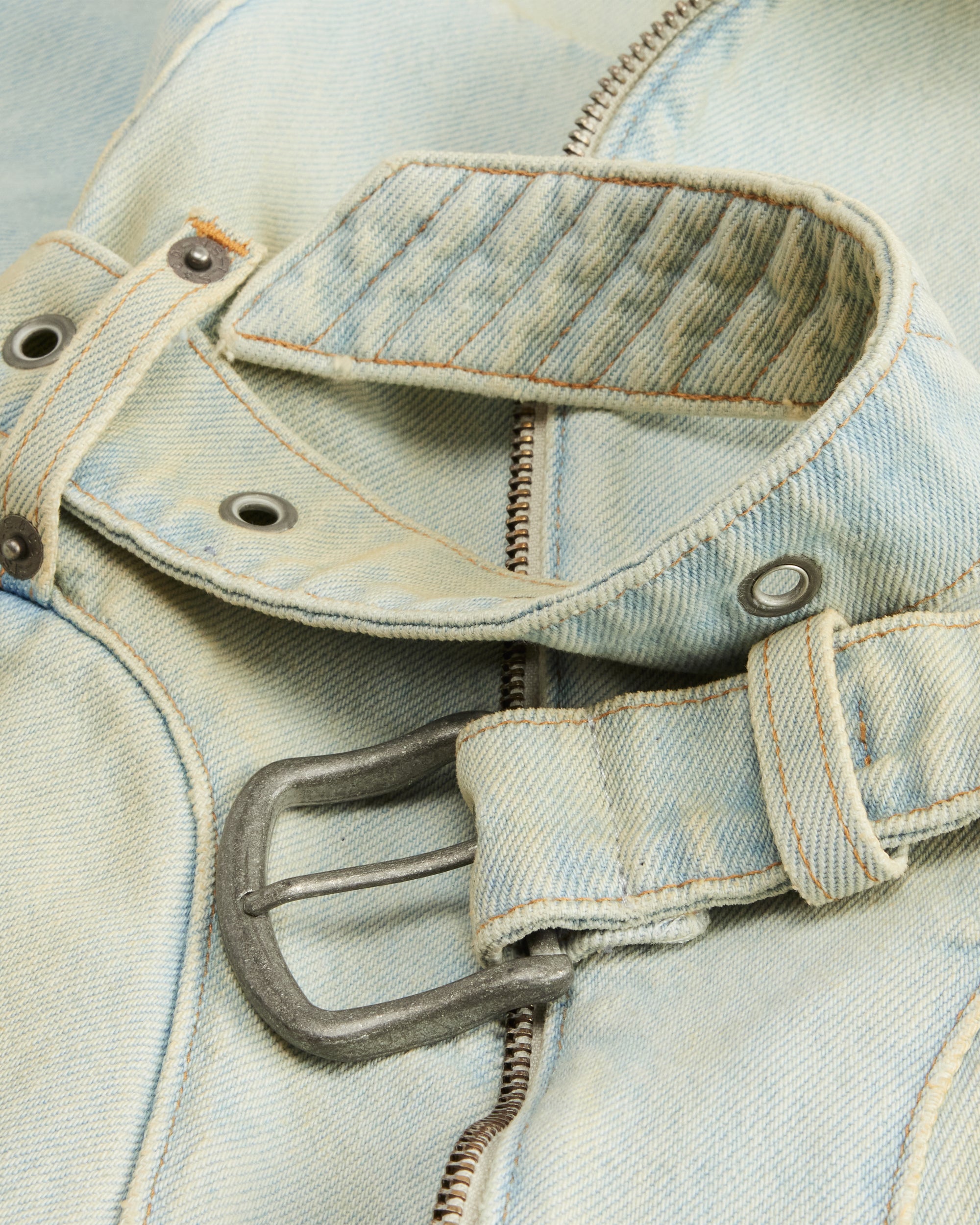 Stand collar with press stud fasteningZip closureBelted waistZip pockets and cuffsDropped shoulderA-line silhouette