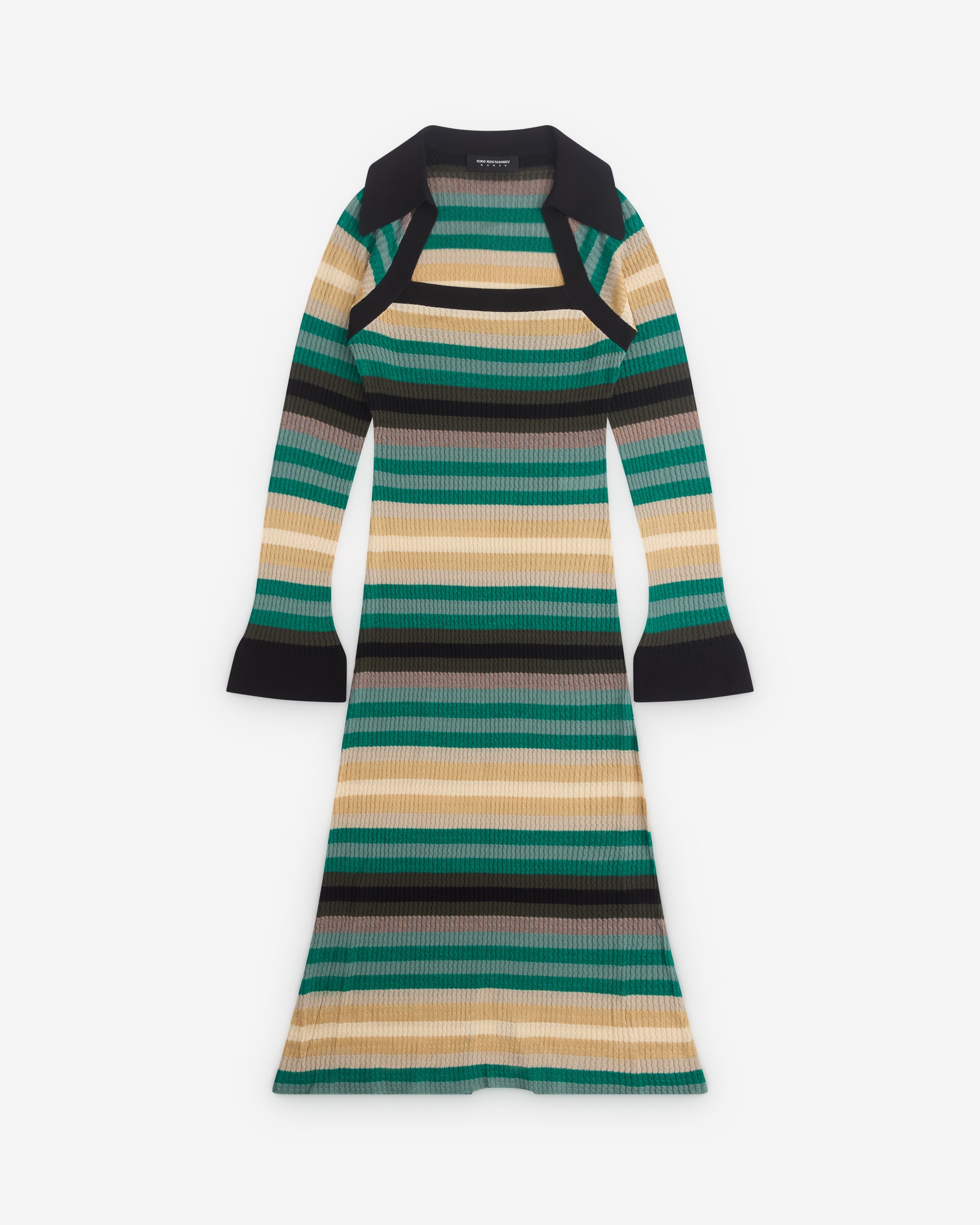 Wide, point collarSquare necklineSlim fitRibbed knit constructionFlared cuffsTonal, intarsia stripeRear central hem vent