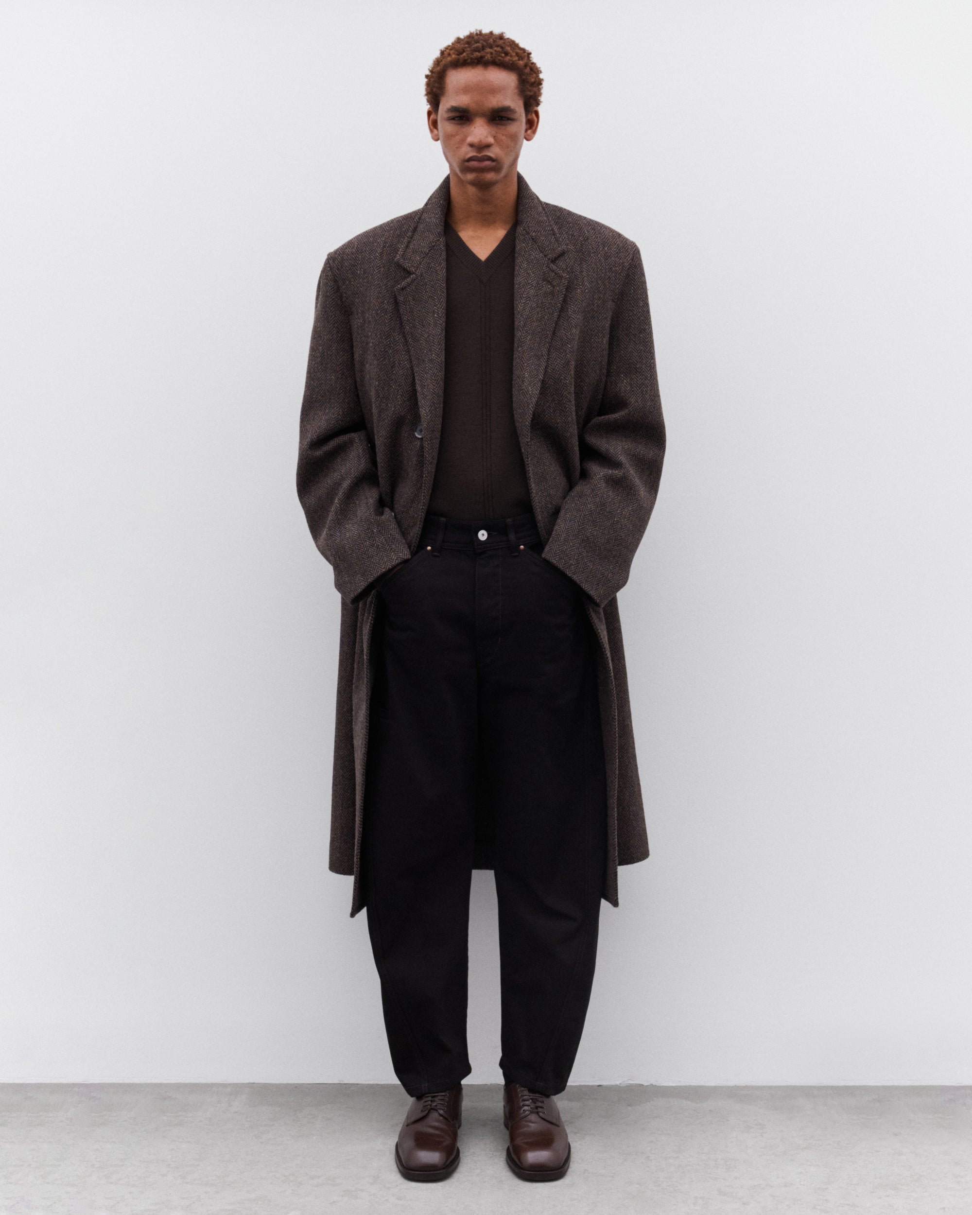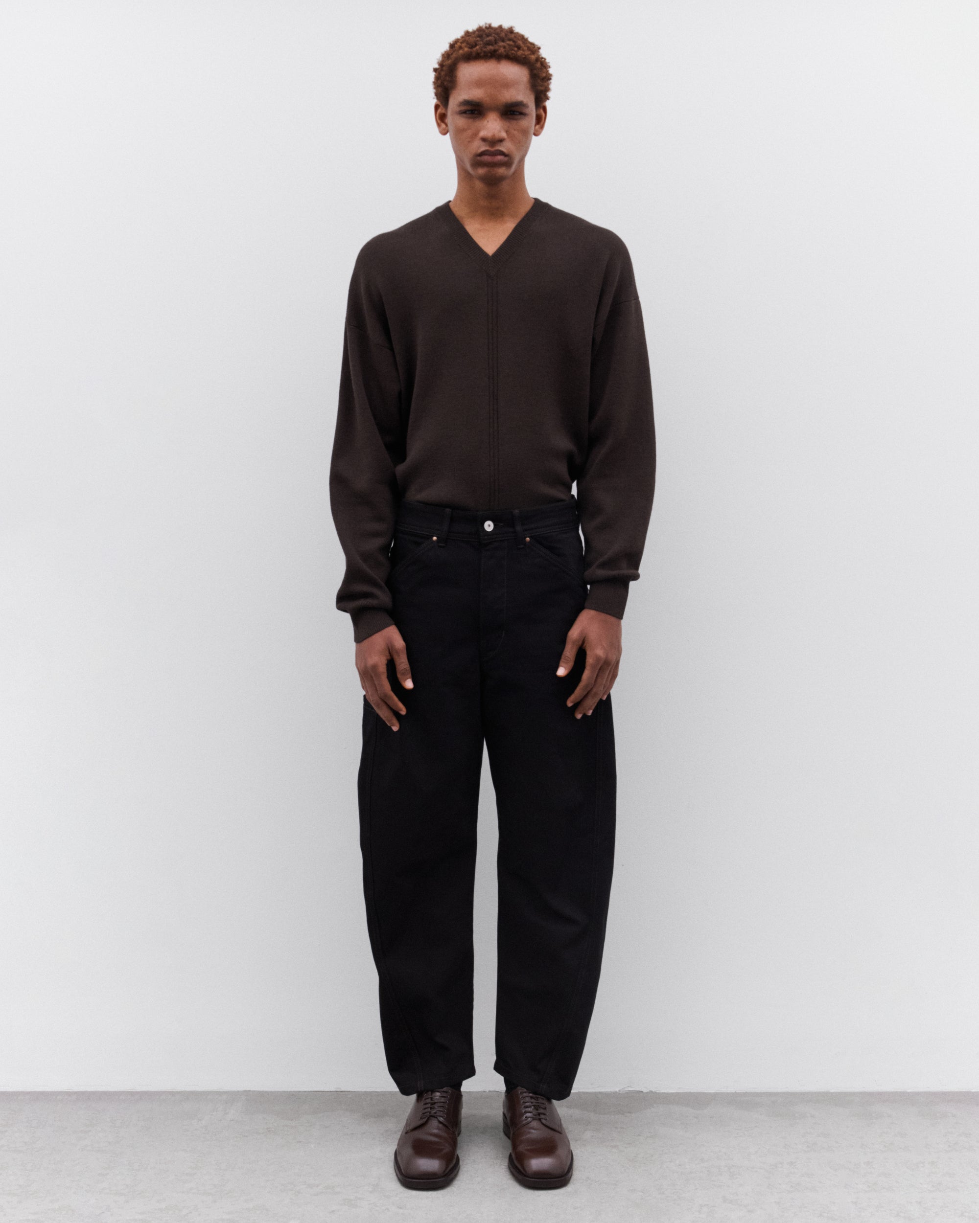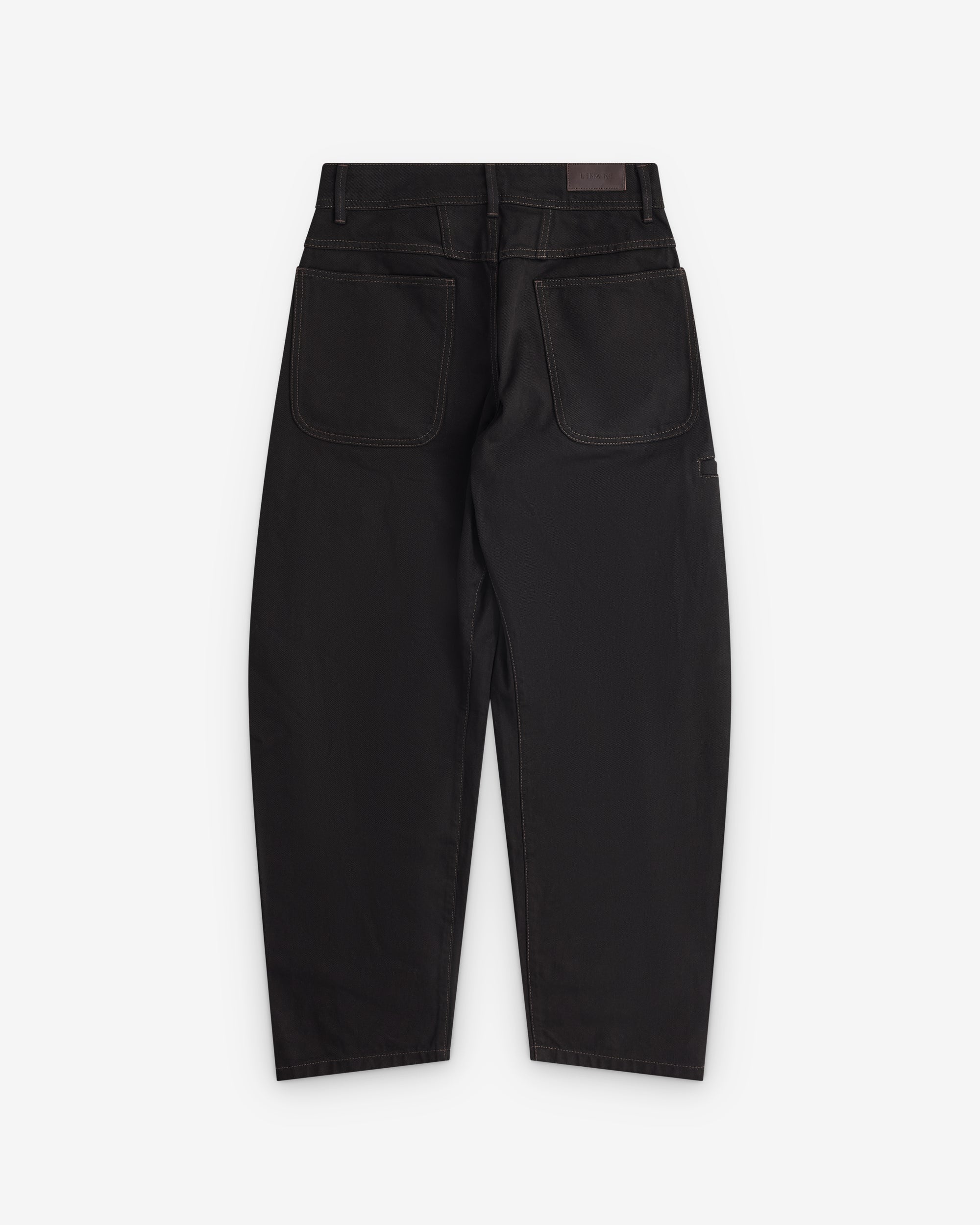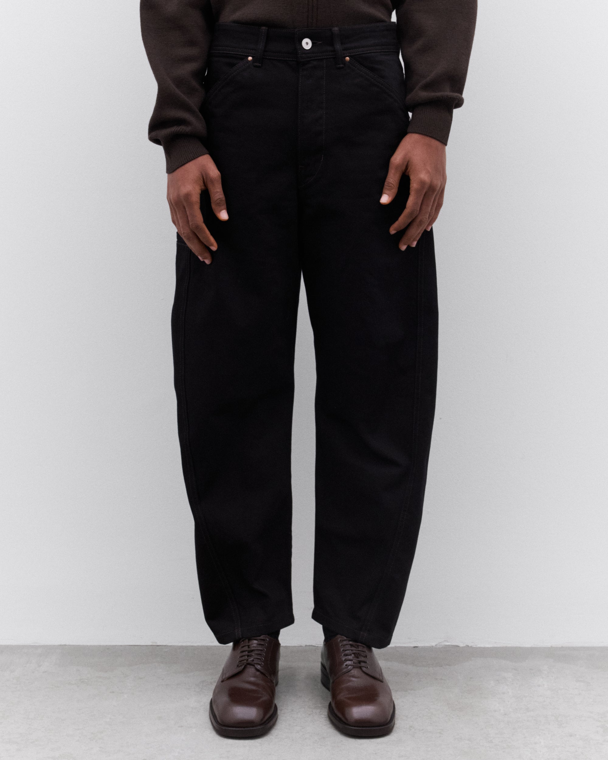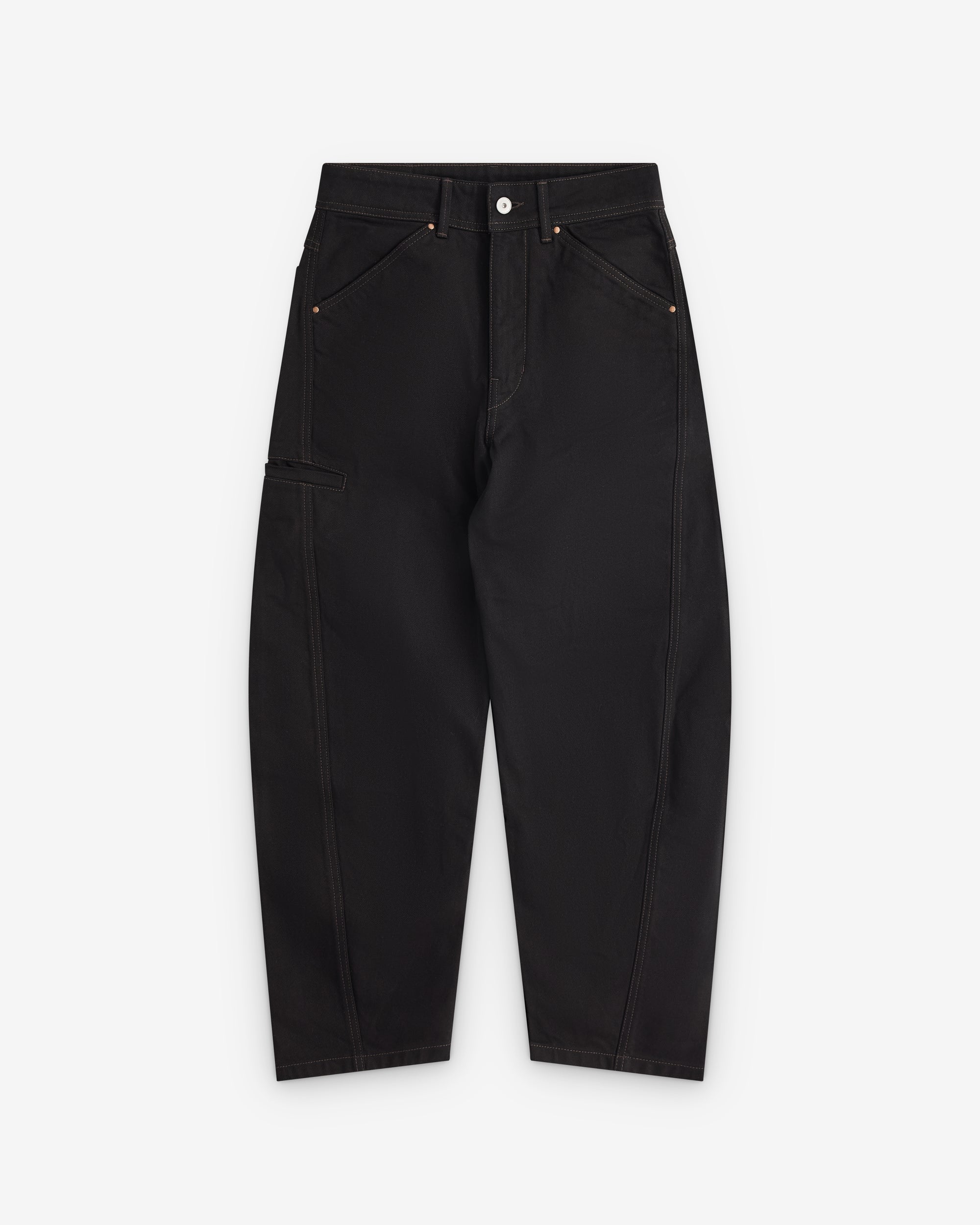 Straight-cutBelt loops at waistbandButton closure with hidden zipperOrnamental buttonSide pockets with rivetsSmall welted pocket on right legBack patch pocketsTwisted seams