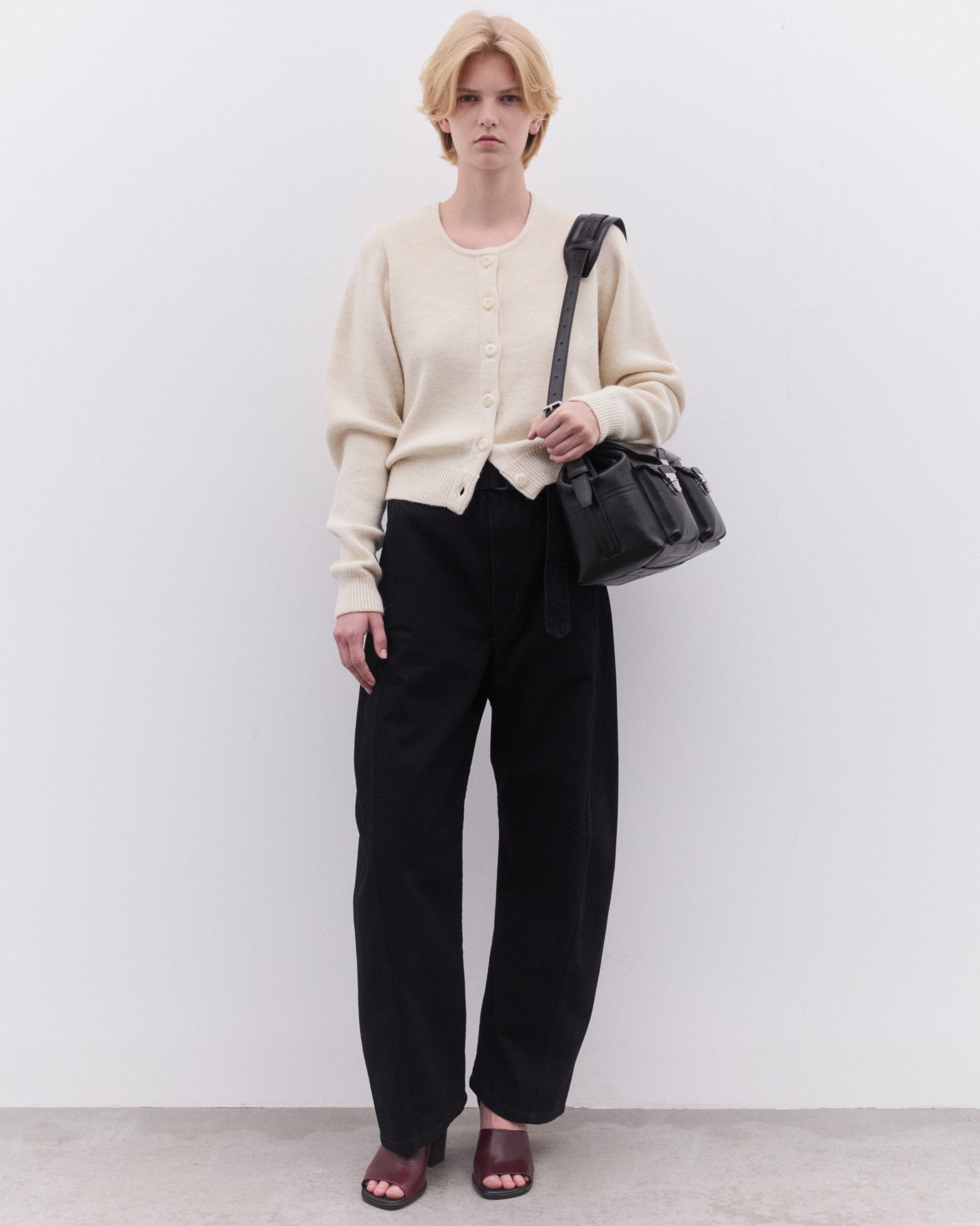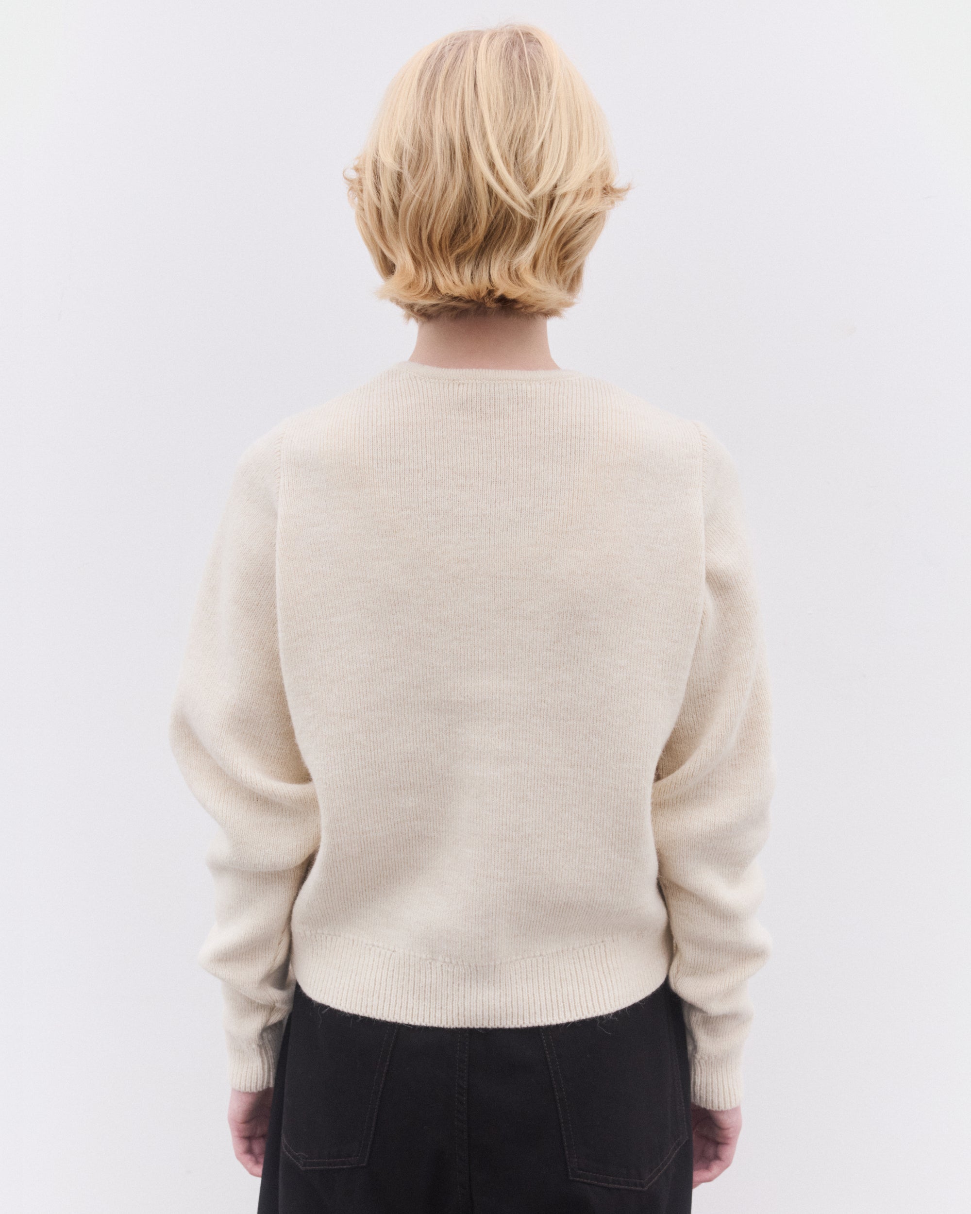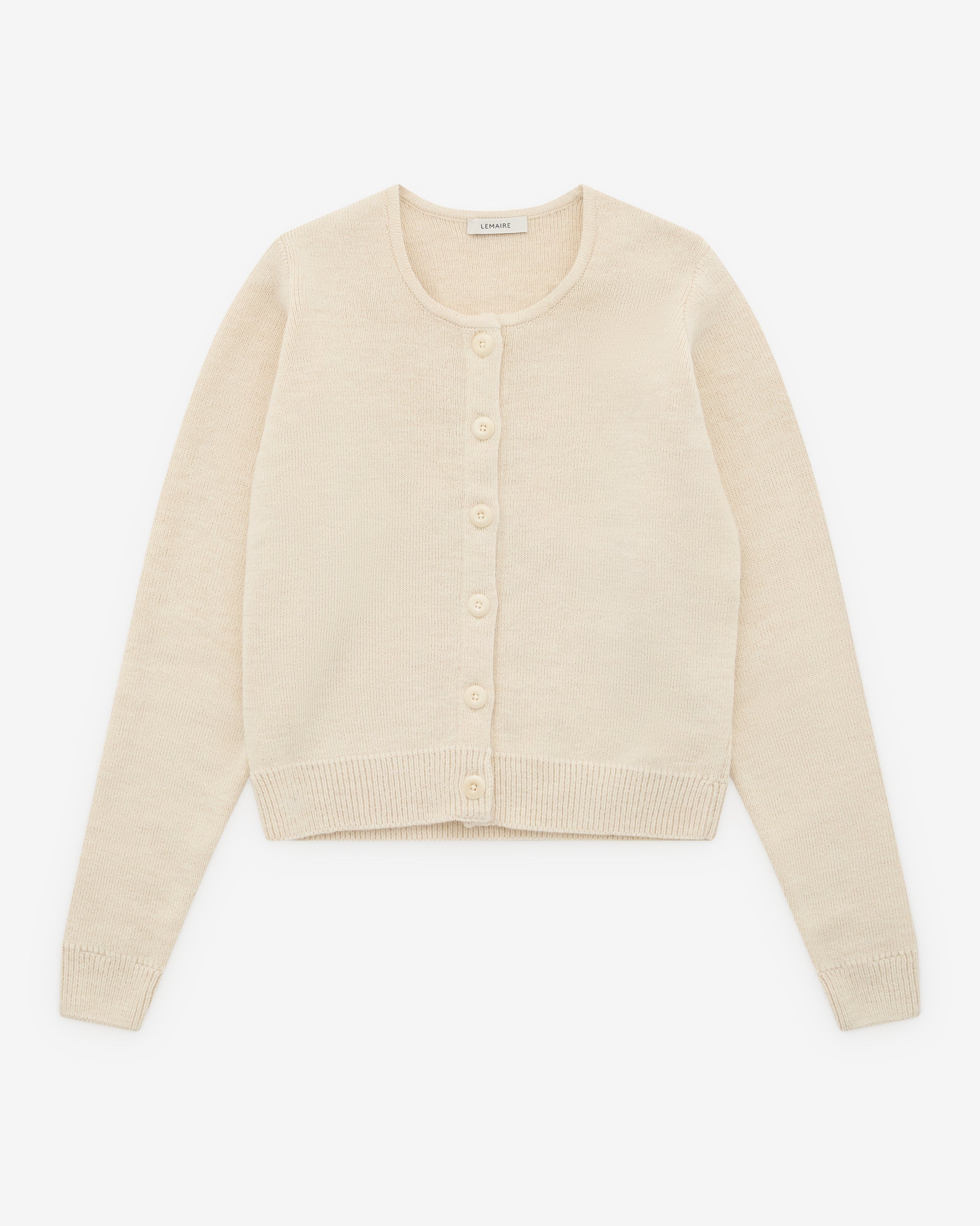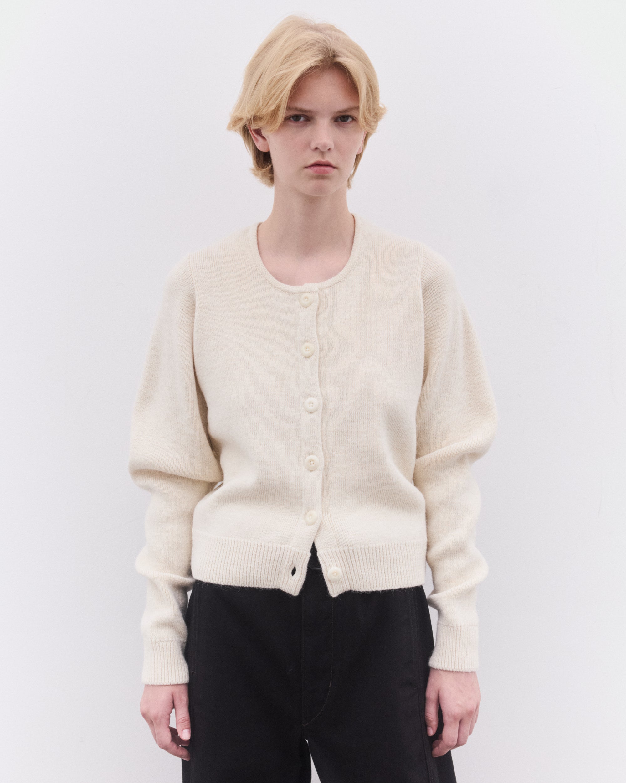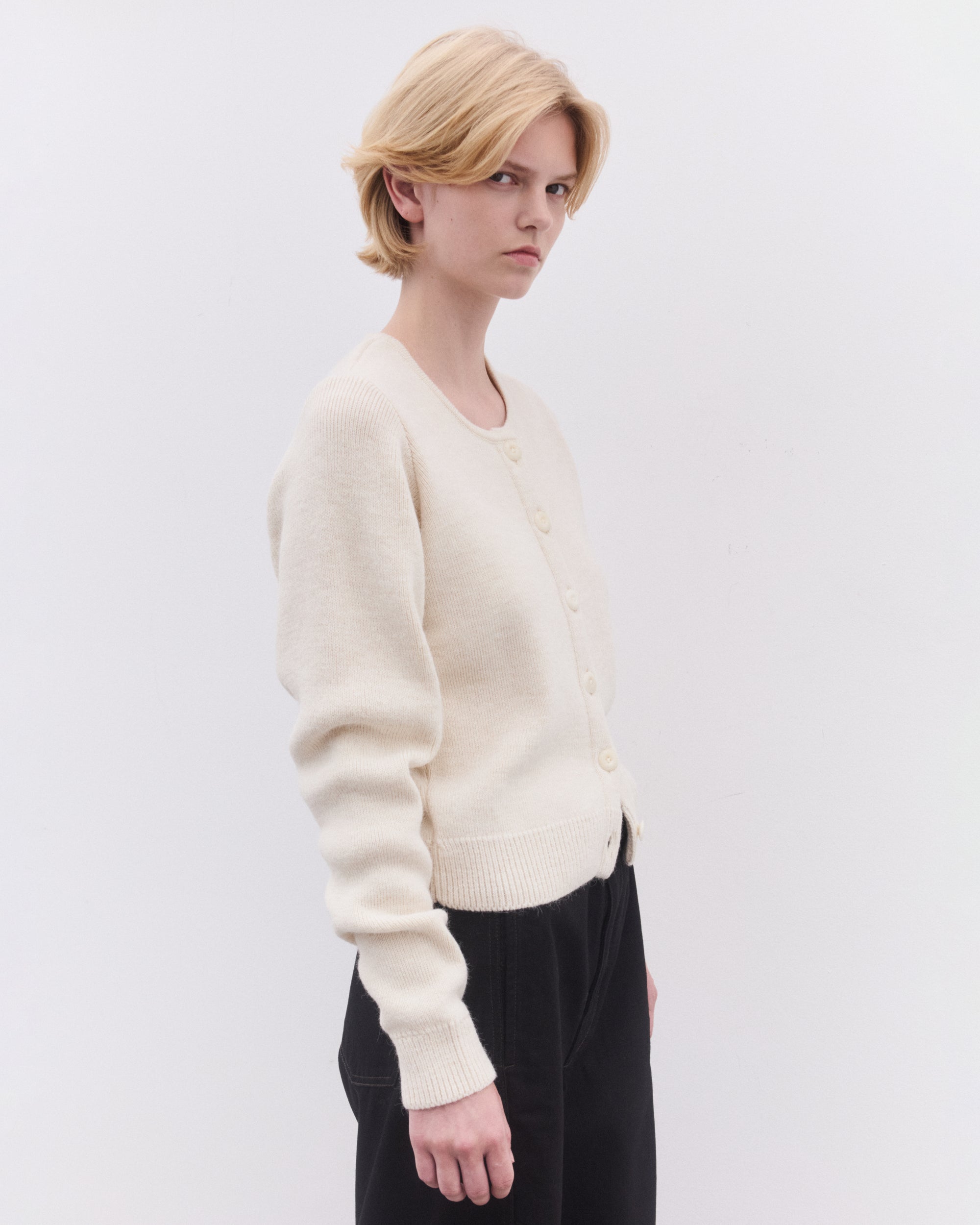 Rounded necklineFront button closureRibbed knit cuffs and hem