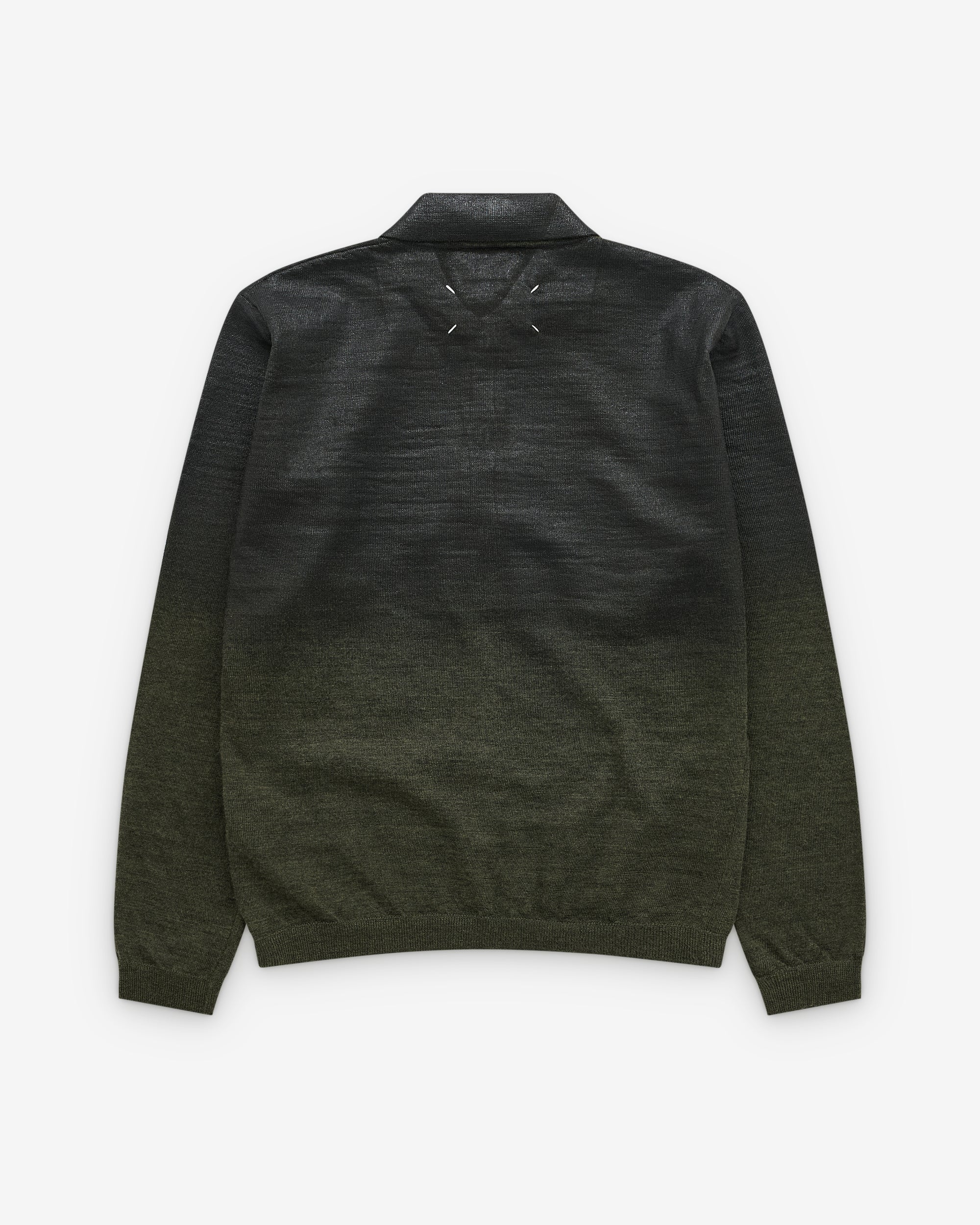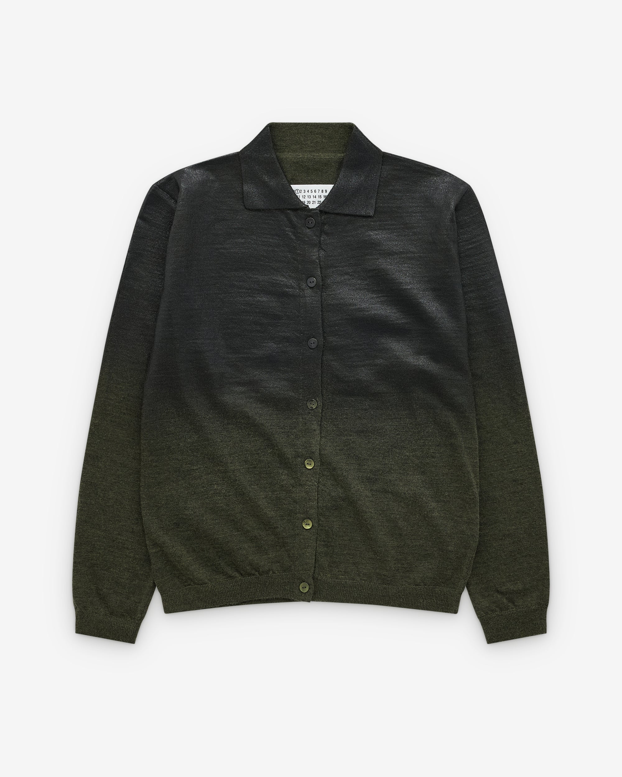 Gauge 14Lightweight foiled knitsLong sleevesShirt collarFront button closureFour stitches at the back