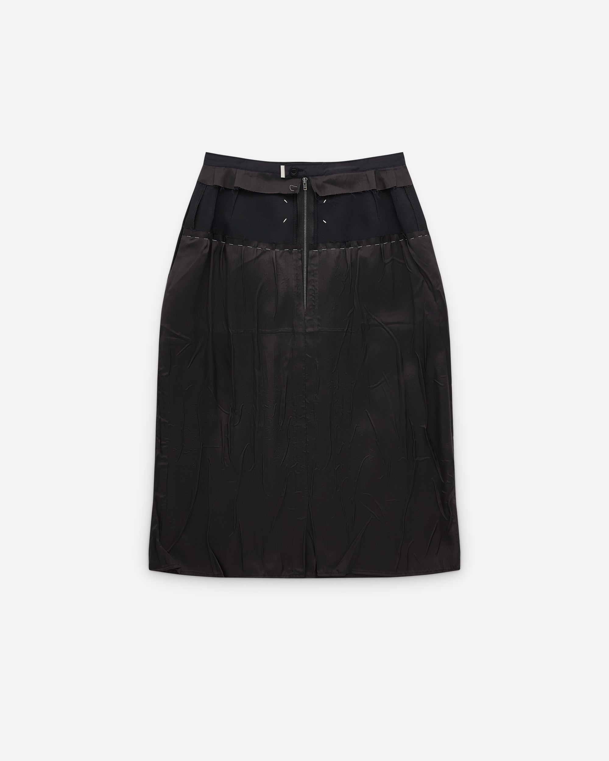 Pencil skirt with gathered tulle waist detailBelt loopsFour stitches at the backMid length
