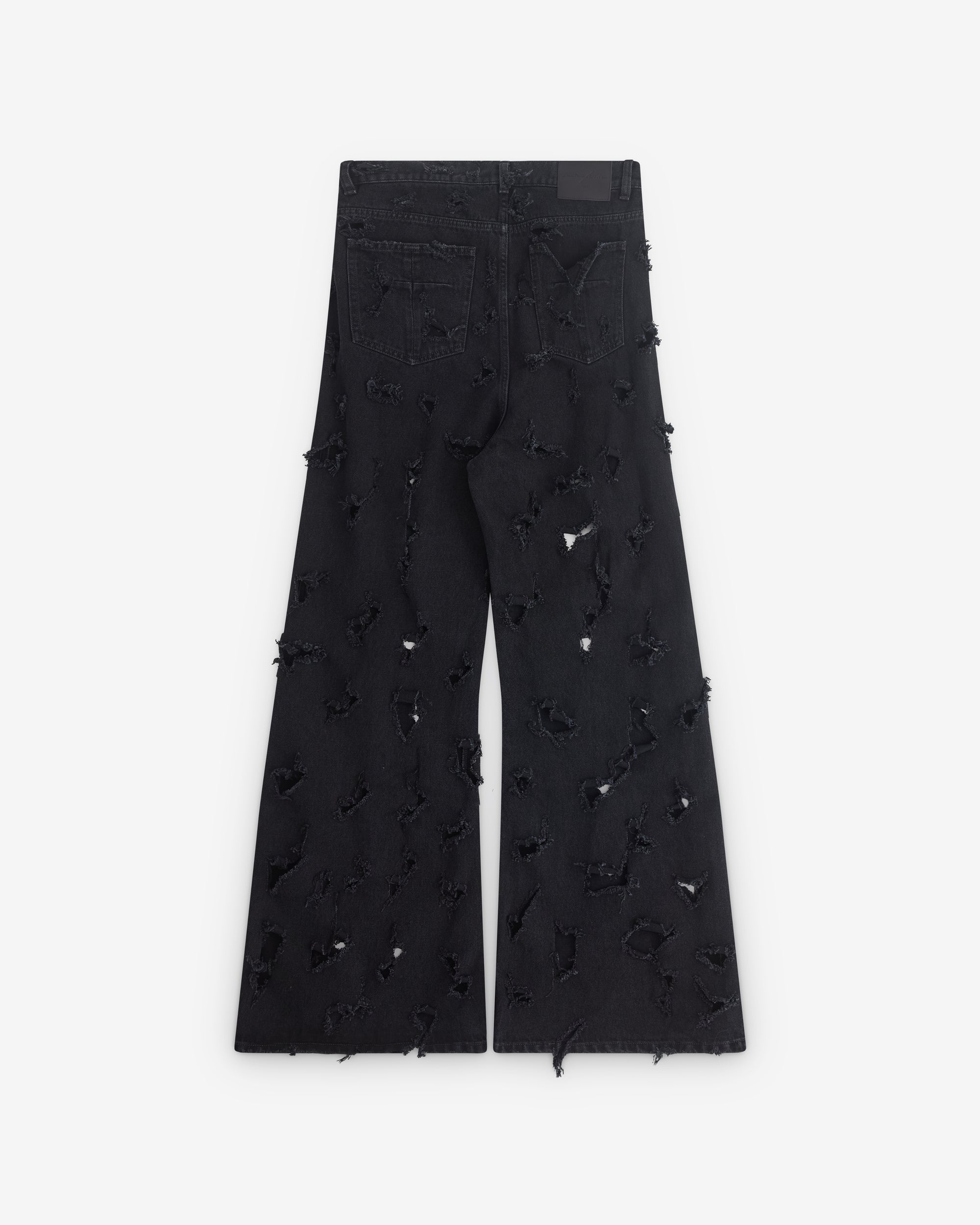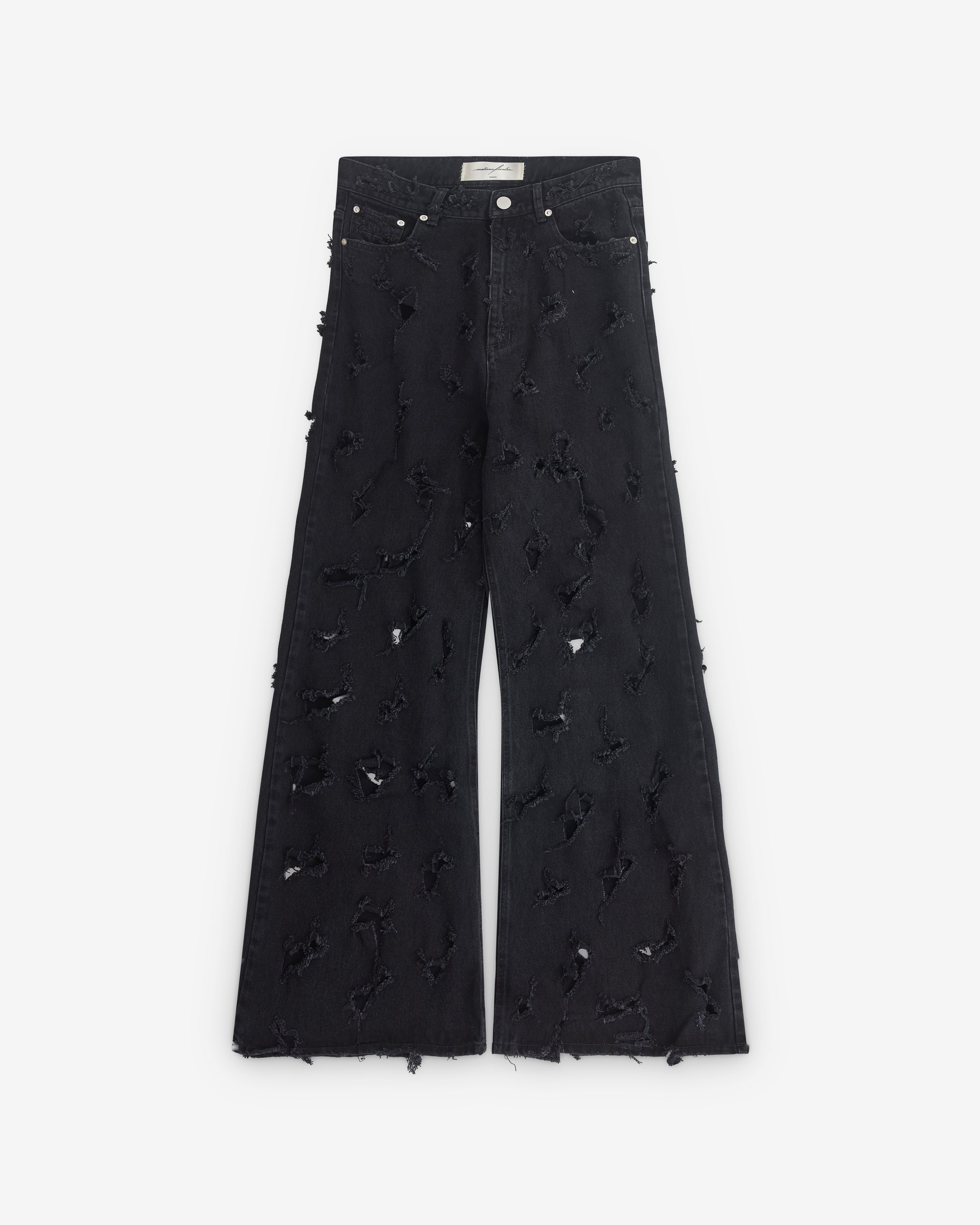 Wide legHigh waistedDistressing throughoutFull lengthButton and zip fly fastening