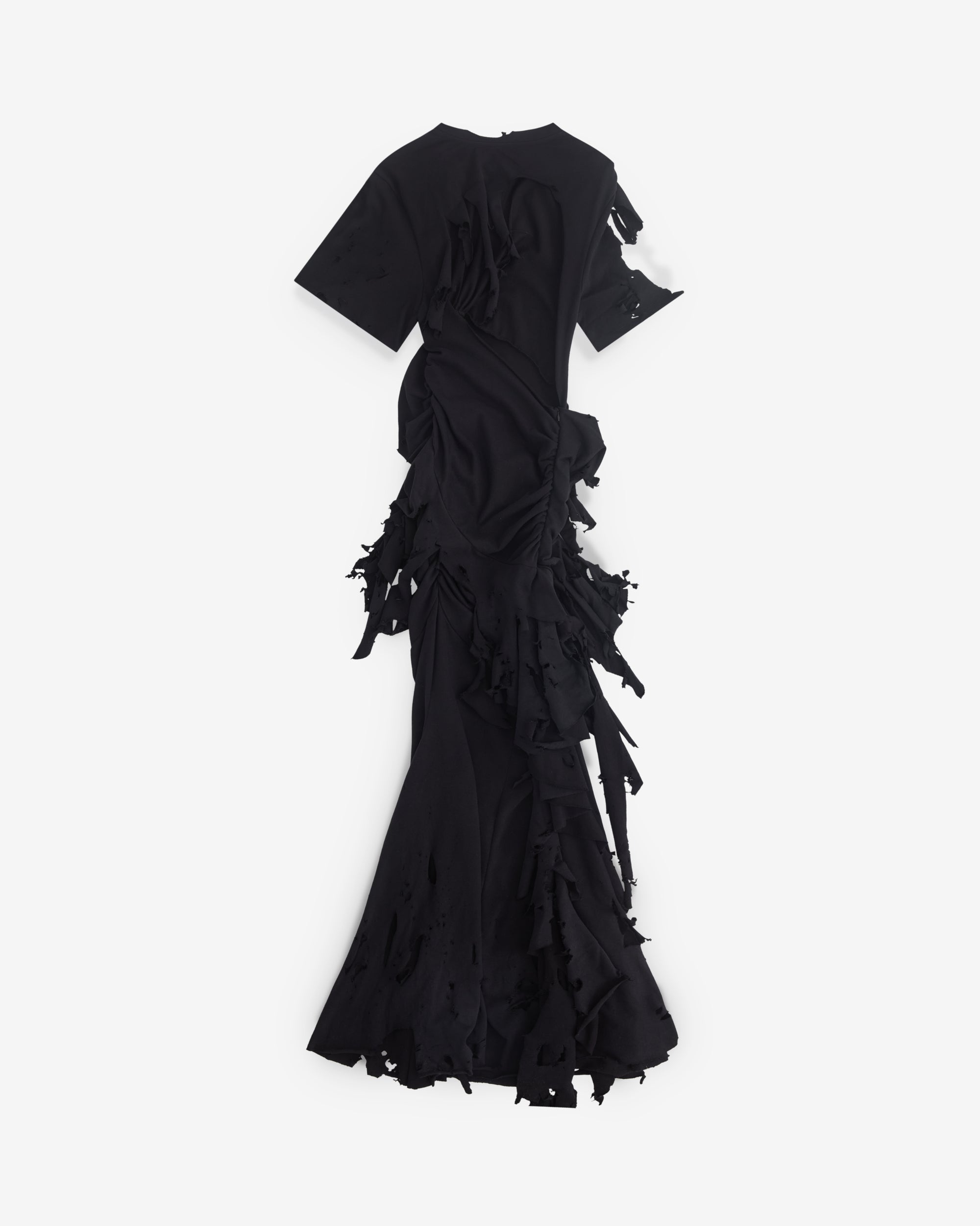 Short sleevesDistressing and raw finishes throughoutFloor-lengthOpen backCinched chest panel