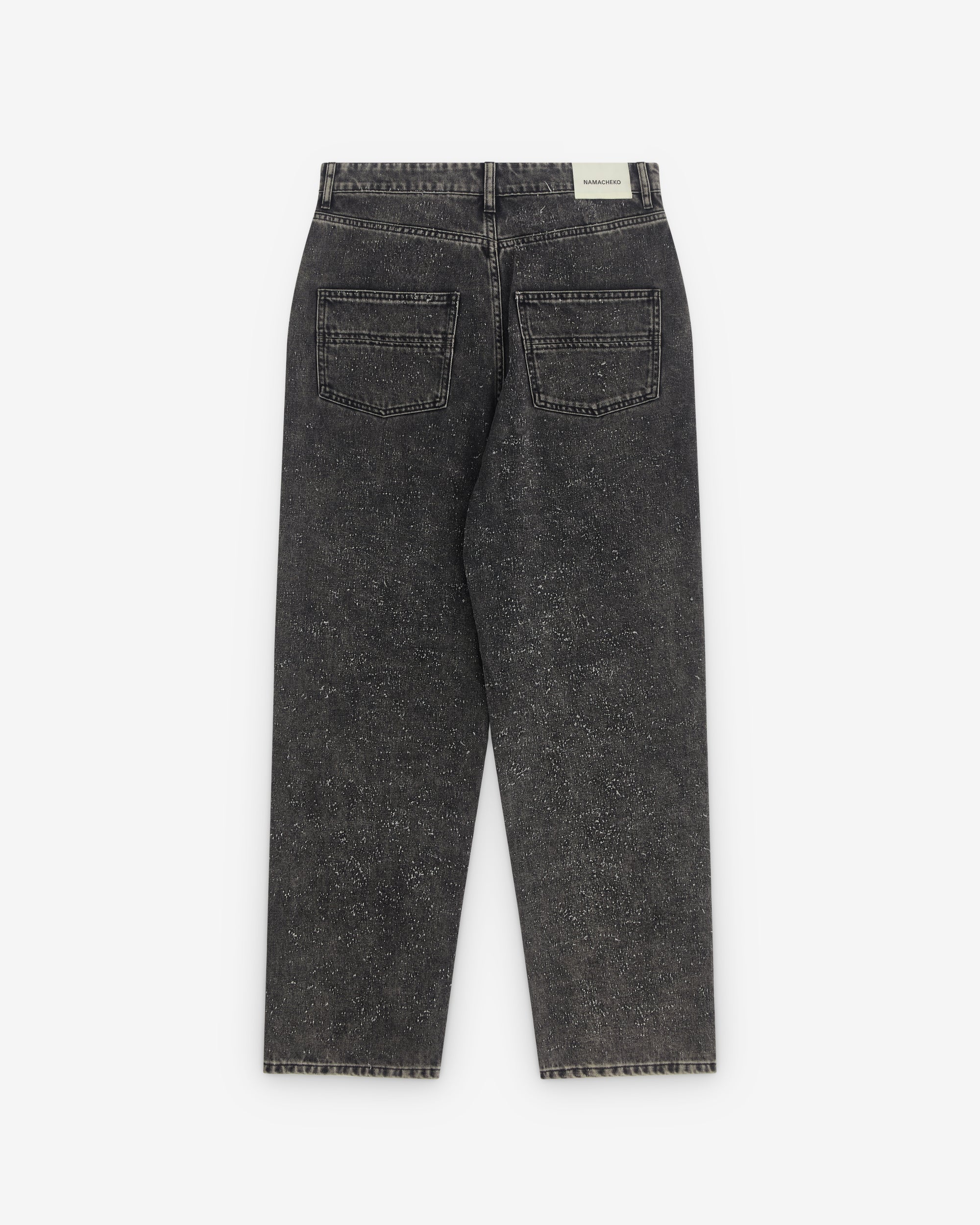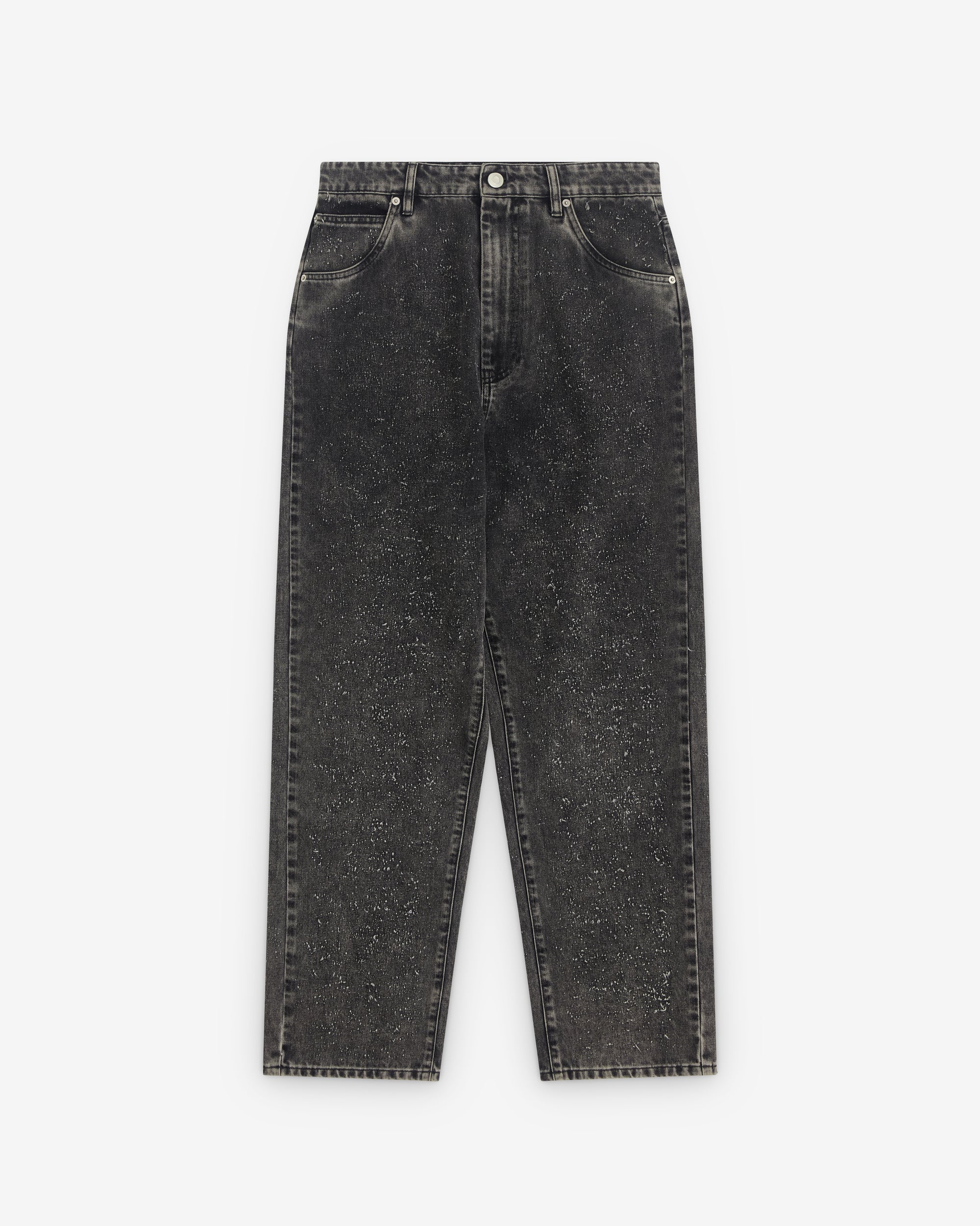 Wide leg, baggy fitButton closure at waistZip fly5 pocket construction Pilled denim fabricGraphic patch at rear waist