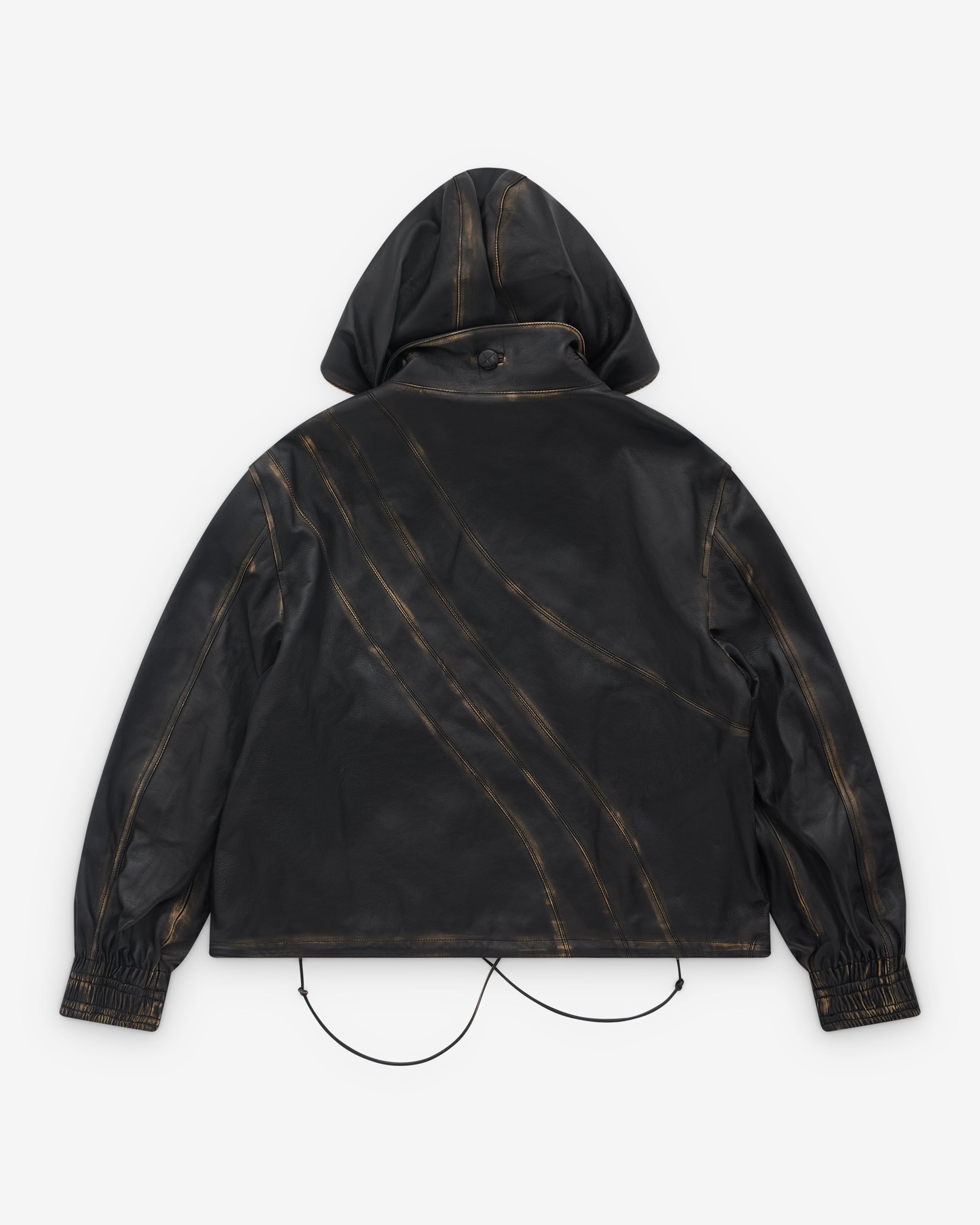 Detachable hoodAged finish to leatherFront zip closureElasticated cuffs and elasticized drawstring hem