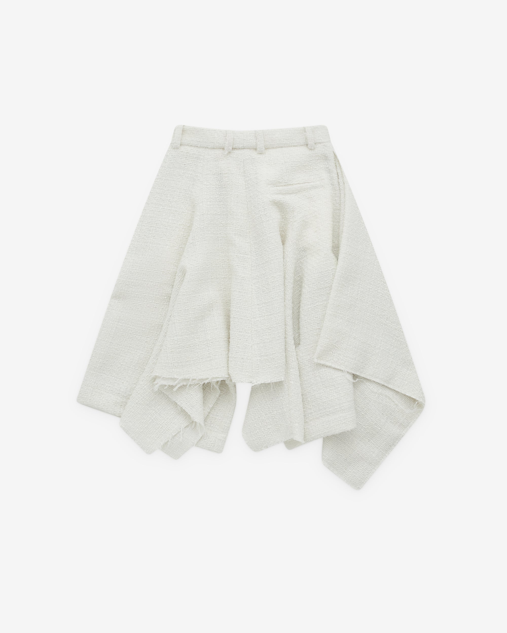 Asymmetric hemConcealed zip flyInternal shortsBelt loopsSide seam pocketsRear welt pocket