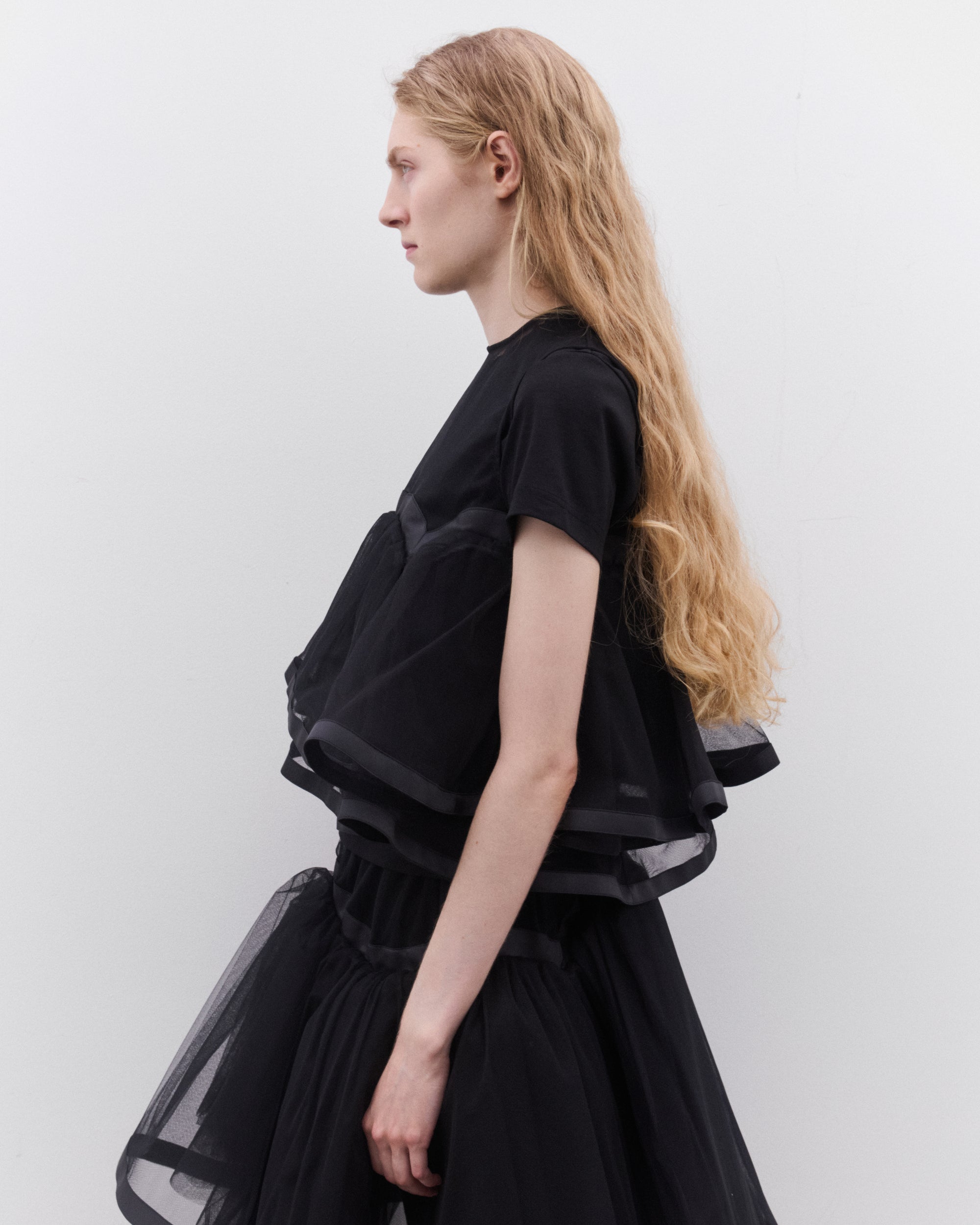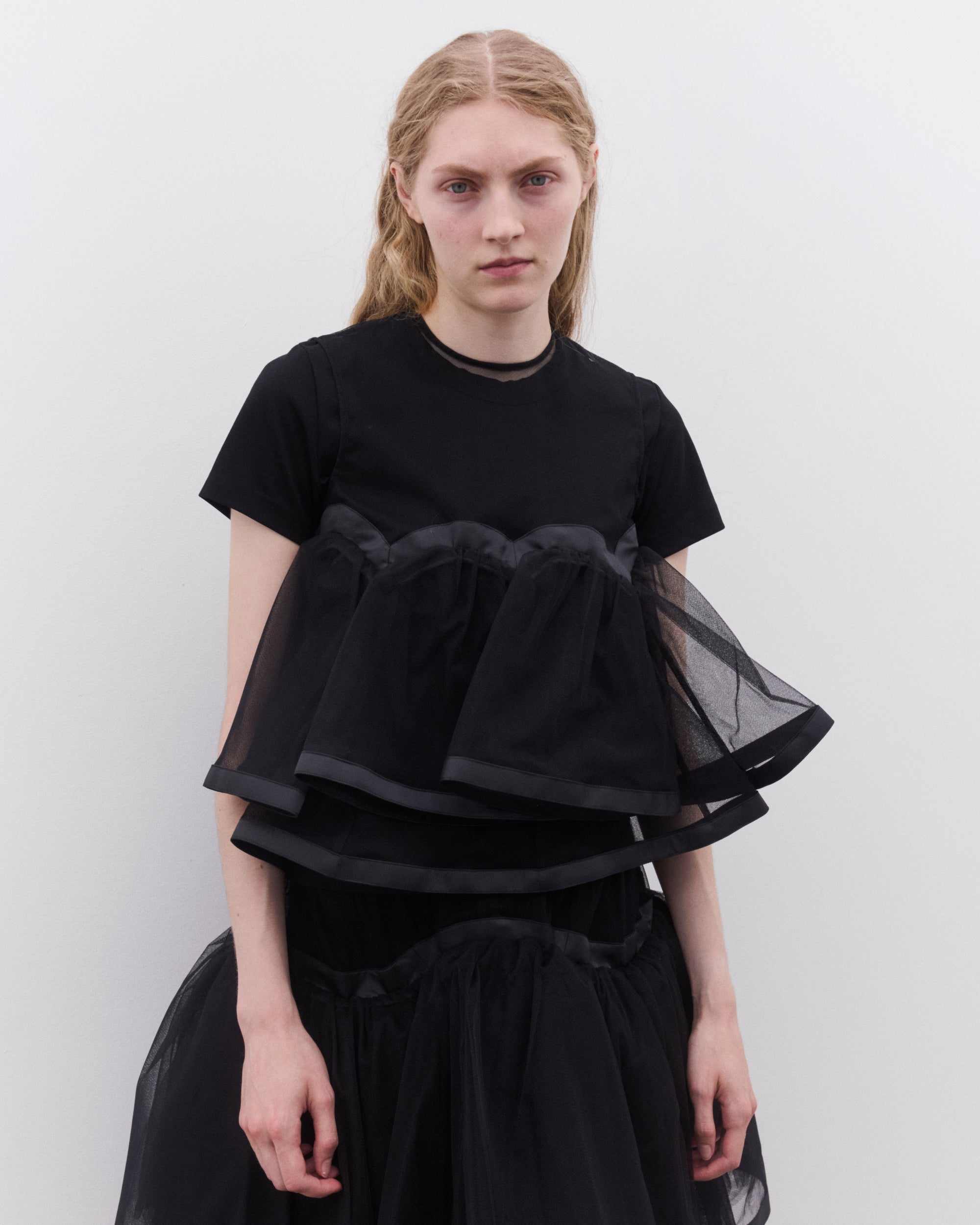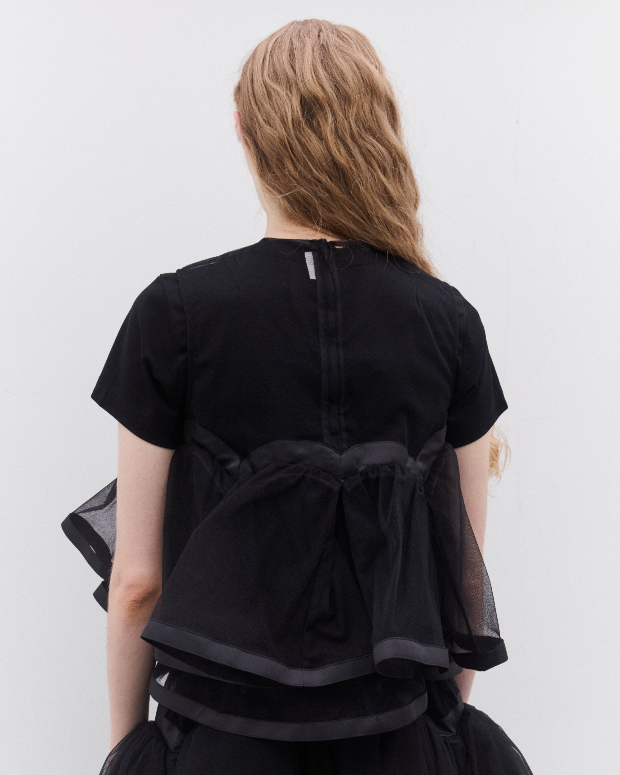 Round neckSleevelessVoluminous attachments throughout SheerRear zip fasteningA-line silhouette