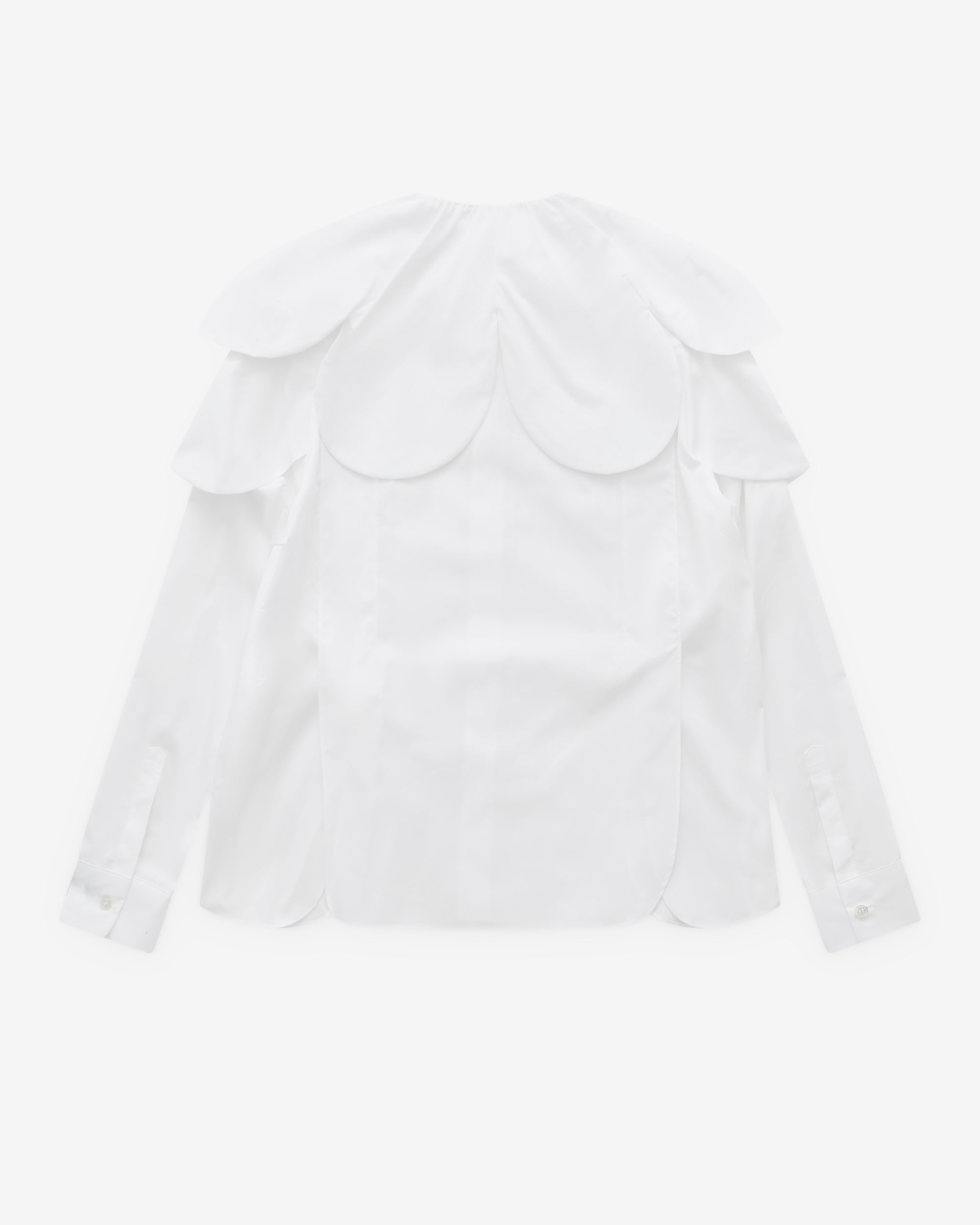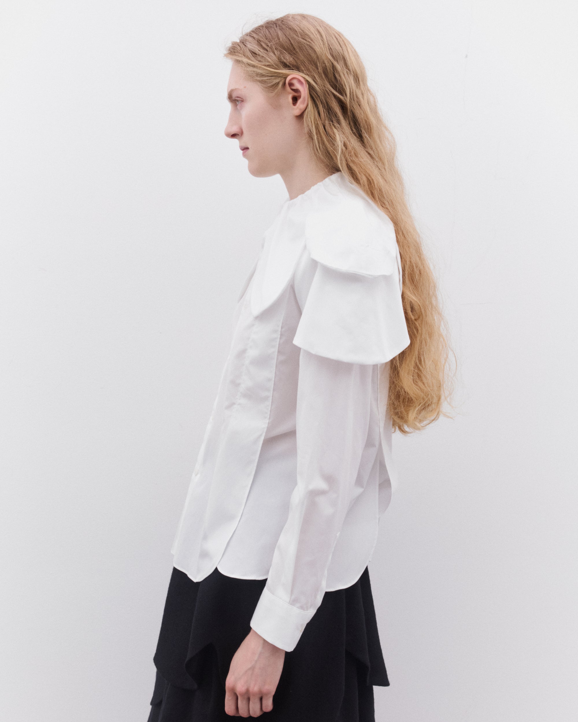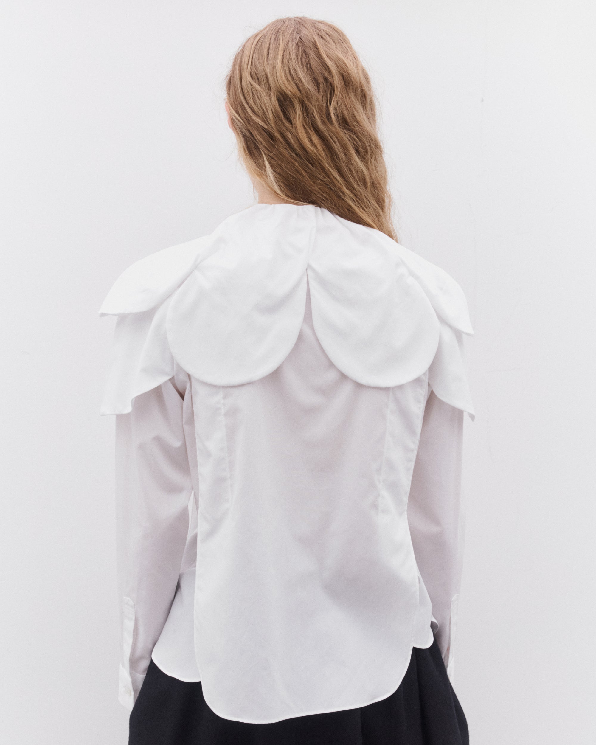 Oversized petal collarButton placketSplit seams at hemButton cuffs