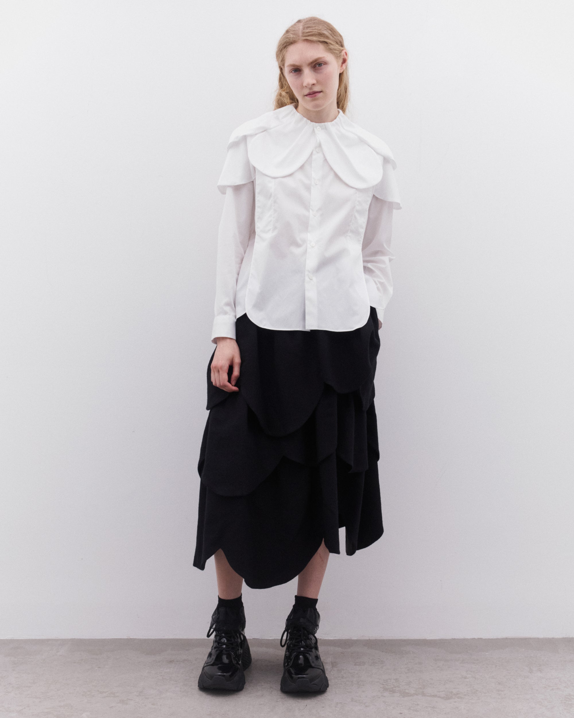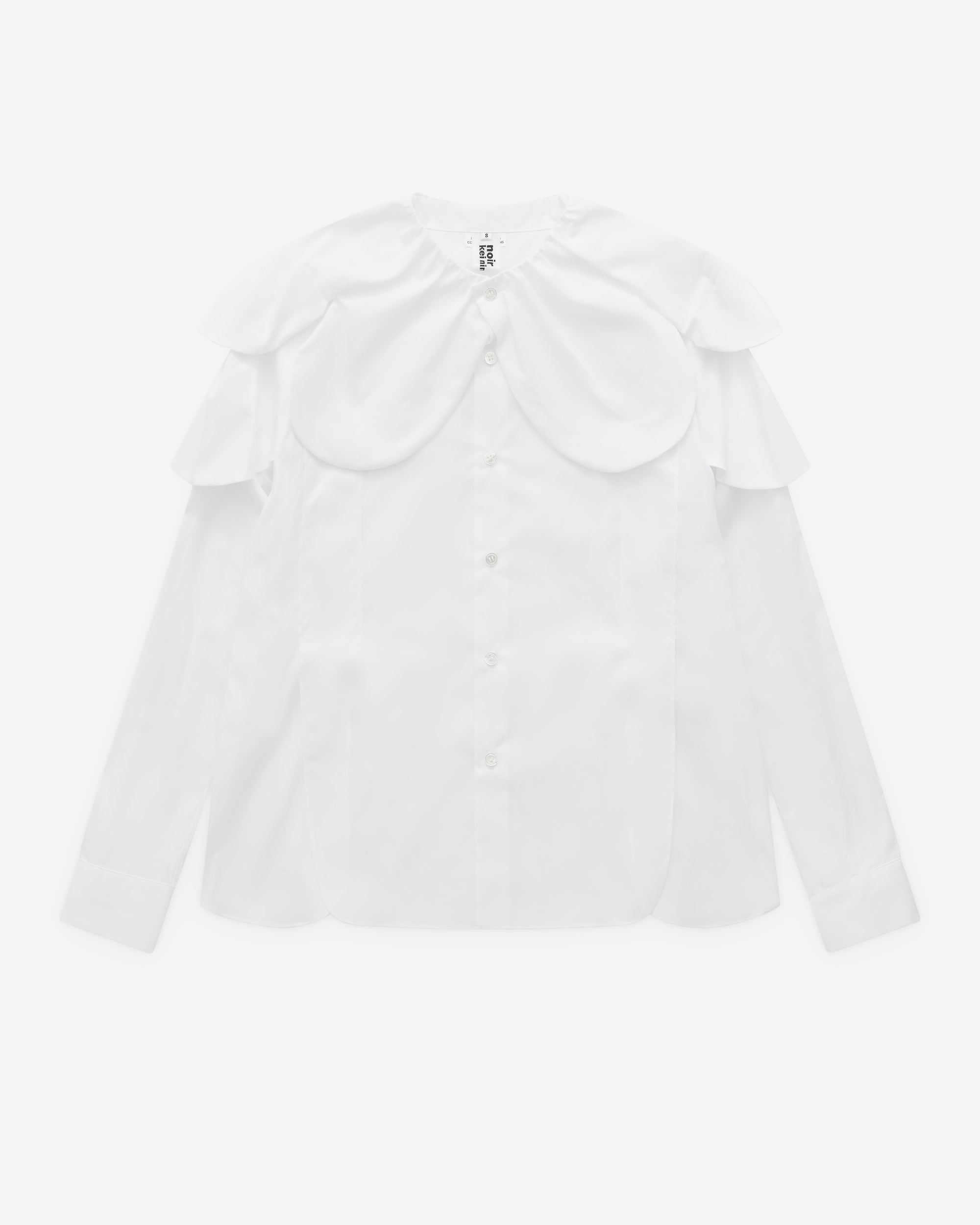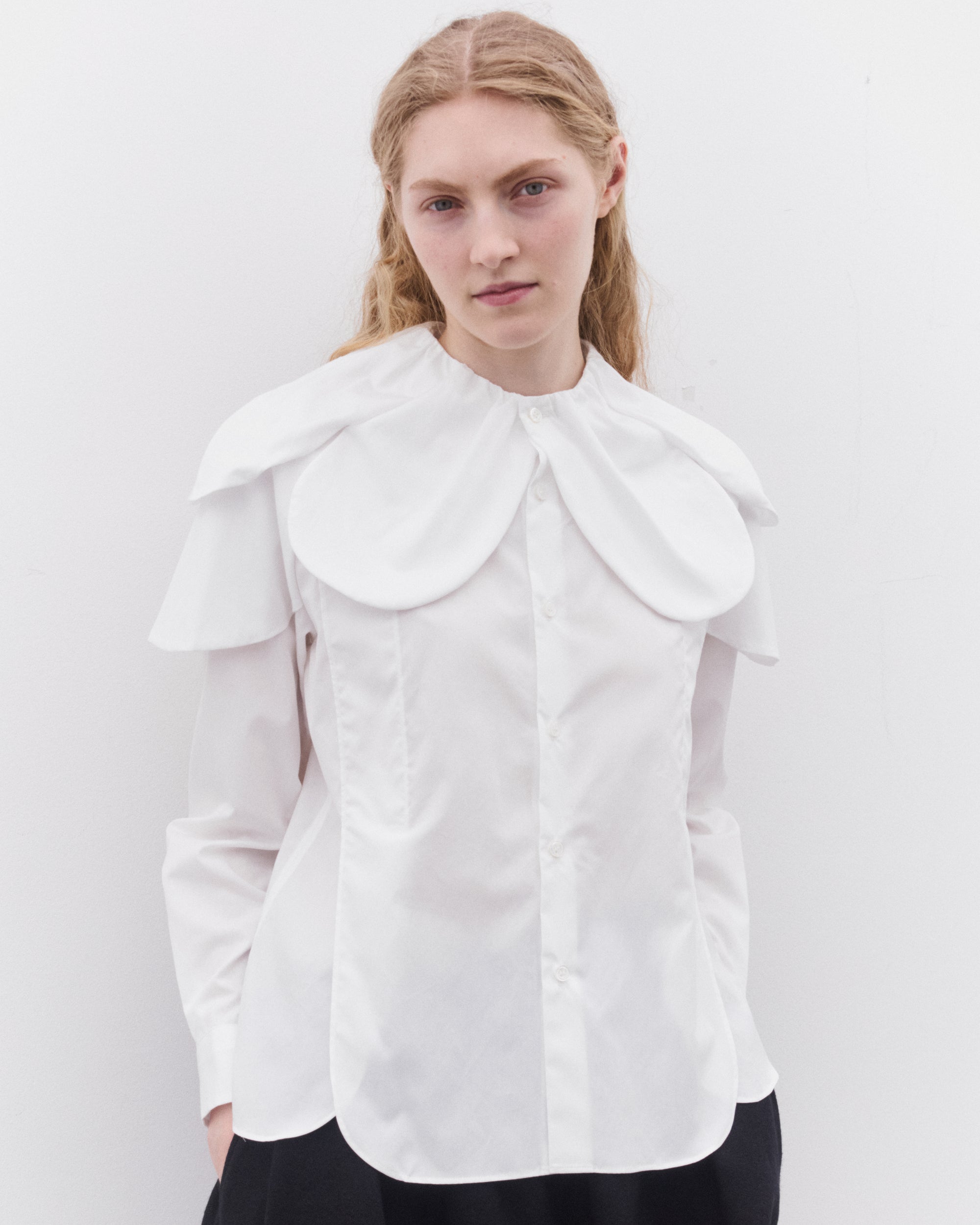 Oversized petal collarButton placketSplit seams at hemButton cuffs