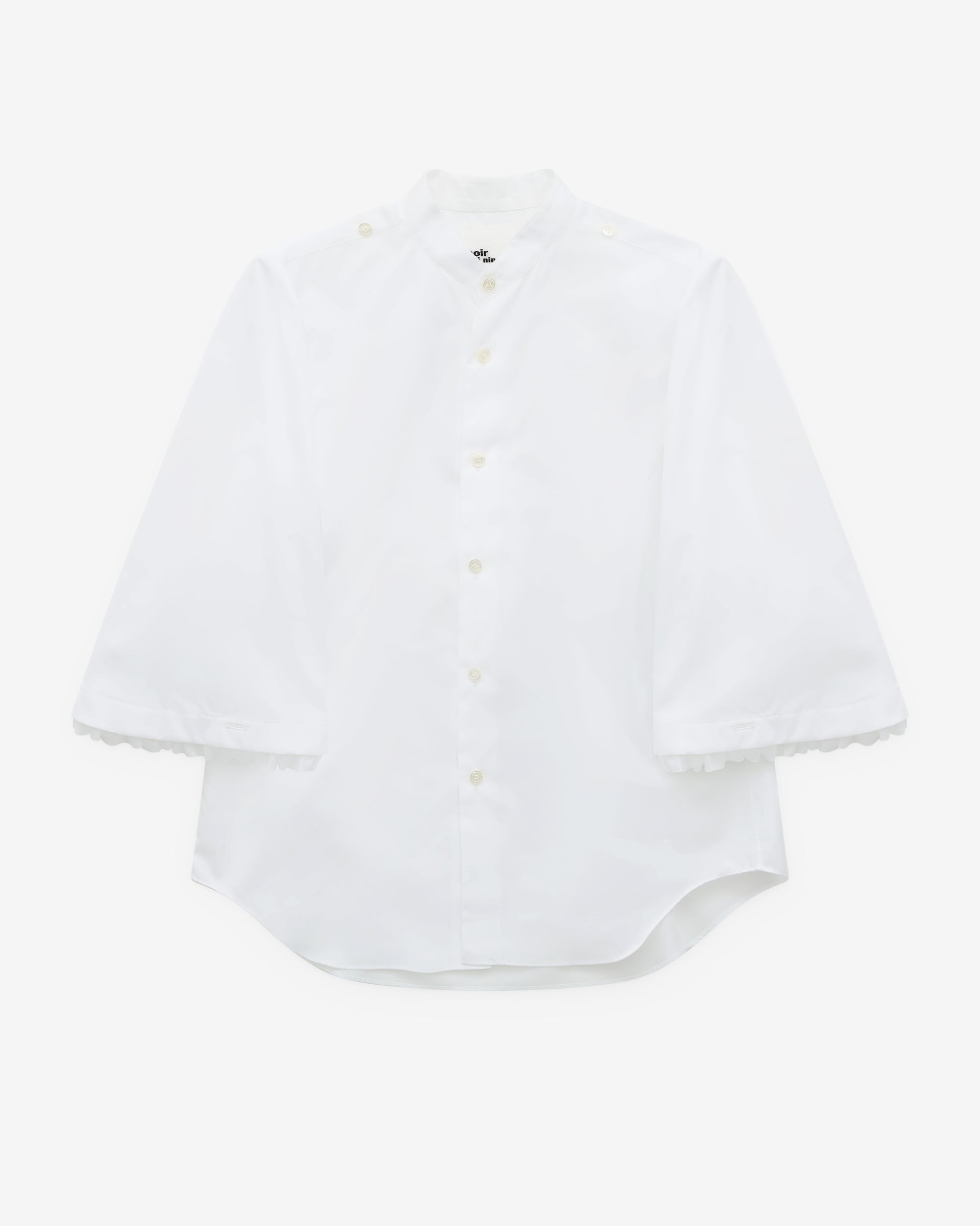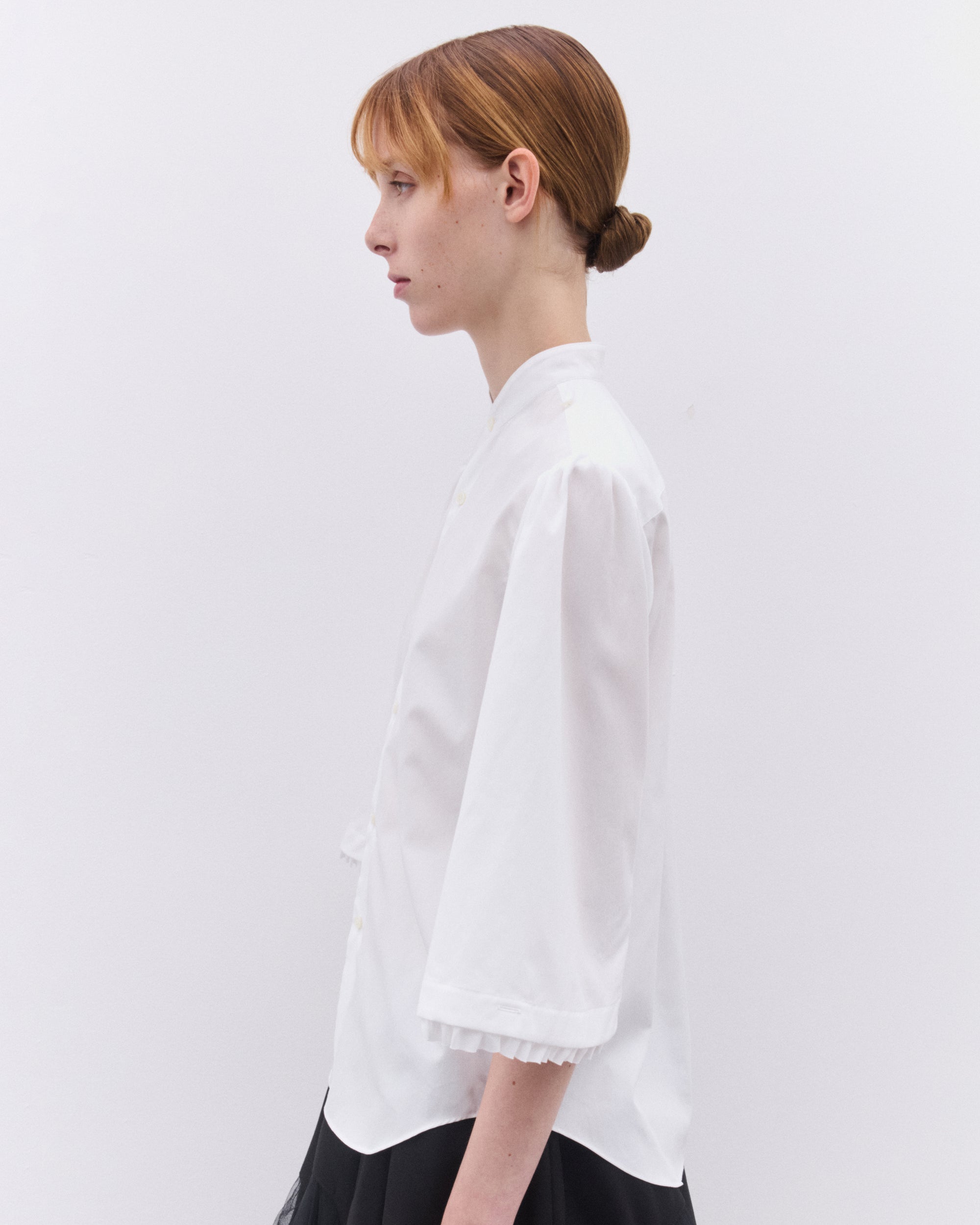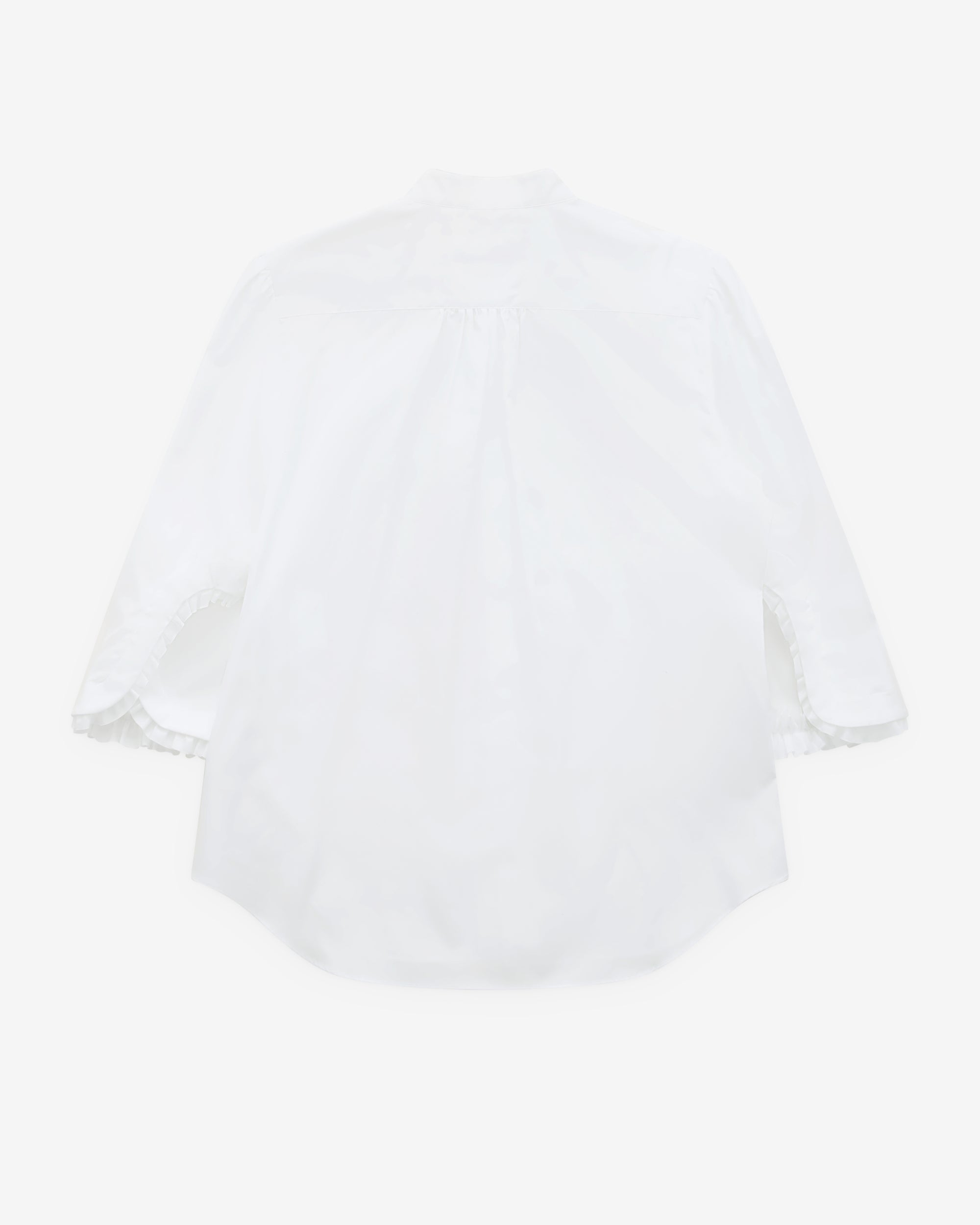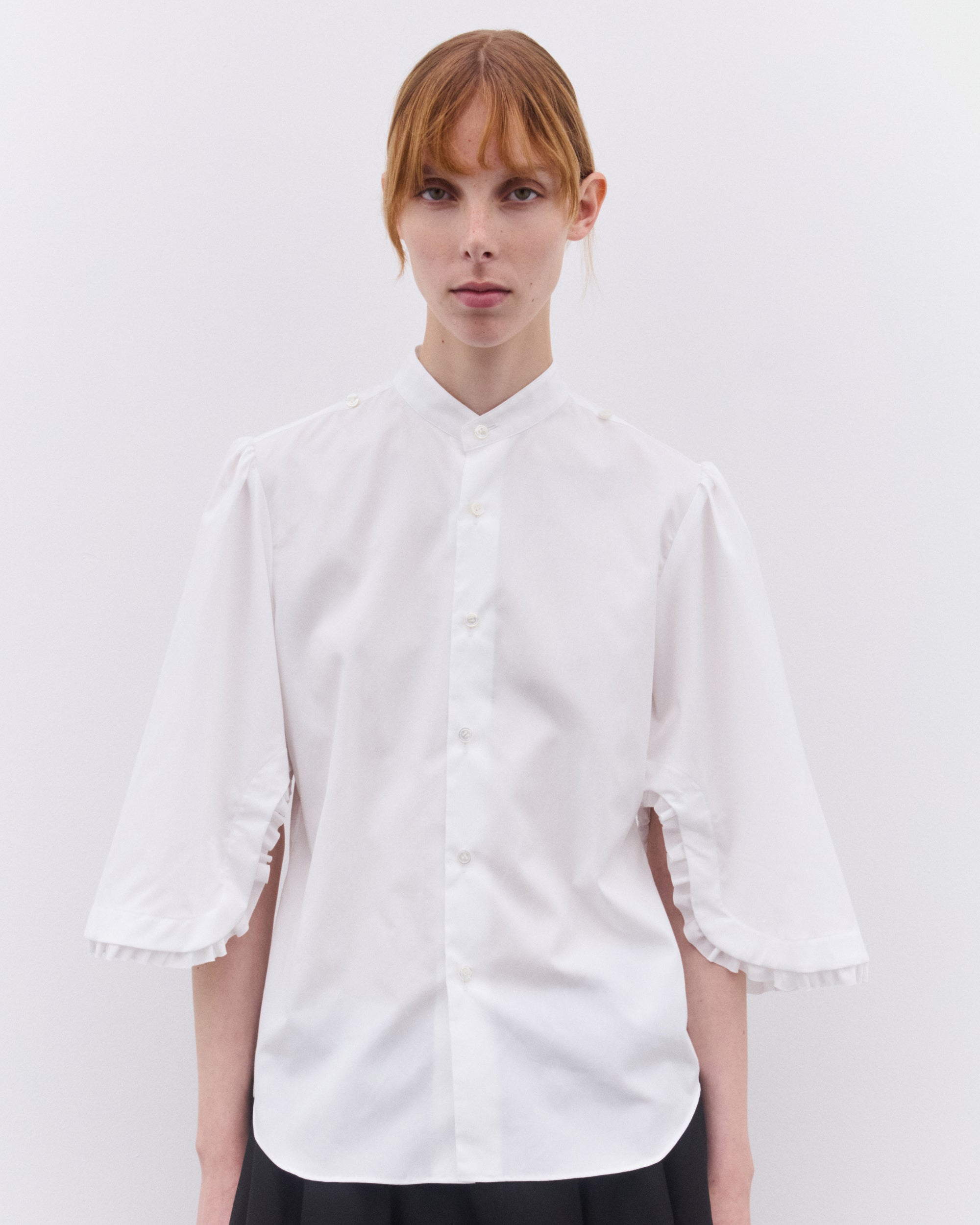 Round, collarless necklineButton fasteningWide sleeves with ruffle trimCurved hemGathered rear yoke