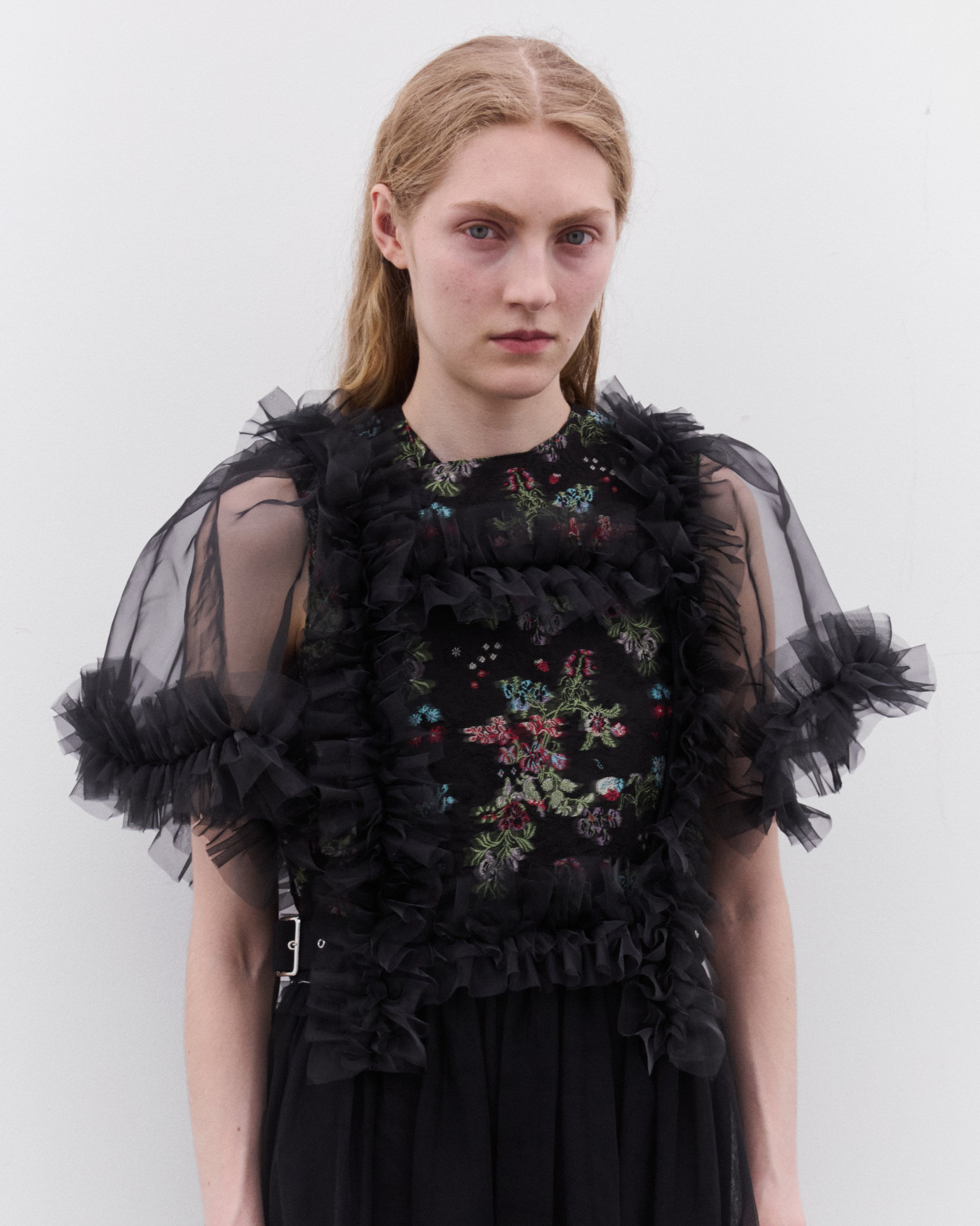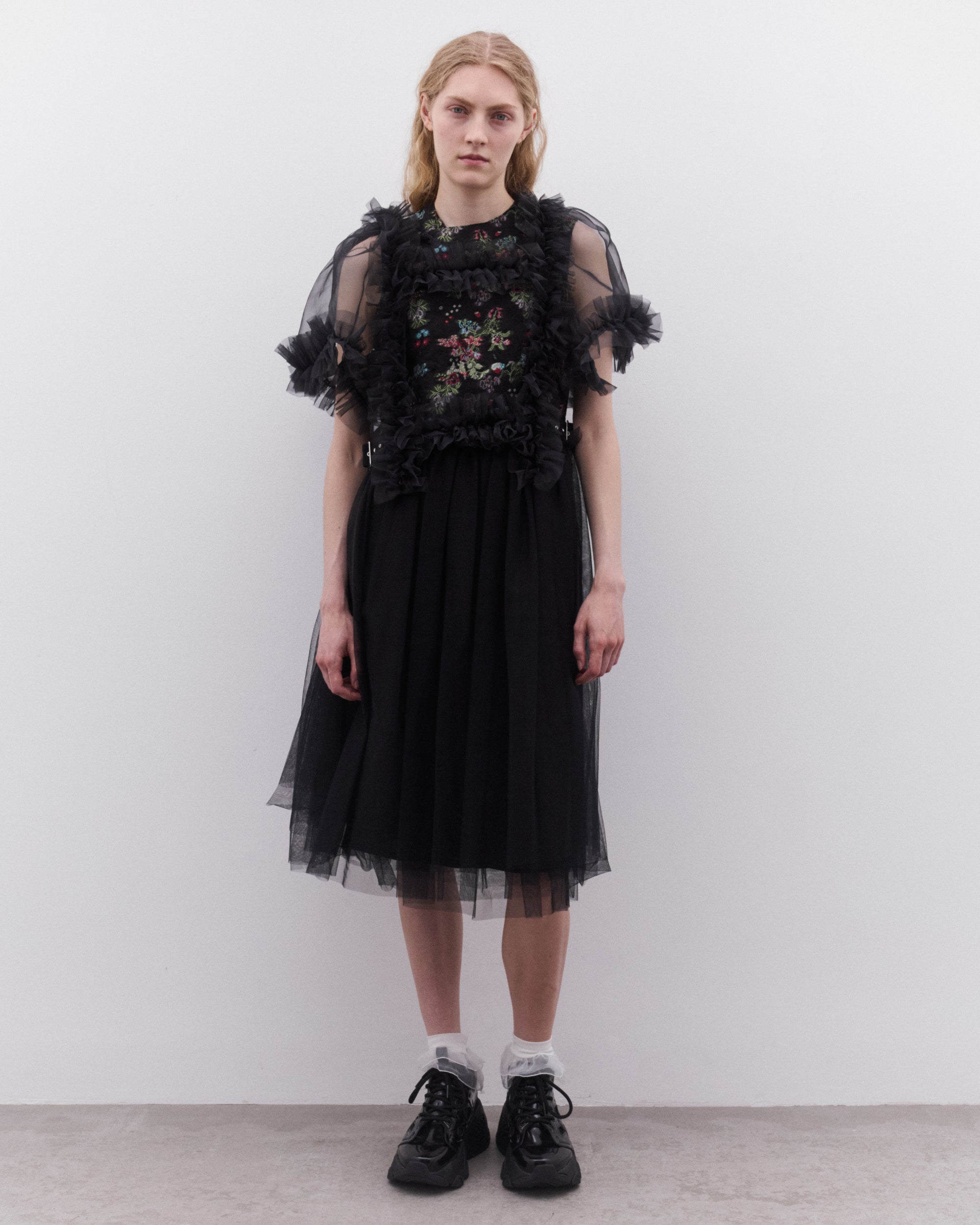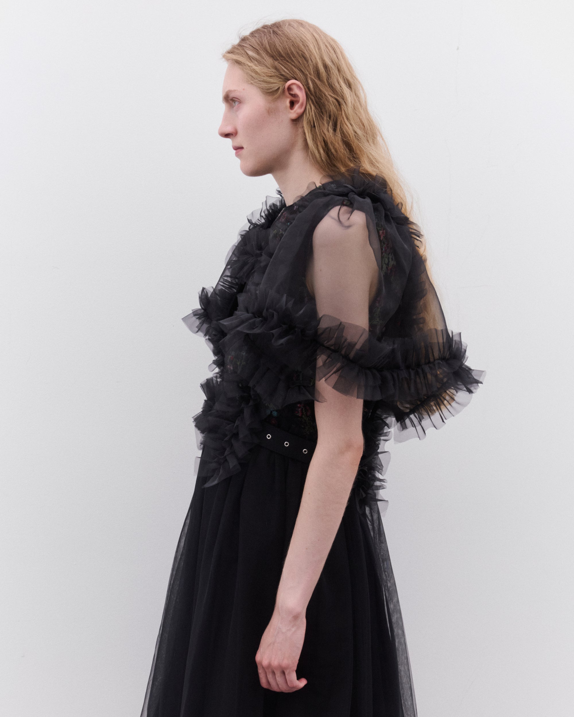 Double faced wool structureRuffle detailShort tulle sleevesSide buckle fastening