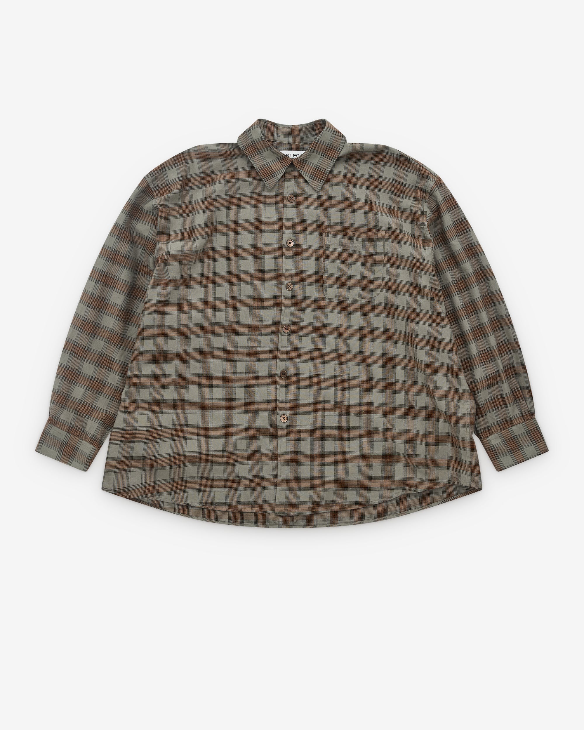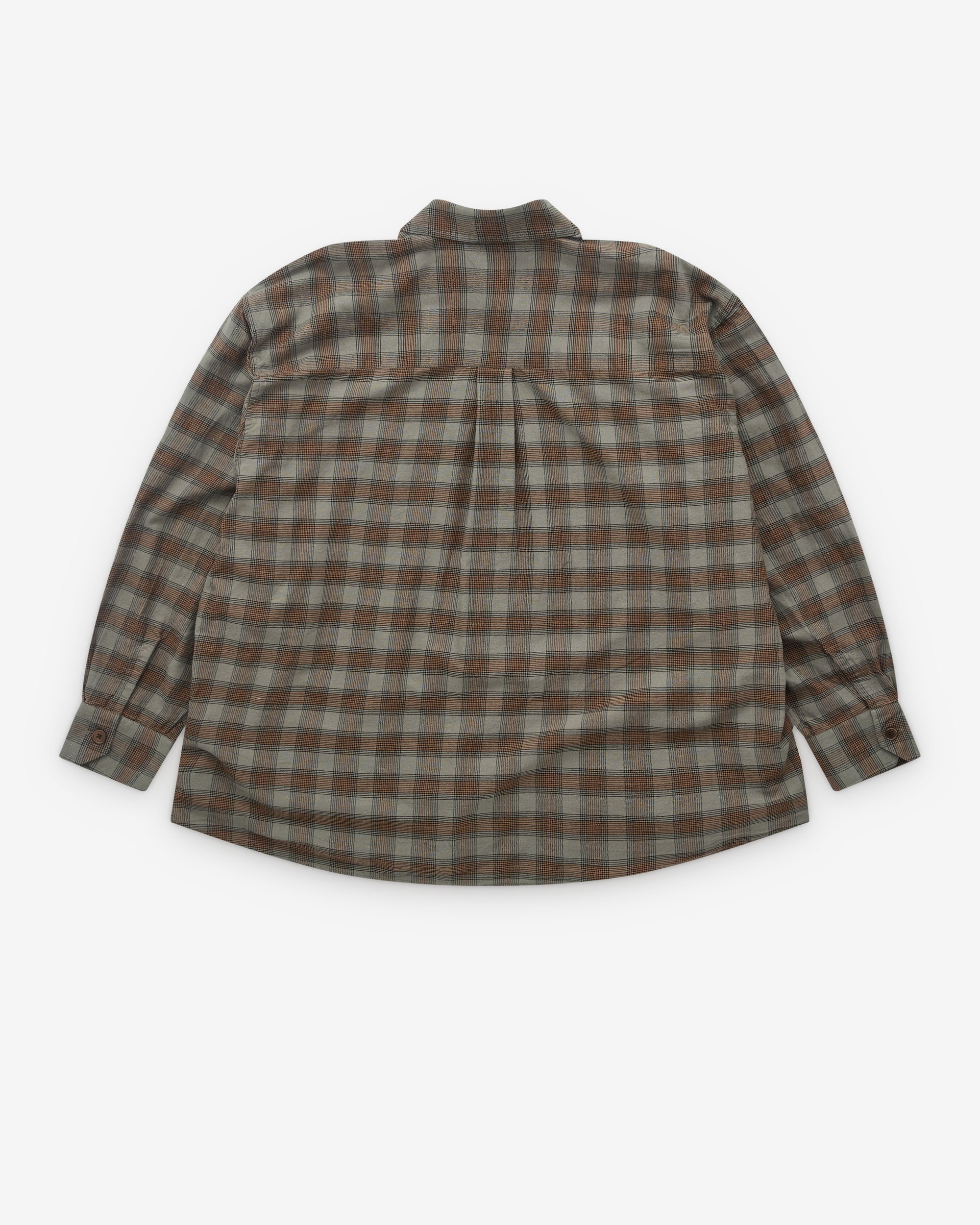 Cotton check fabricClassic shirt collarFront button closureSingle chest pocketCurved hemRear box pleat