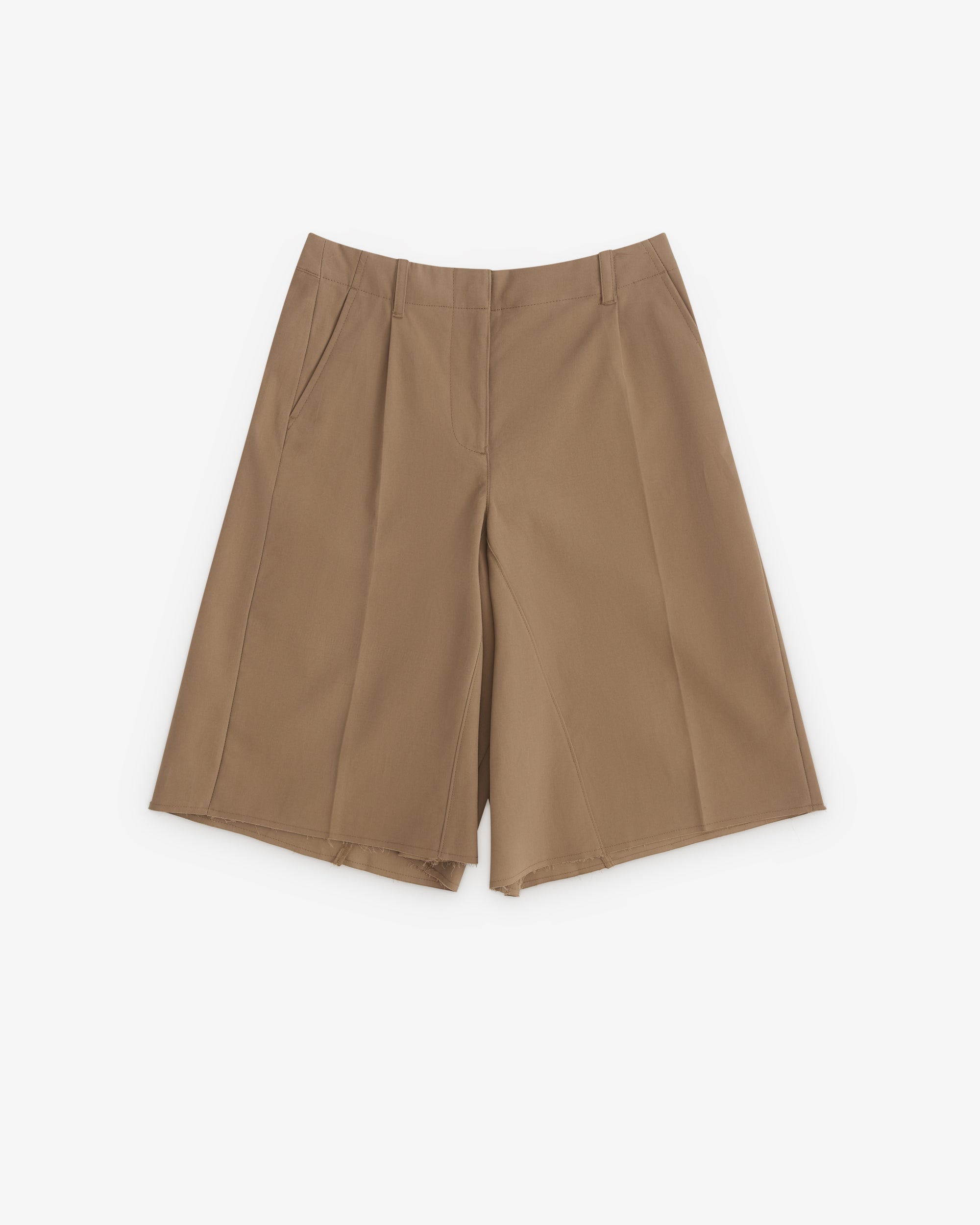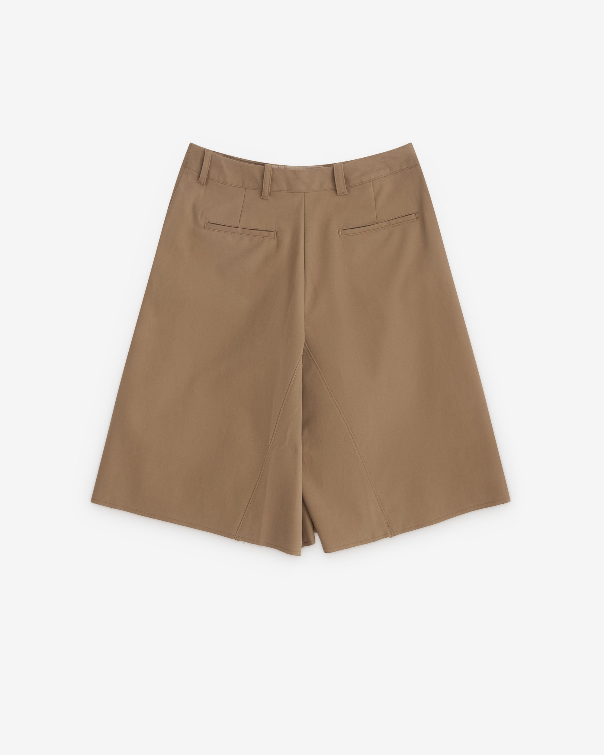 Wide A-line silhouetteKnee-length with raw hem finishFront pleatsAngled front pocketsWelt pockets at backGrown-on front waistbandPatched back waistbandInterior leg panelsGenerous, relaxed fit