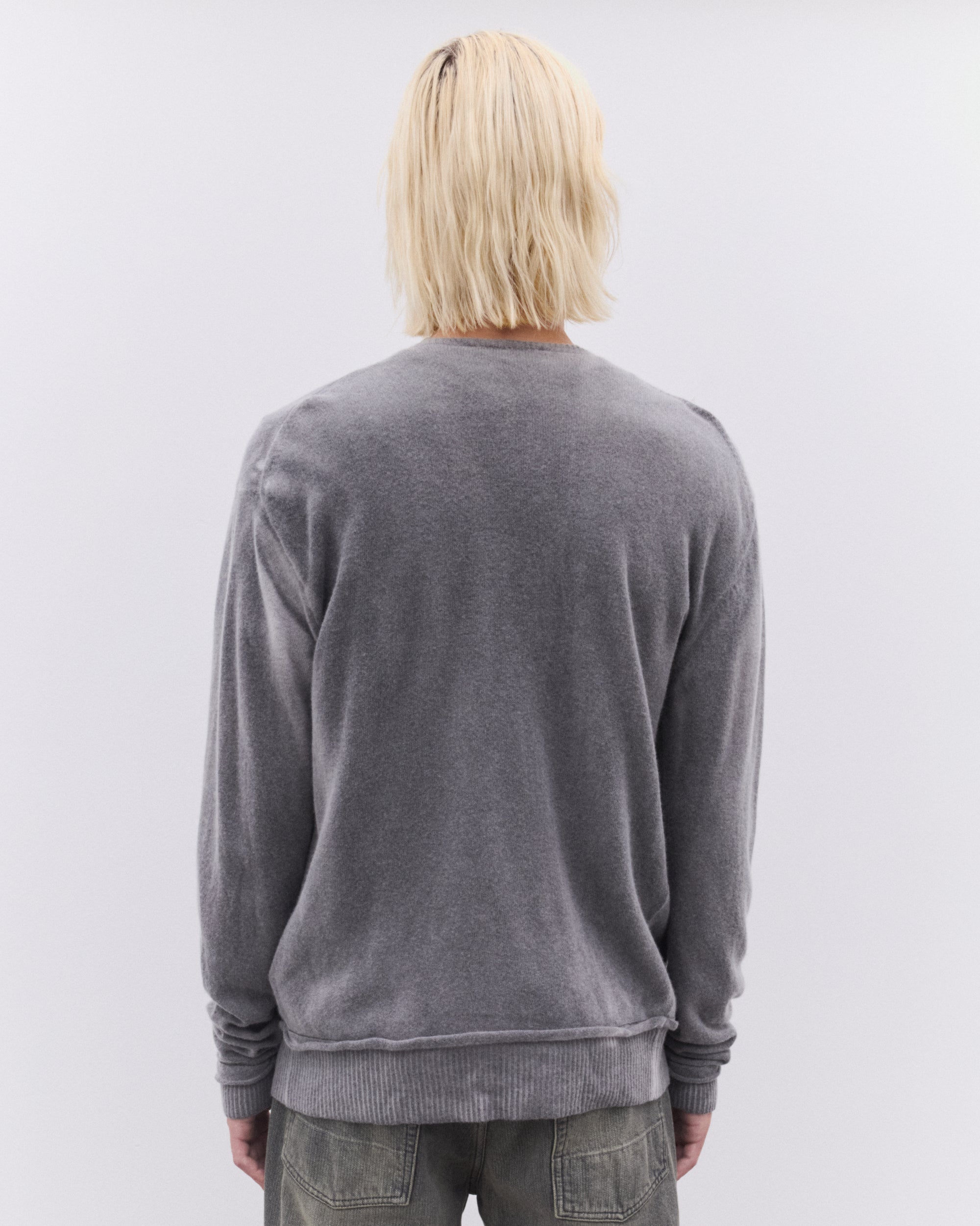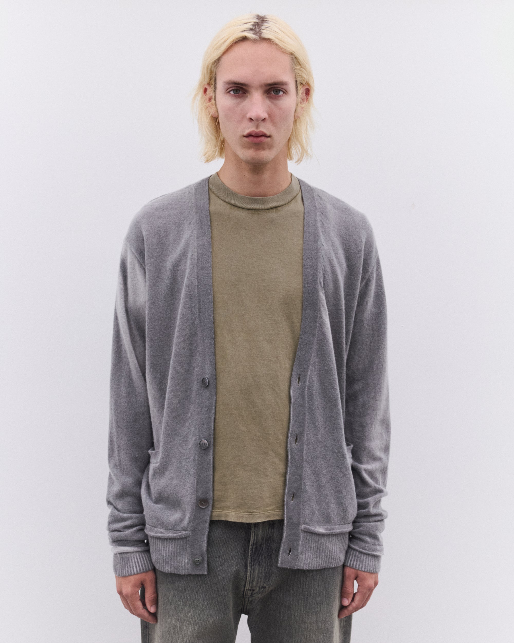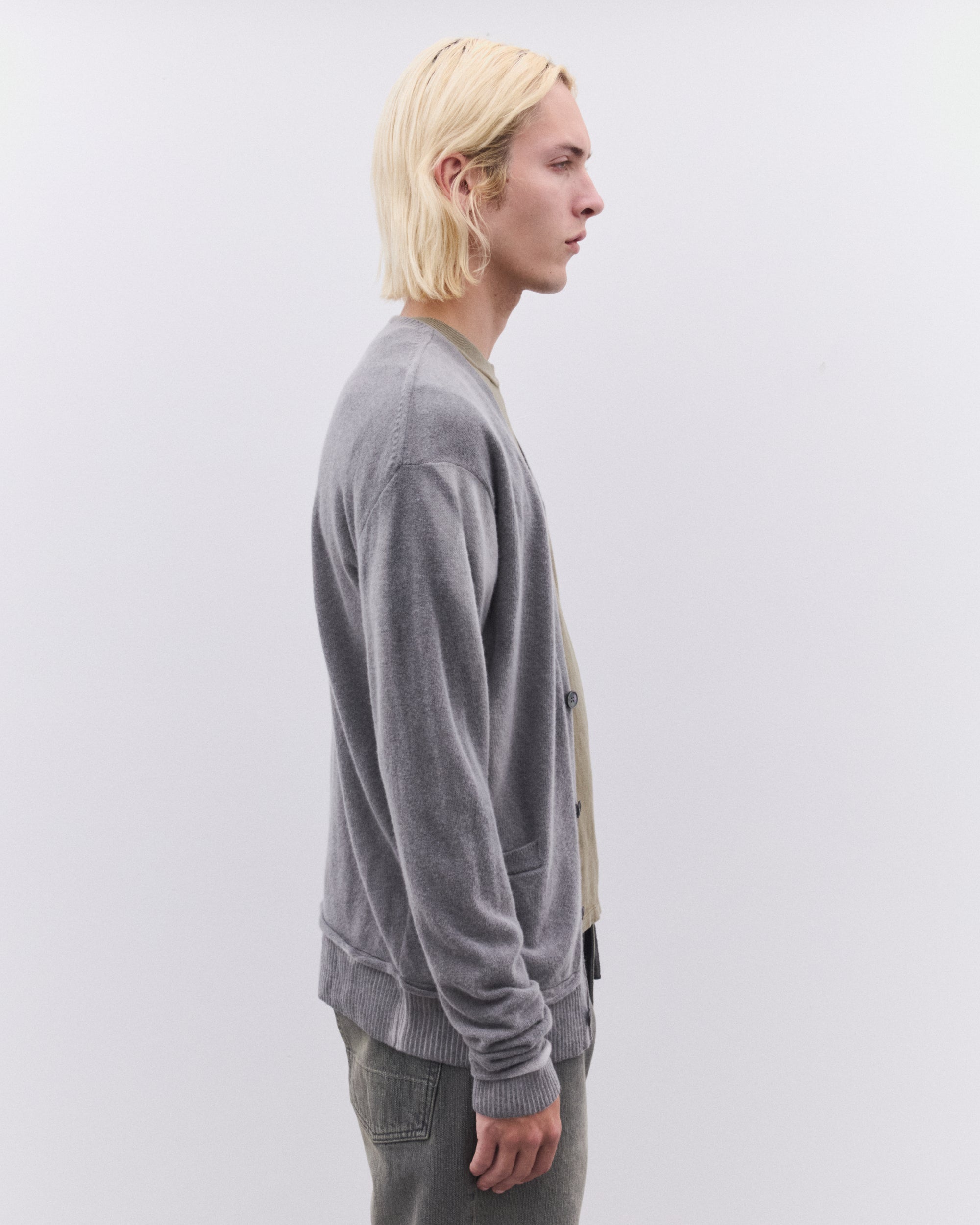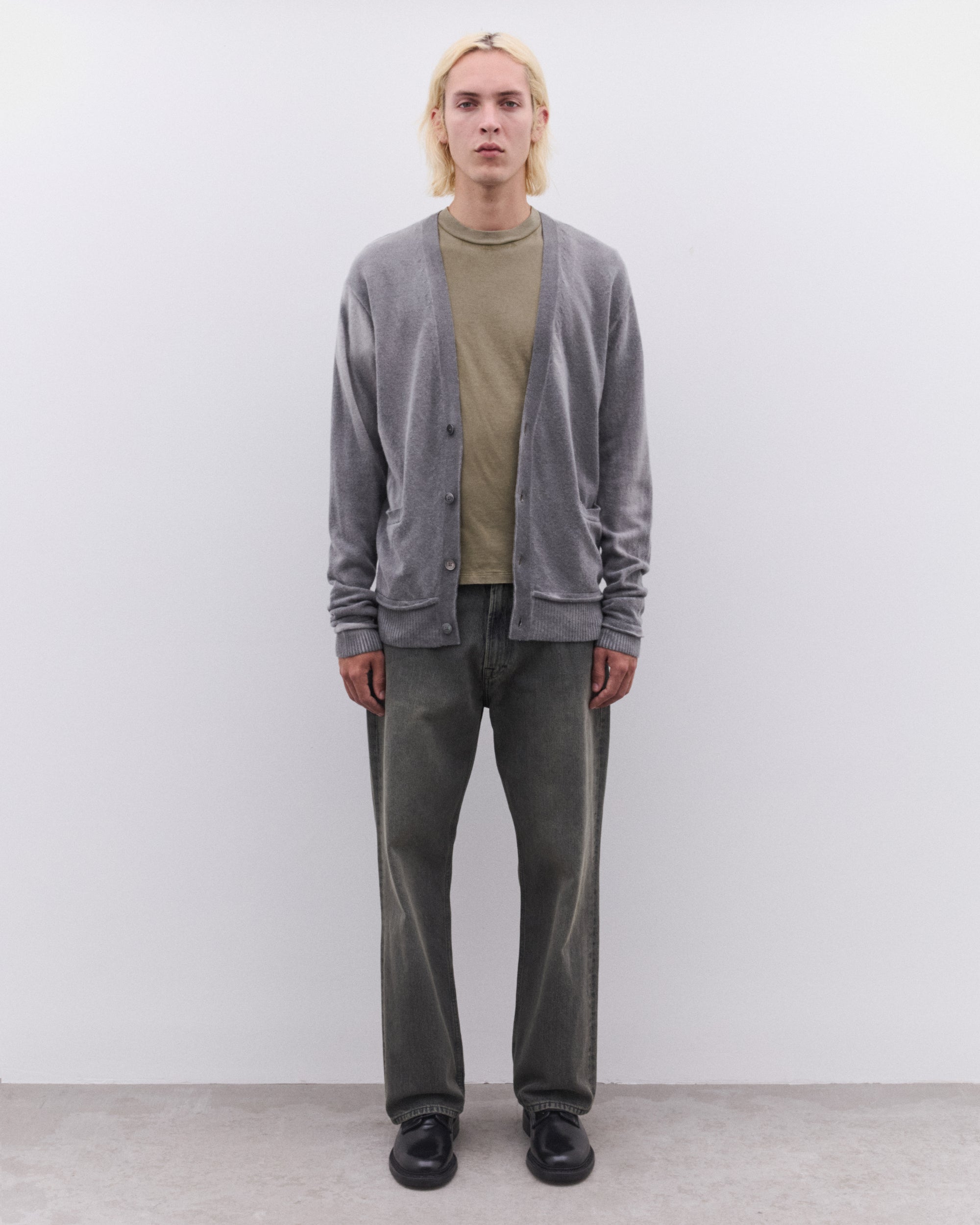 Cold spray dyeSoft textureFull needle placketV-neck collarPearl buttonsTwo front pocketsRelaxed fit