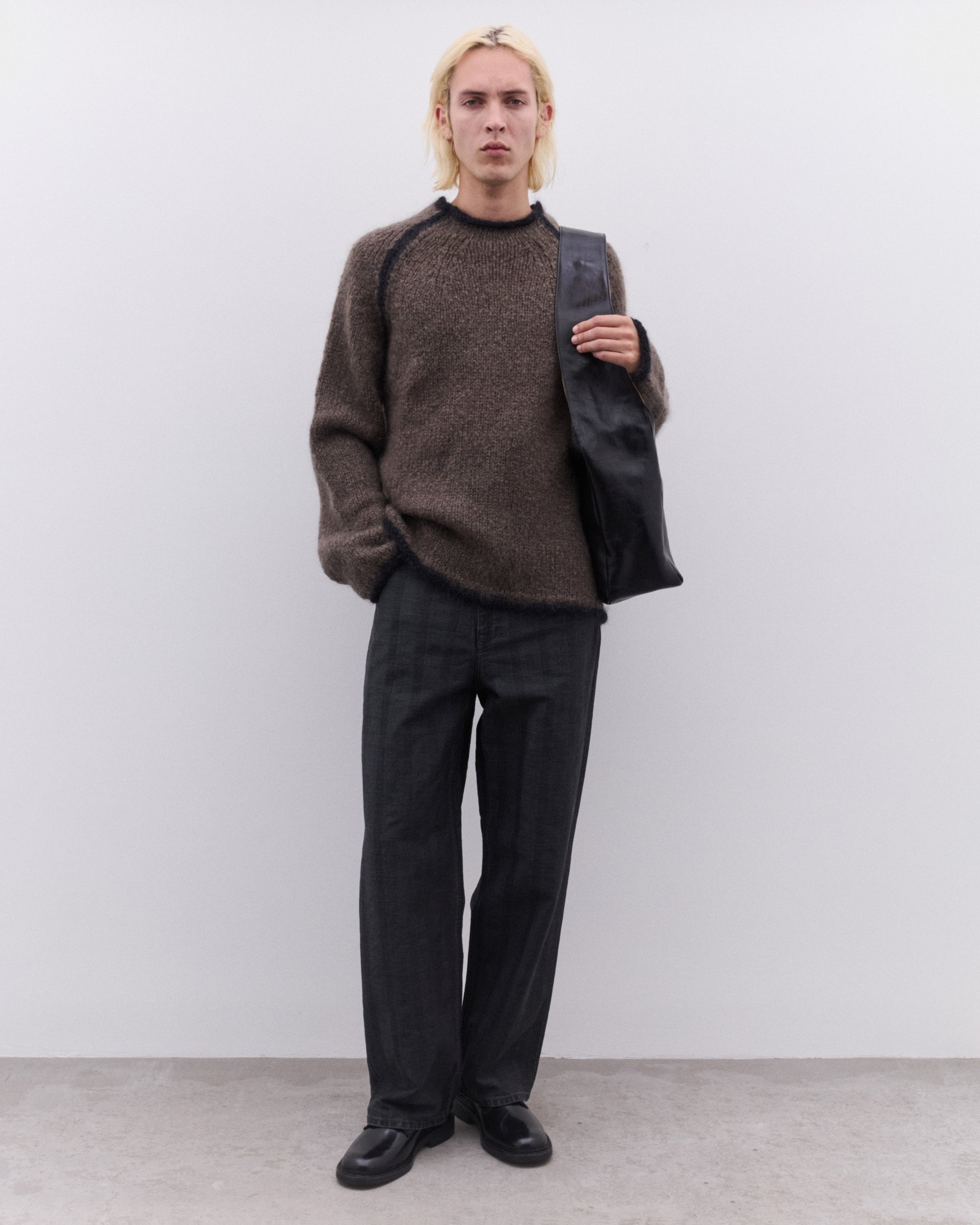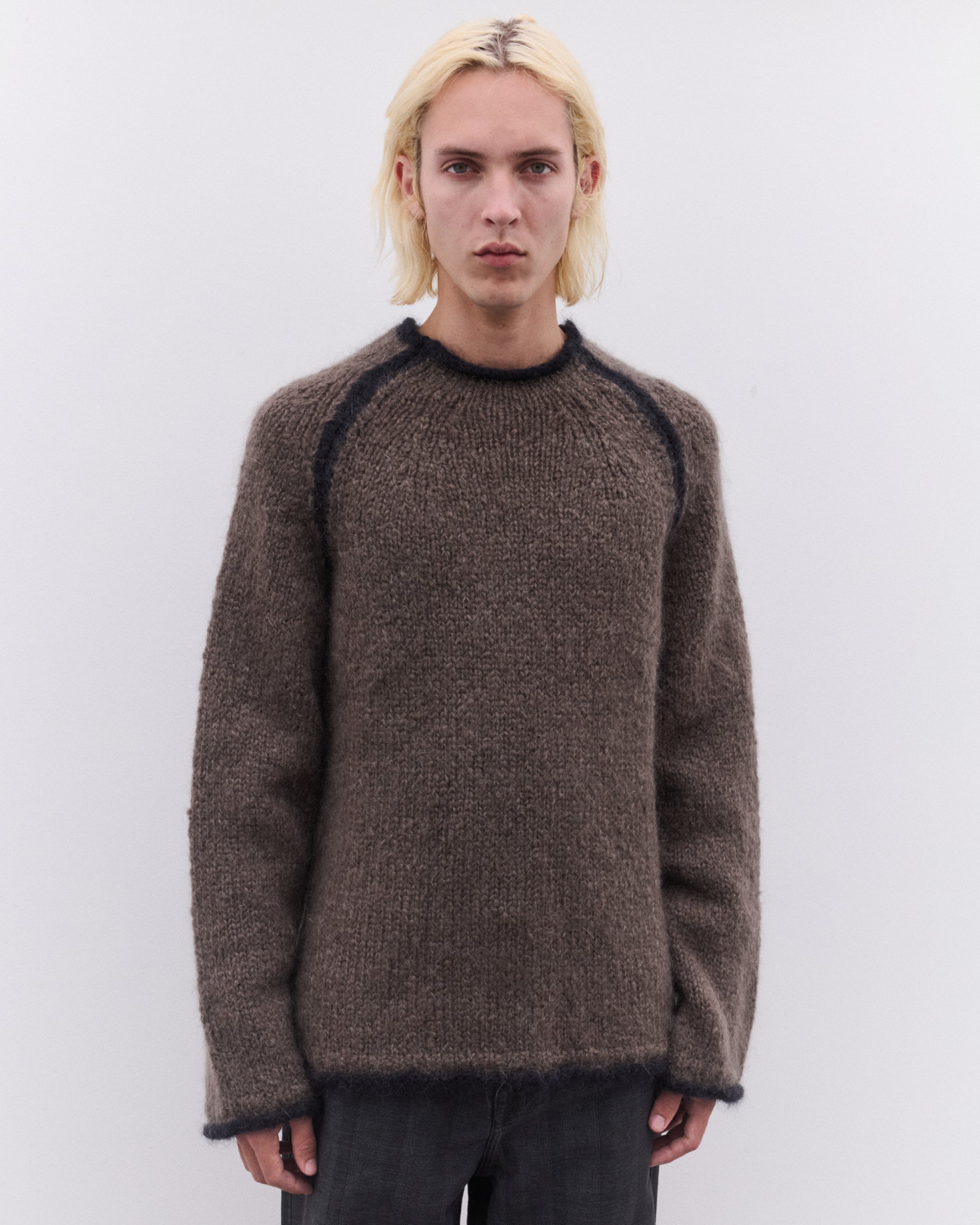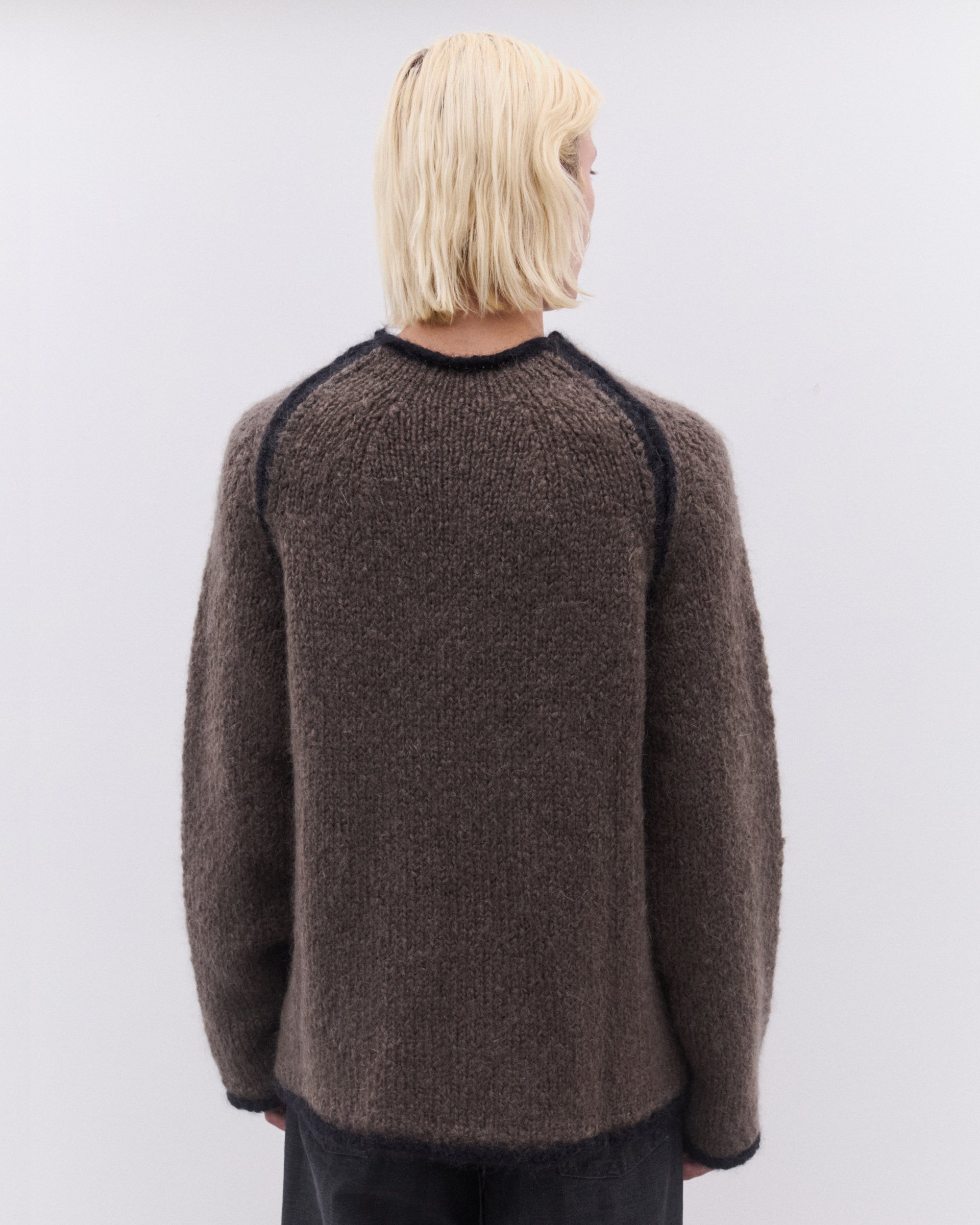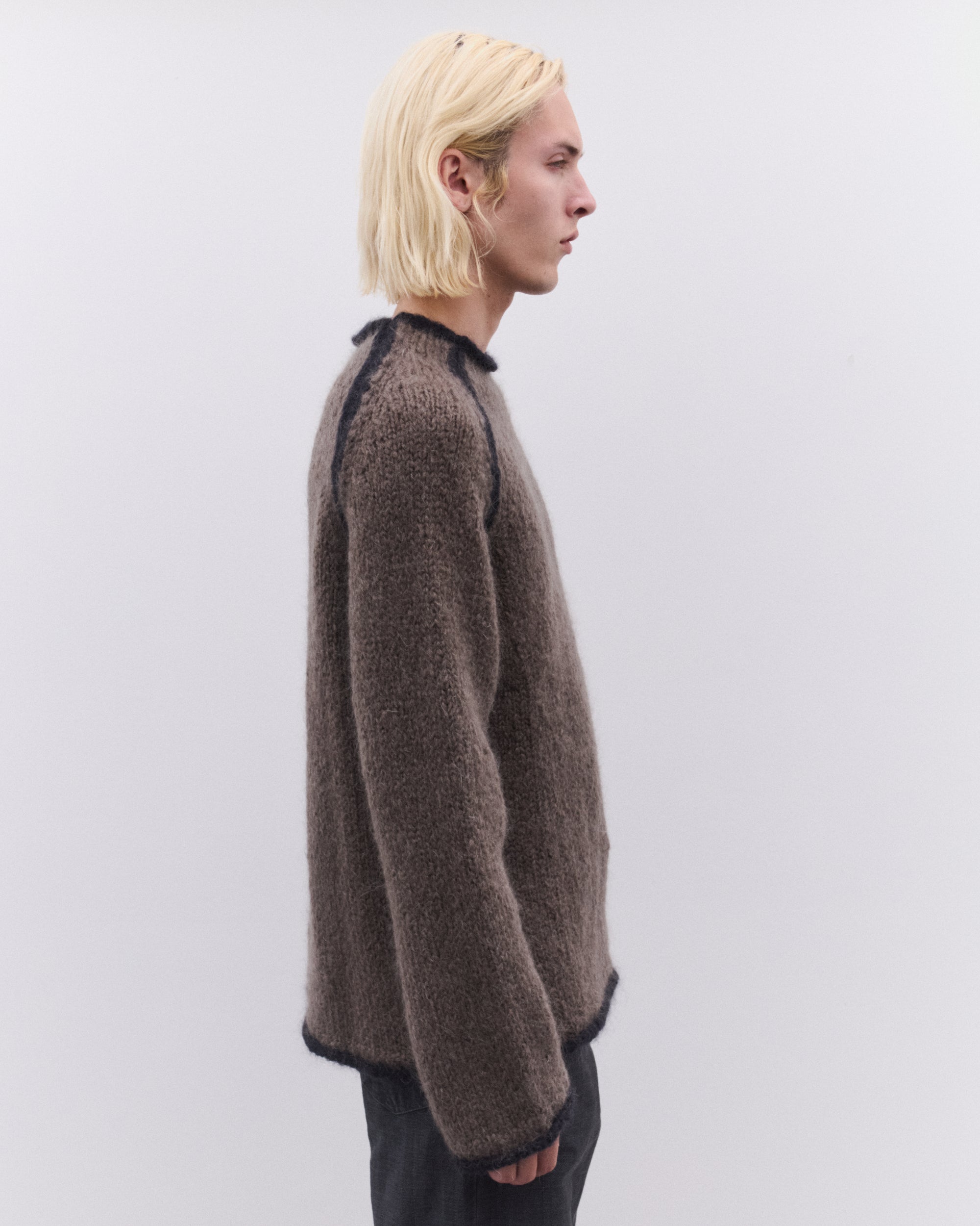 Soft mohair fabricRoundneck collarRaw edge seams and hemsLoose fitLong sleeves