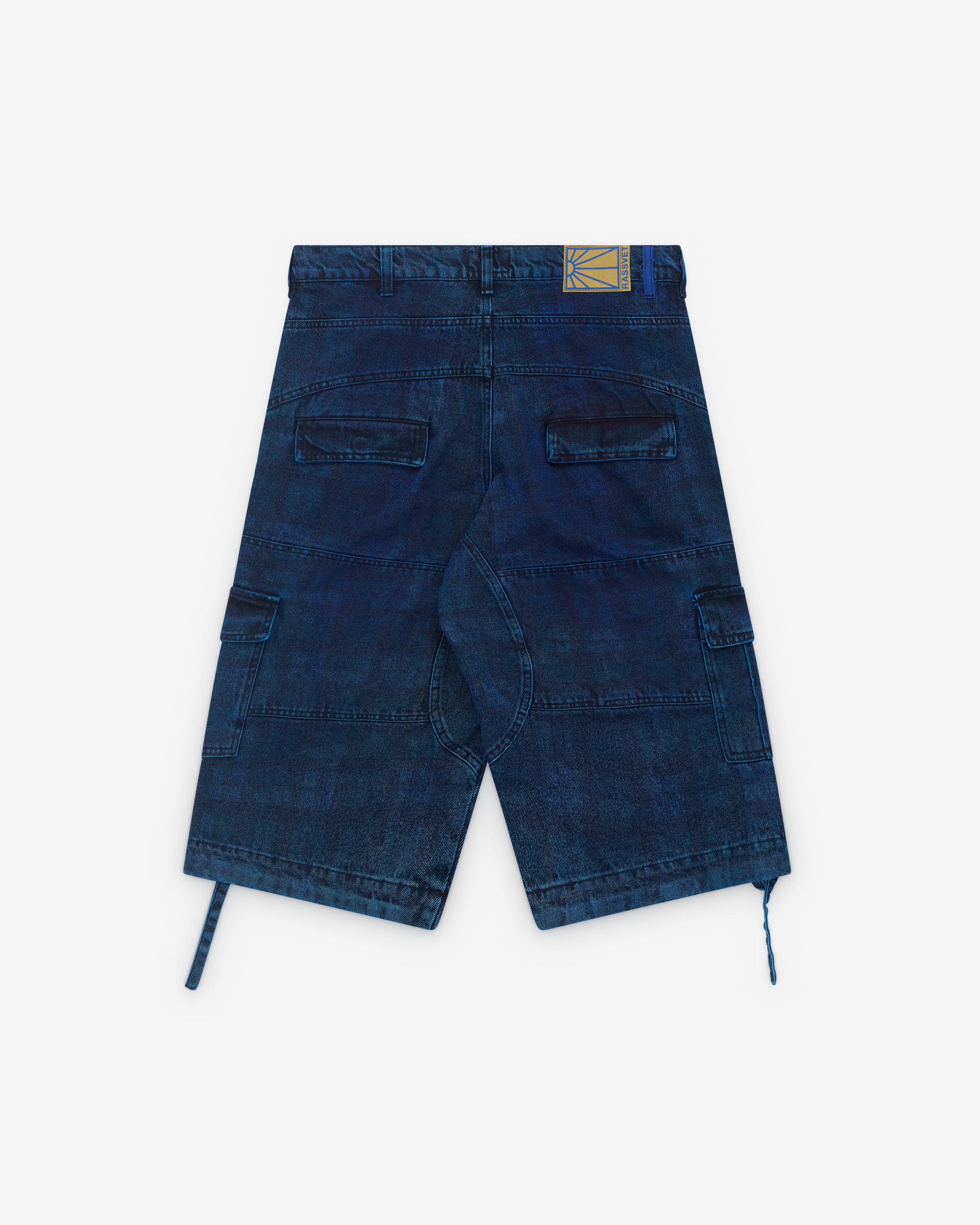 Button close waistZip flySide seam pocketsCargo leg pocketsKnee length Graphic patch at waistLoose fit