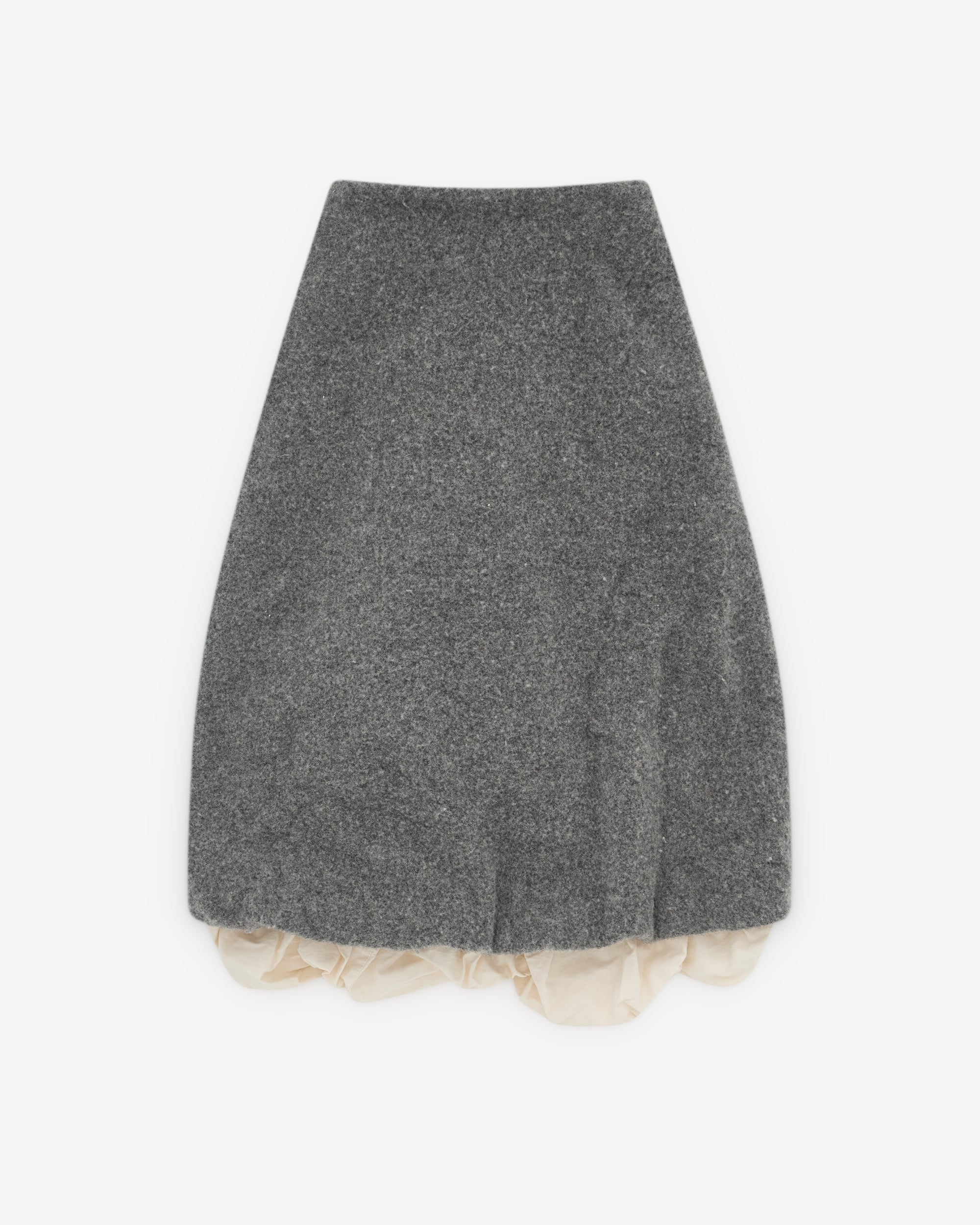 Asymmetric wrap closureGathered, double layerButton fasteningMid lengthSide seam welt pockets