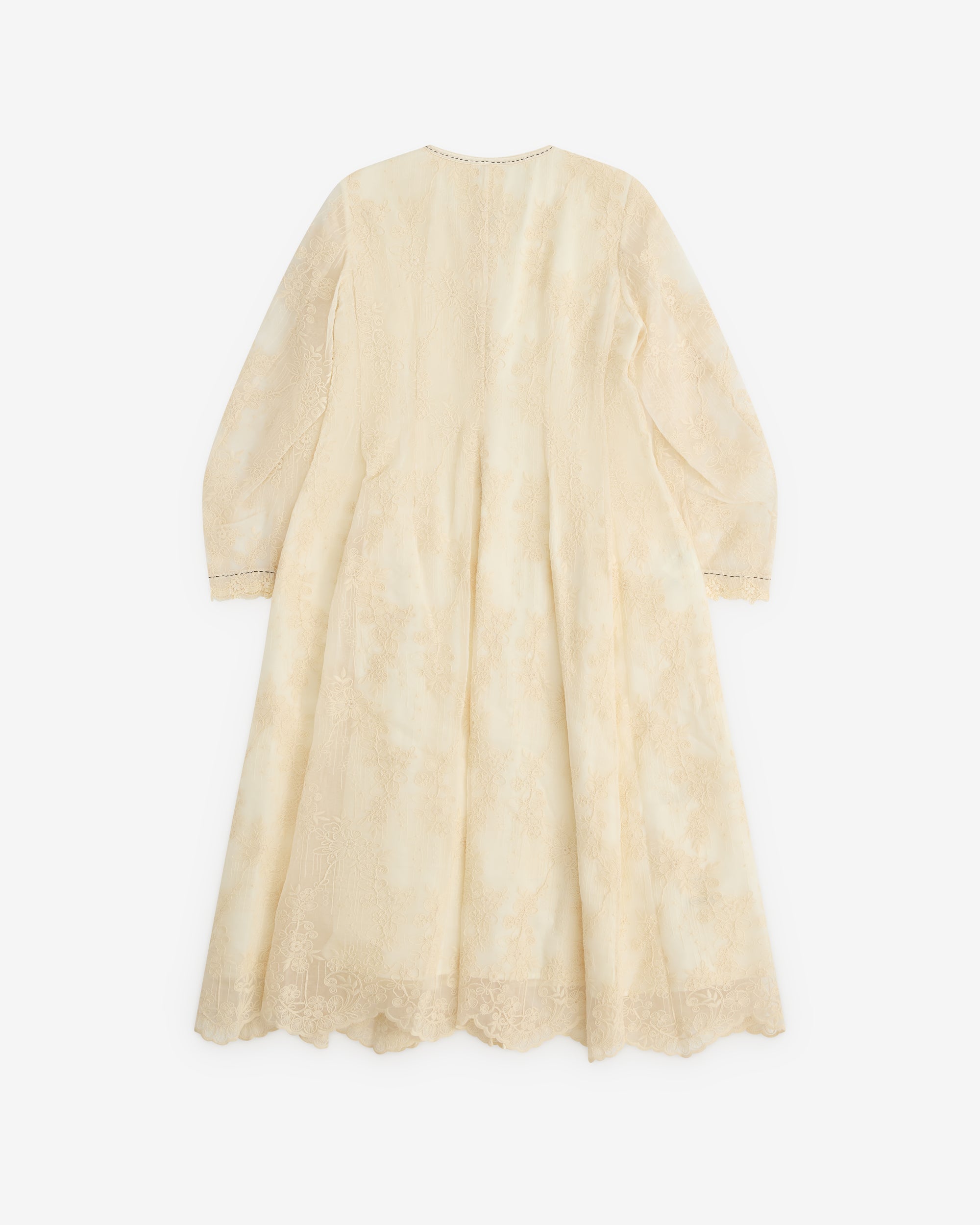 Round neckLace overlayContrast top stitchingA-line silhouetteButton fasteningCinched waistPanelled construction