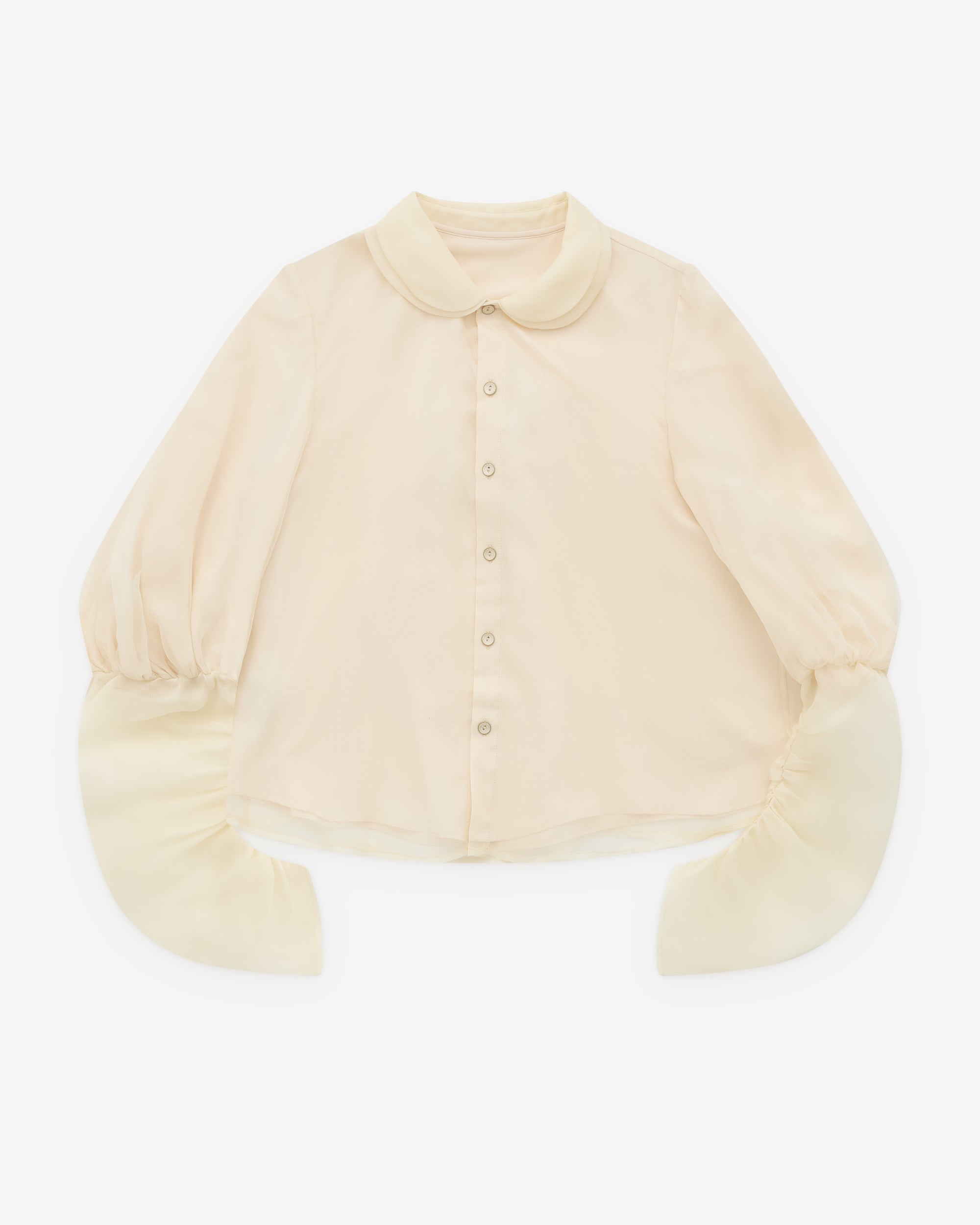Double layer round collarButton closureCurved hemGathered detail at elbowRear pleated yoke
