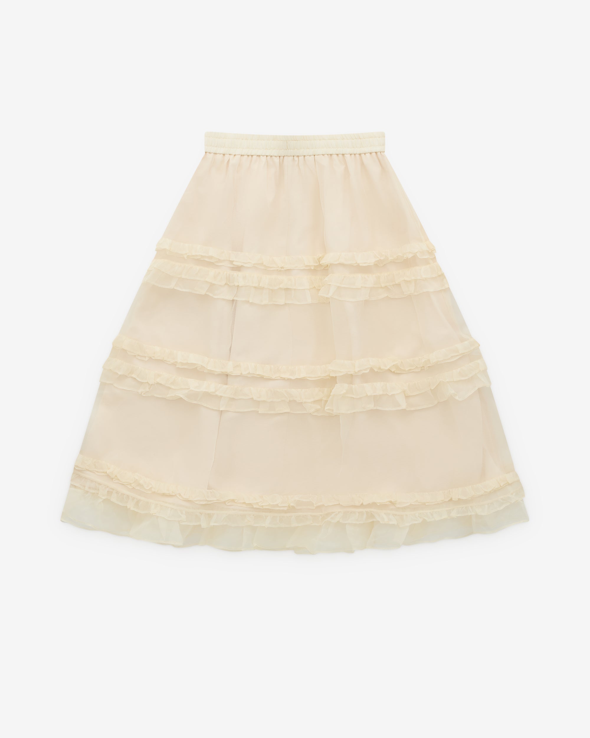 Elasticated waistFrill trimmed tiered constructionMid-lengthA-line silhouette