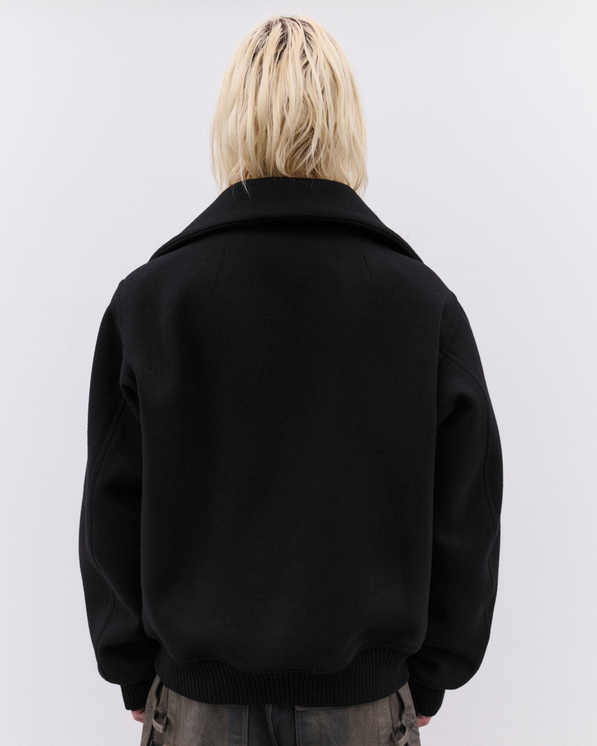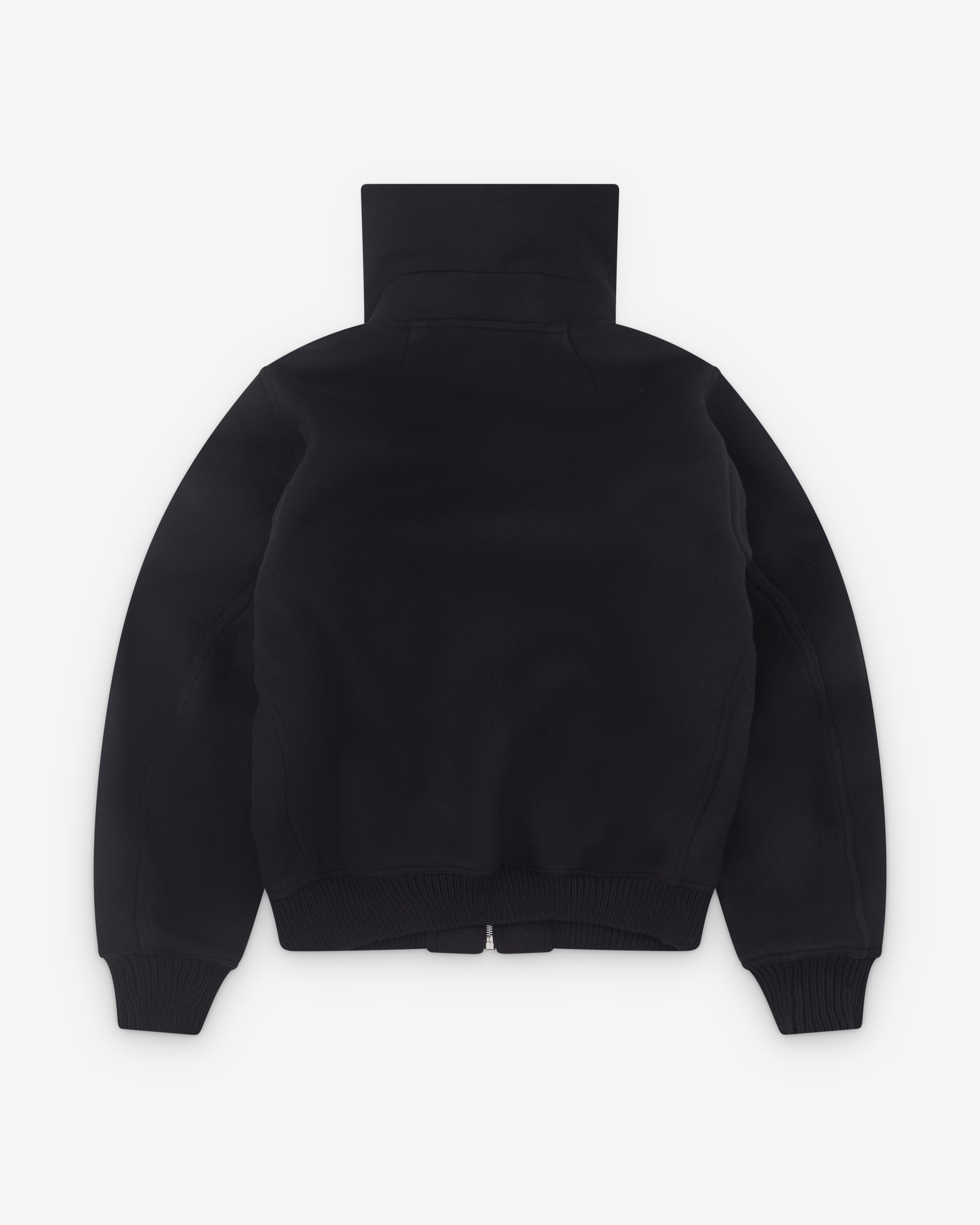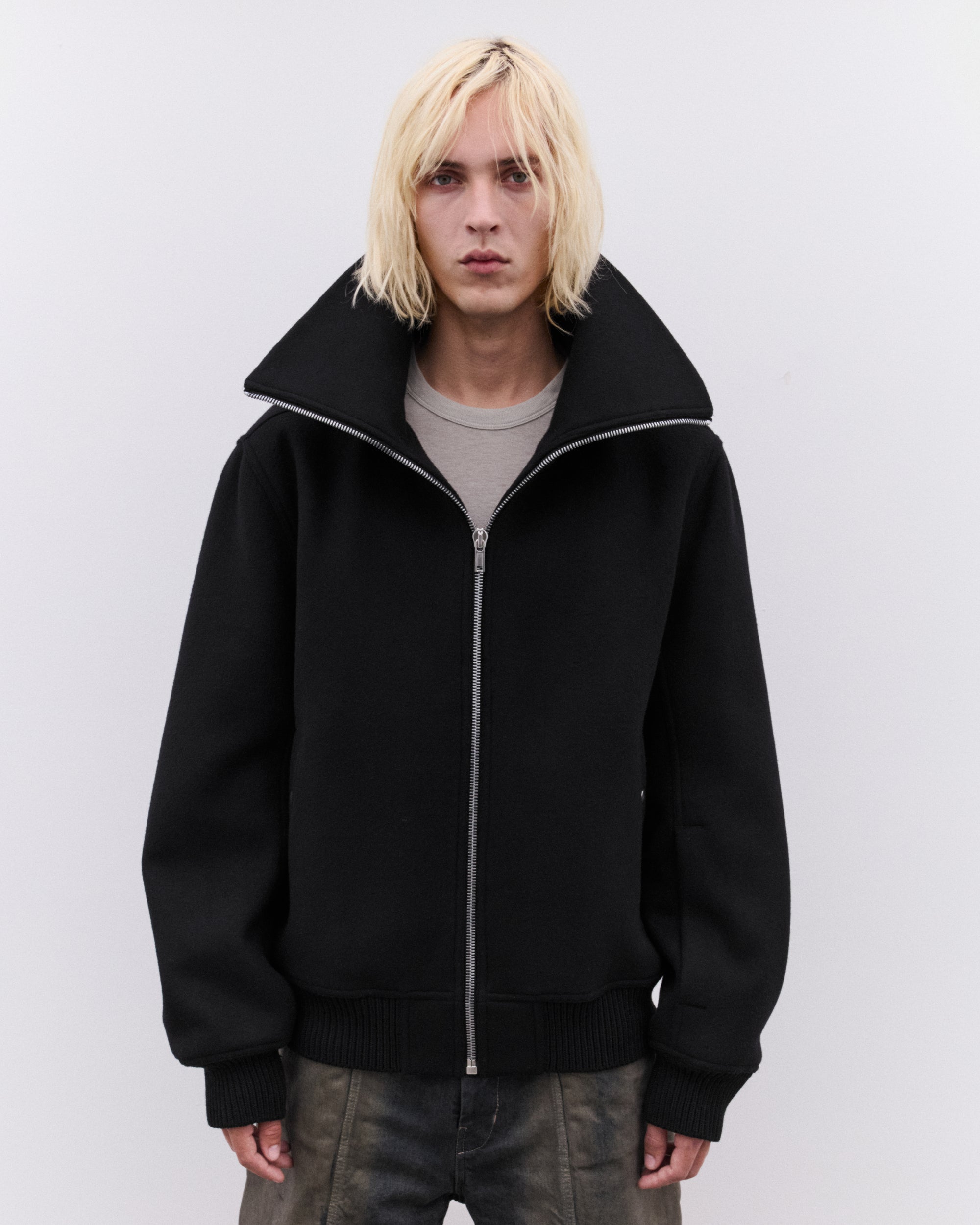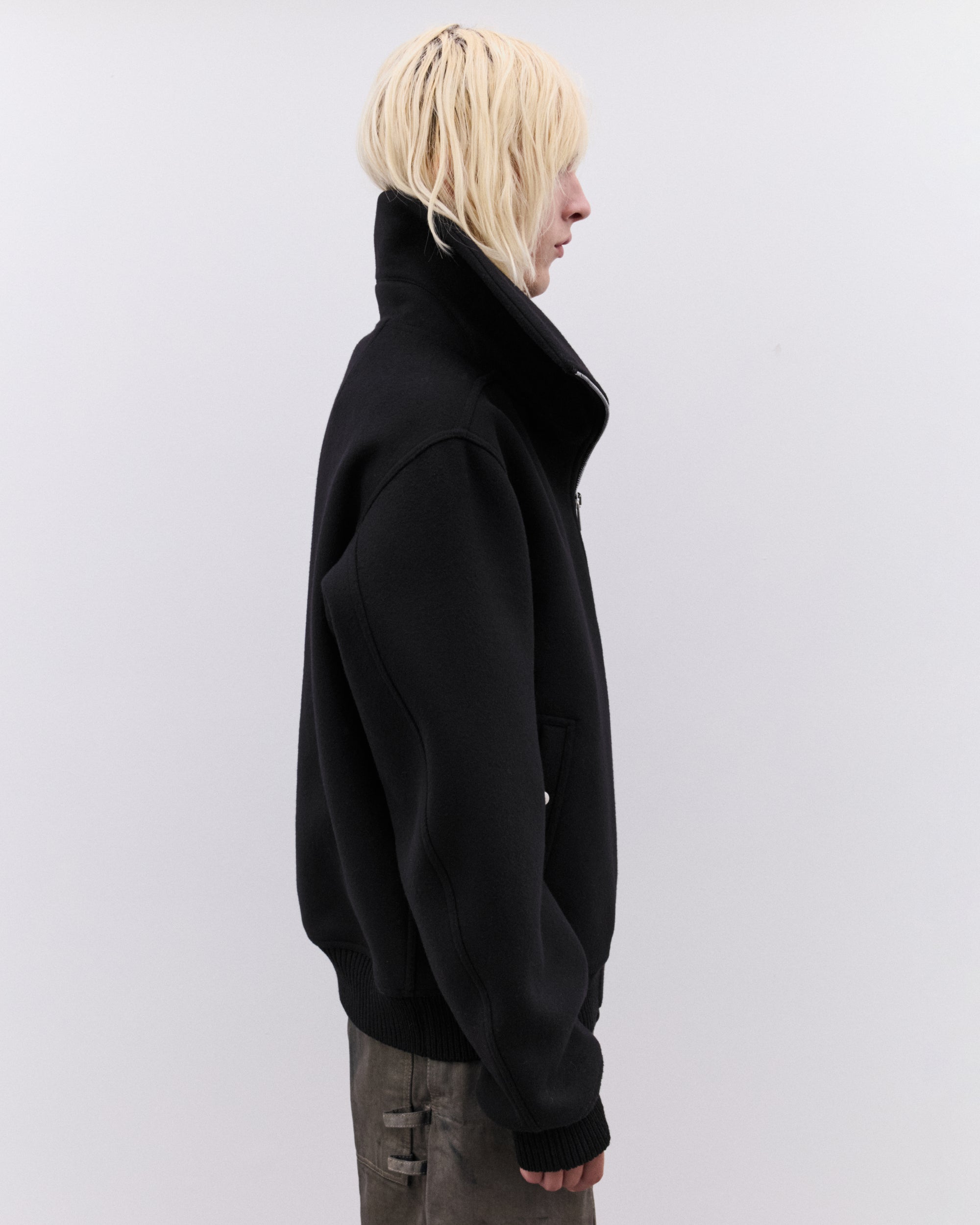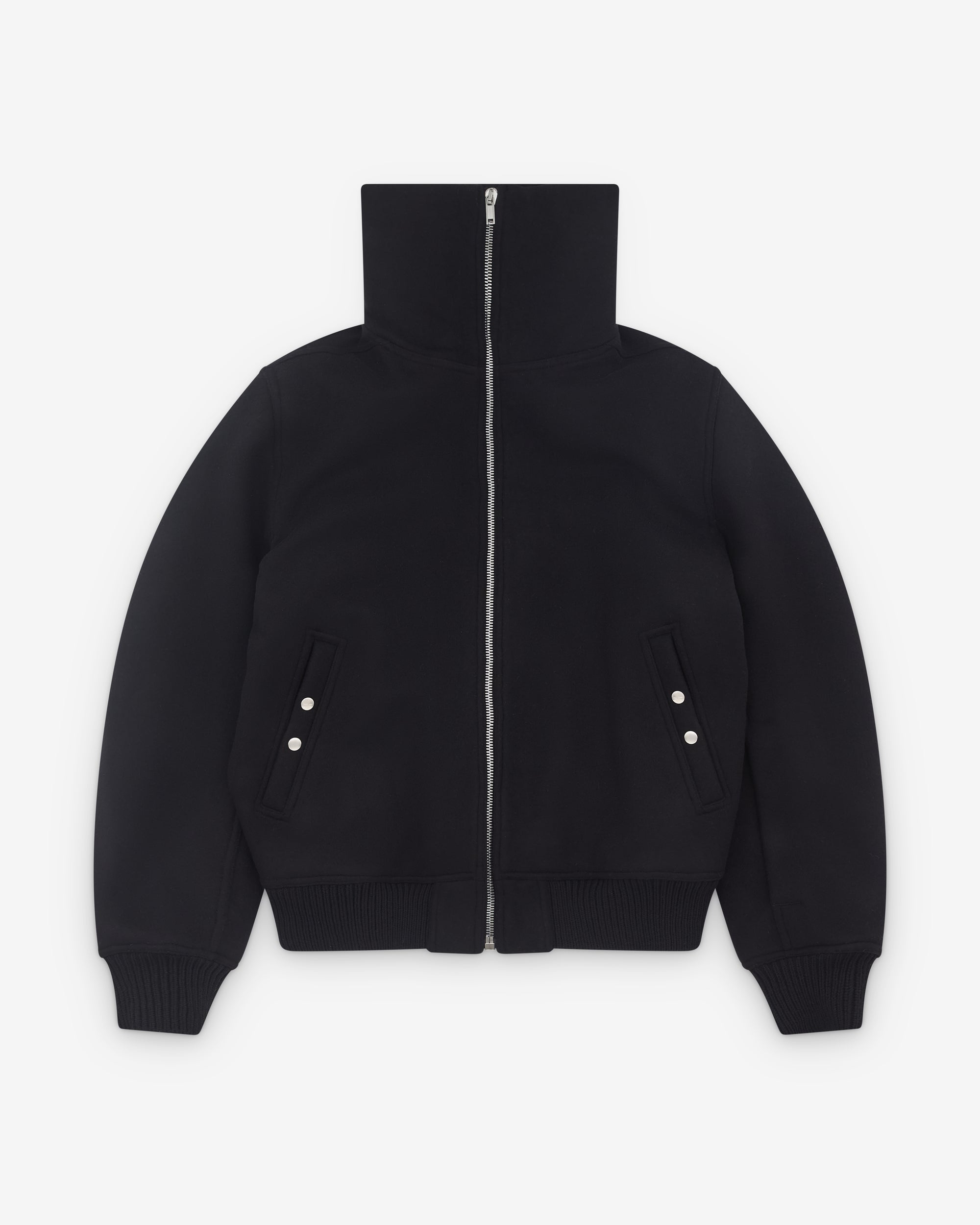 Centre front zip fasteningExaggerated funnel neck to be work up or downDropped shoulderCurved sleevesRib knit trimsPress stud wel pocketsLinedDouble internal pockets