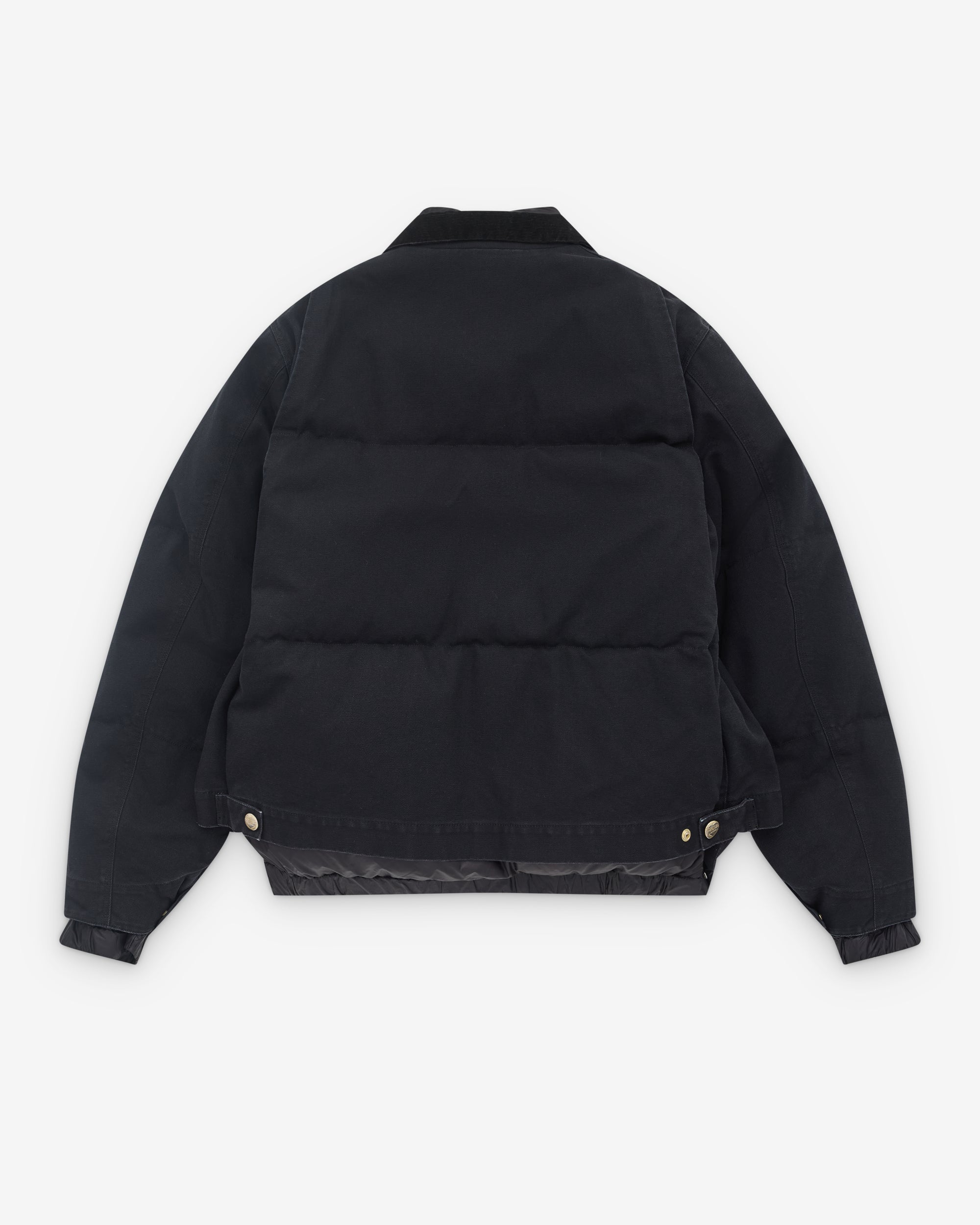 Canvas exterior fabricInterior baffled down jacketTwo way zip closureDual branded patch at chestFront slip pocketsPull cord waistCorduroy collarZip close chest pocket