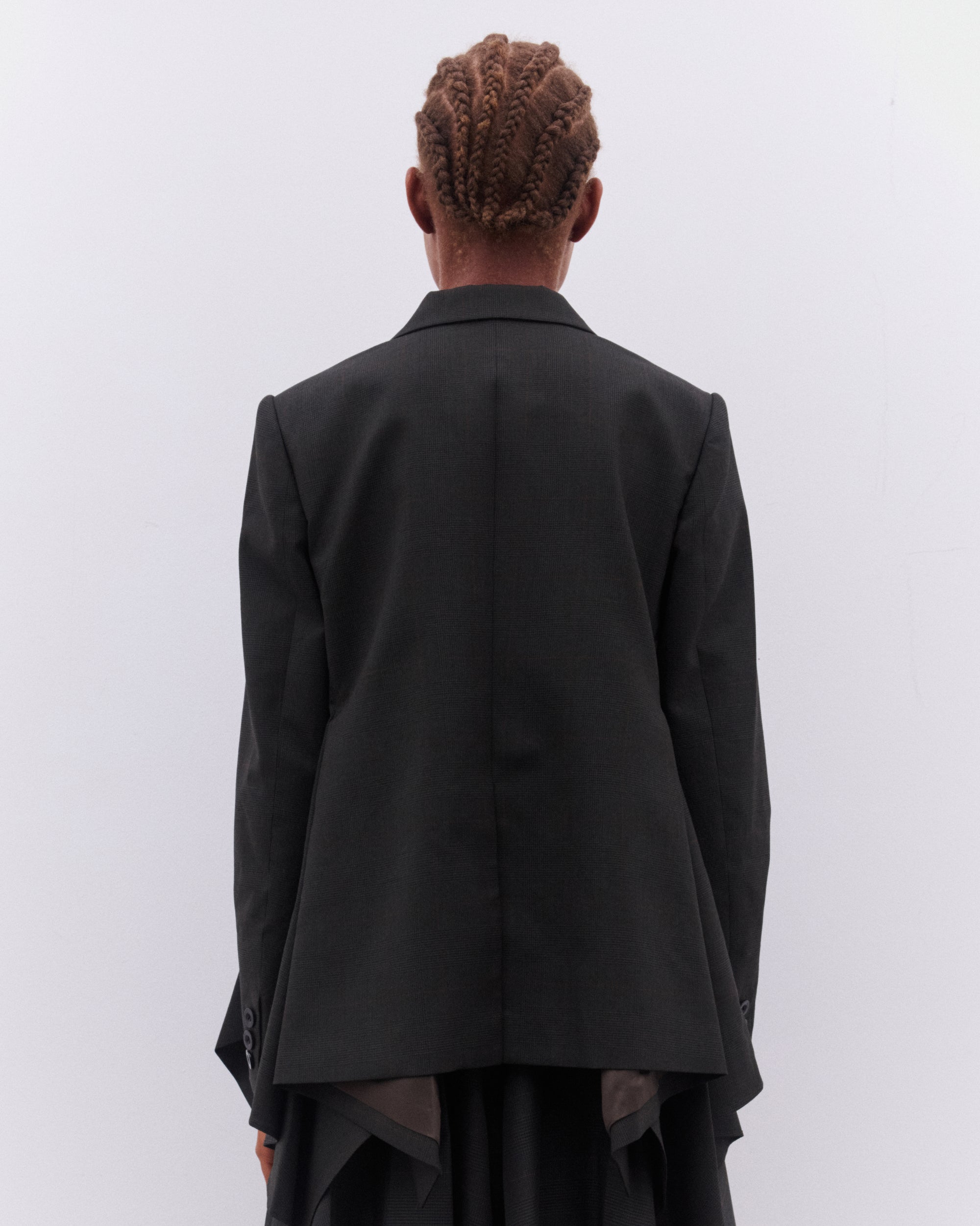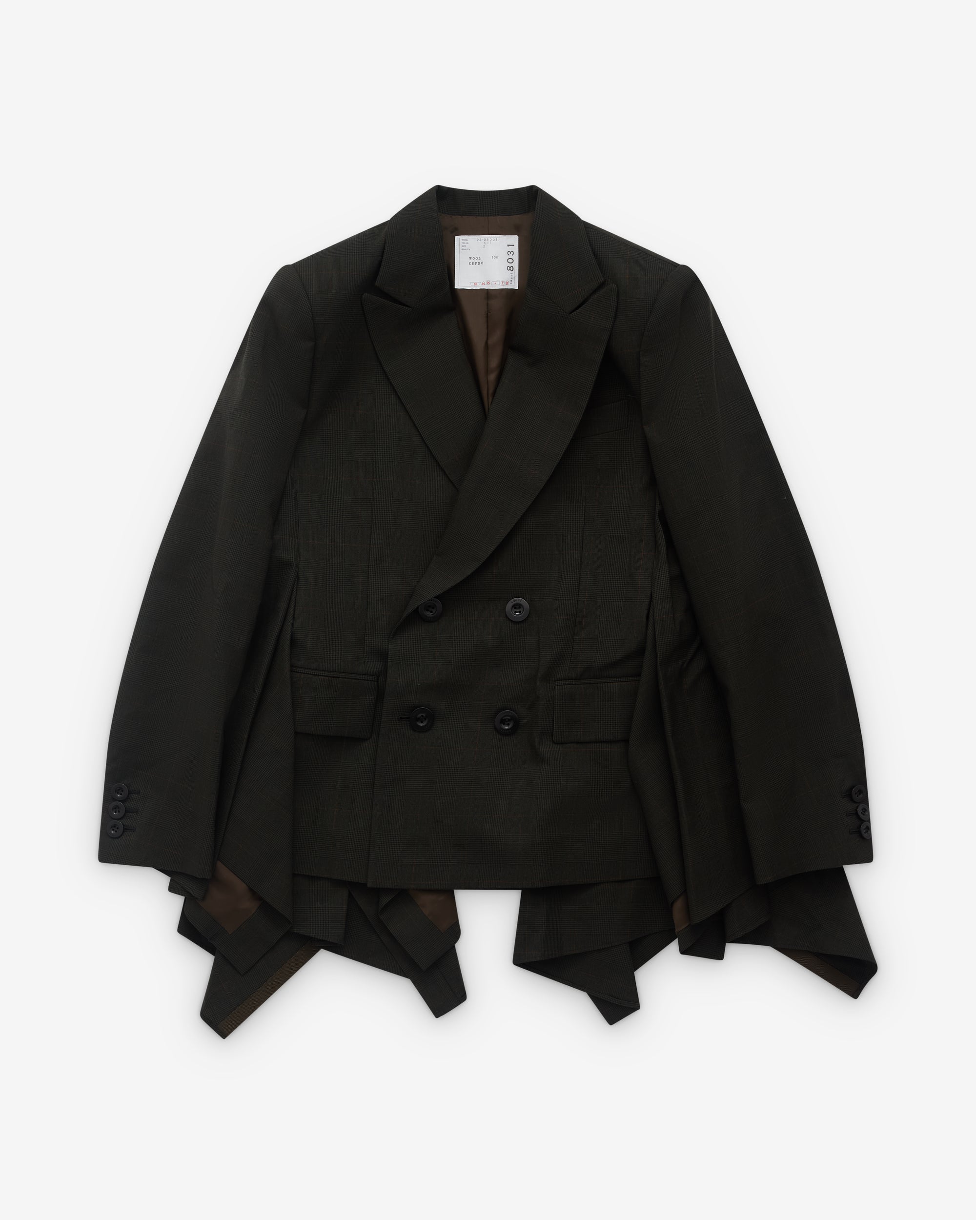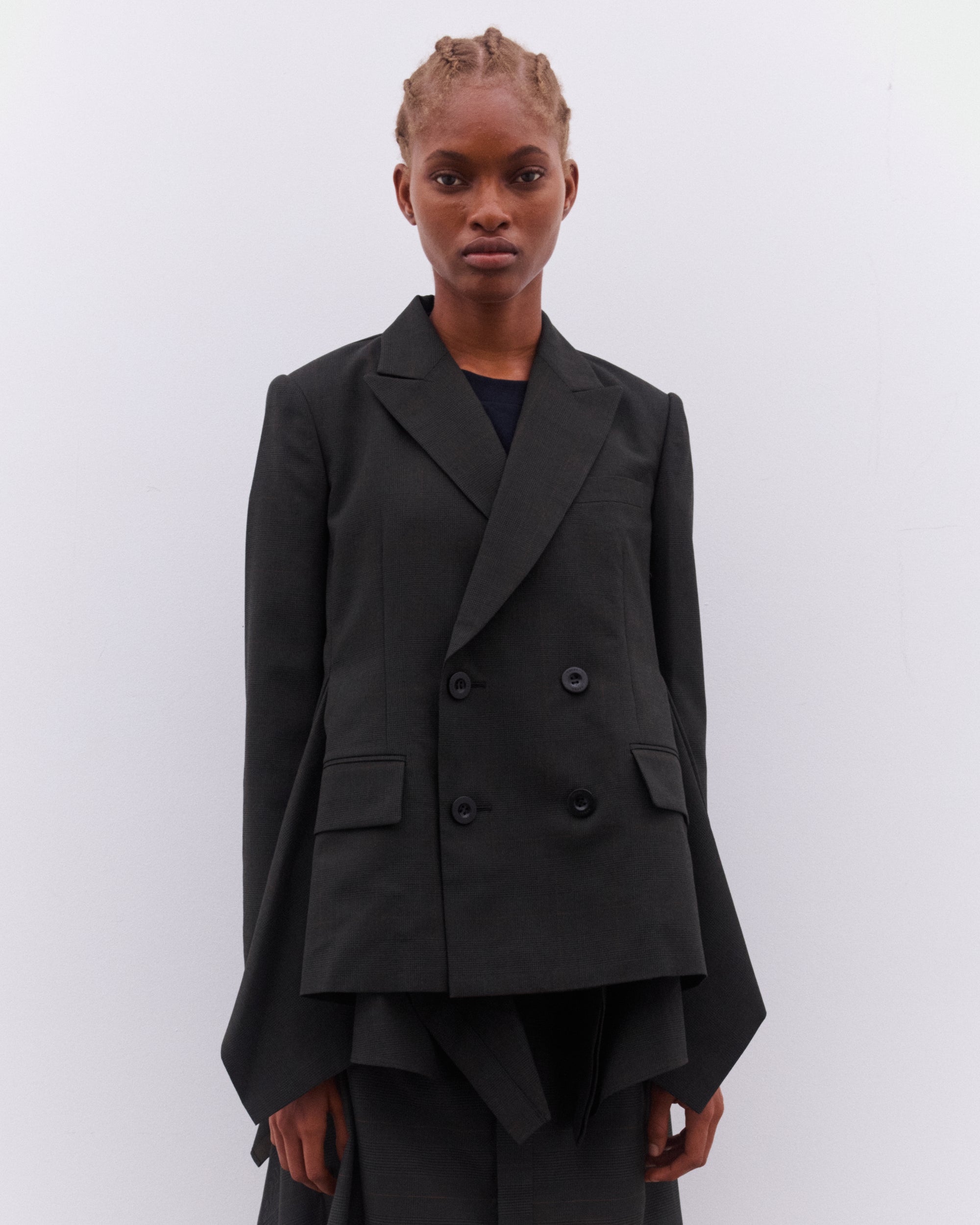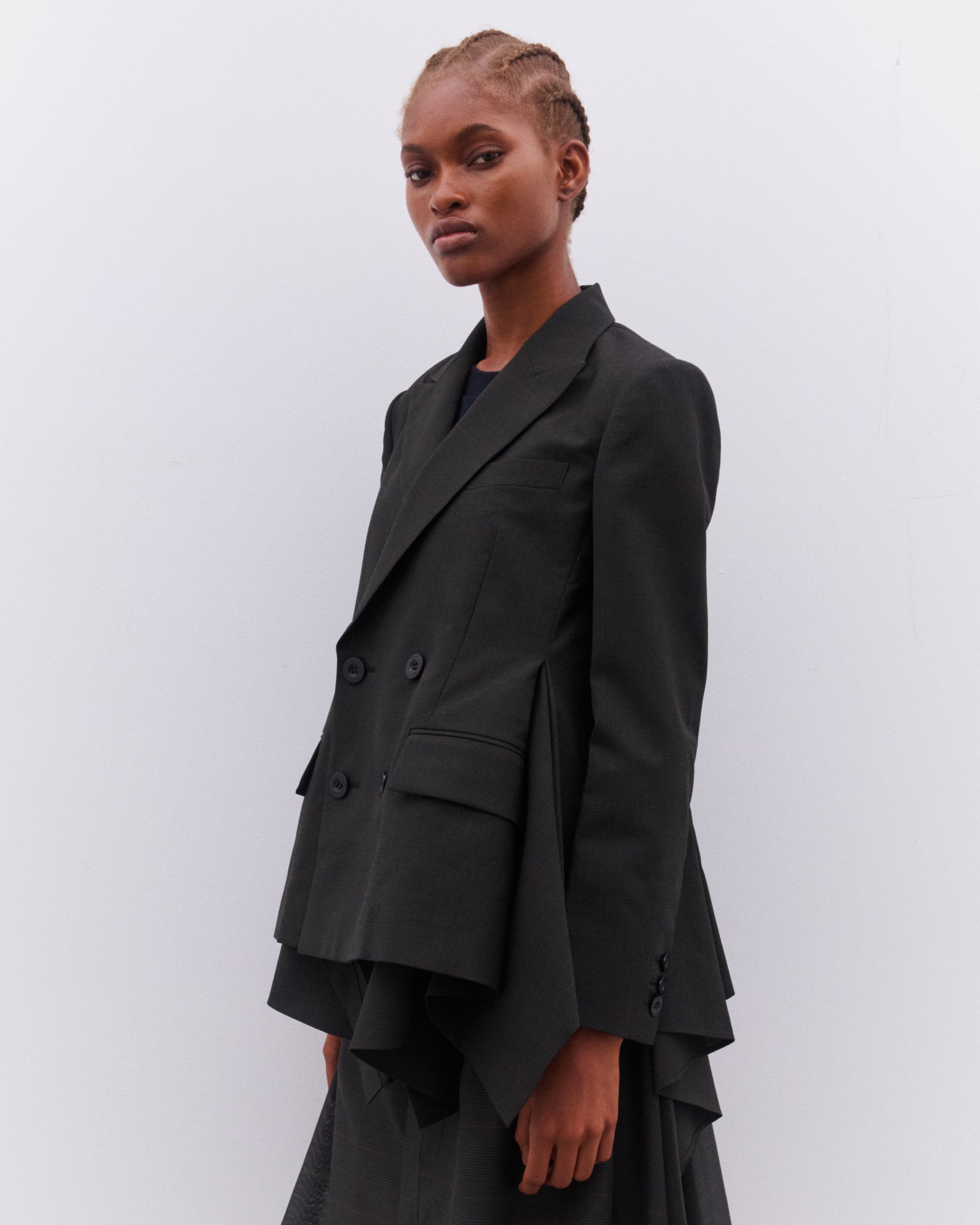 Double breasted closurePeak lapel collarFull internal liningAsymmetric cut hemFront flap pockets