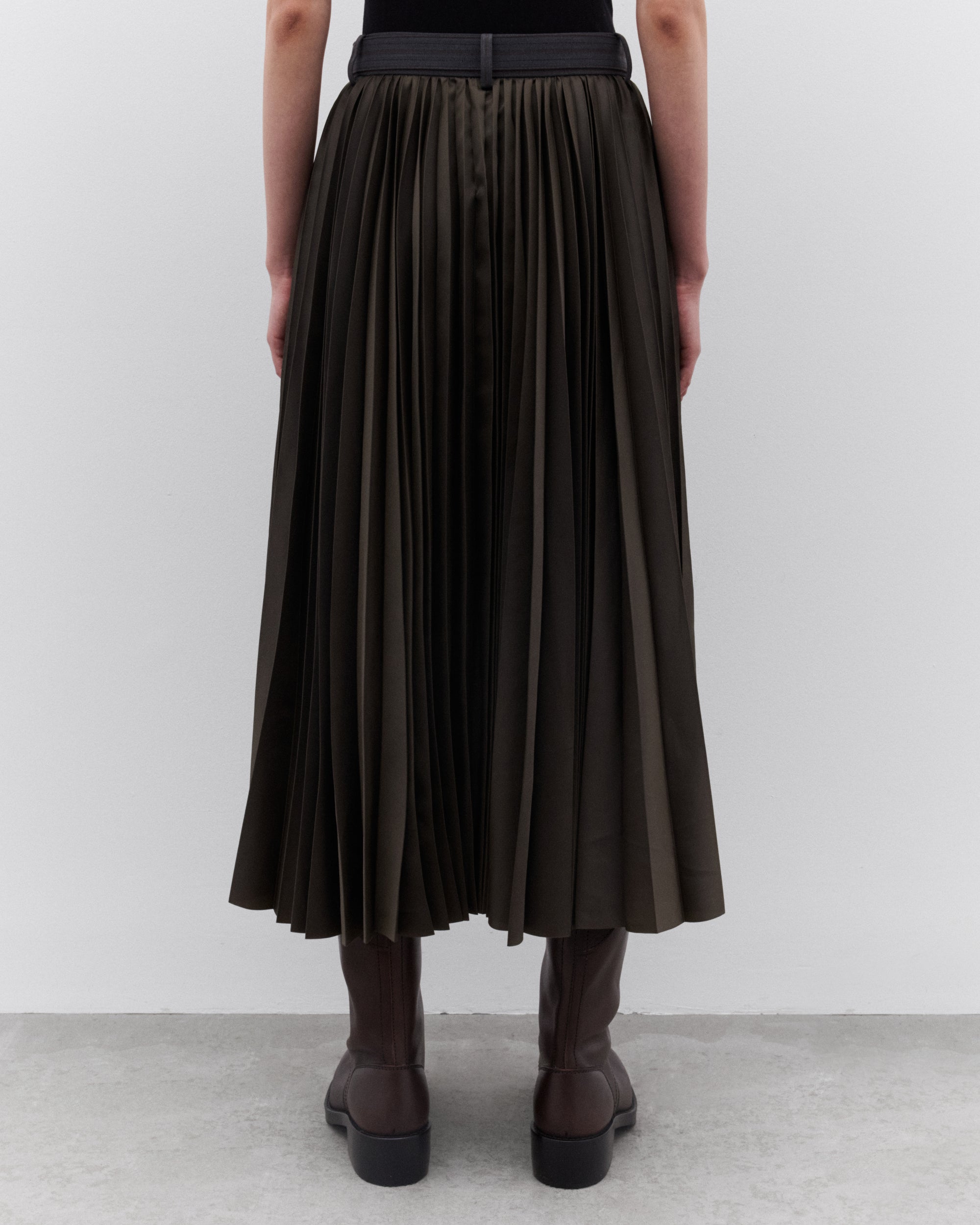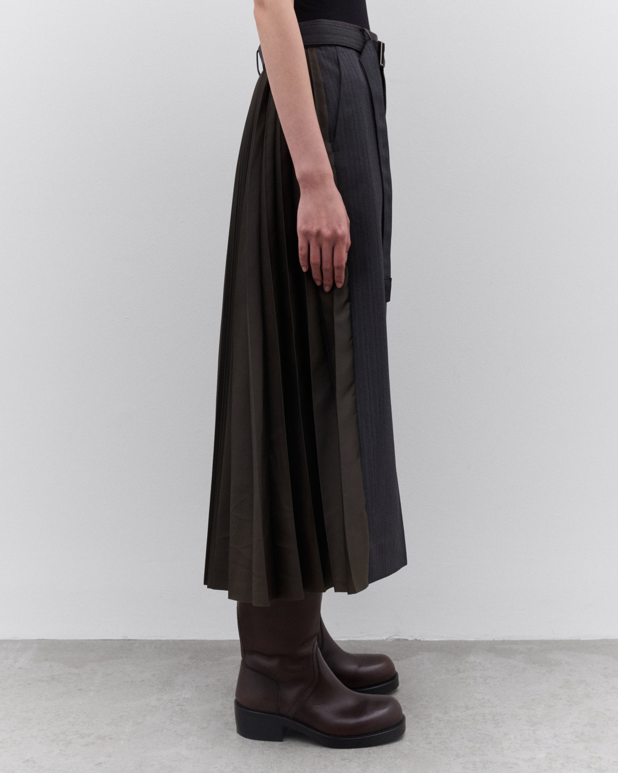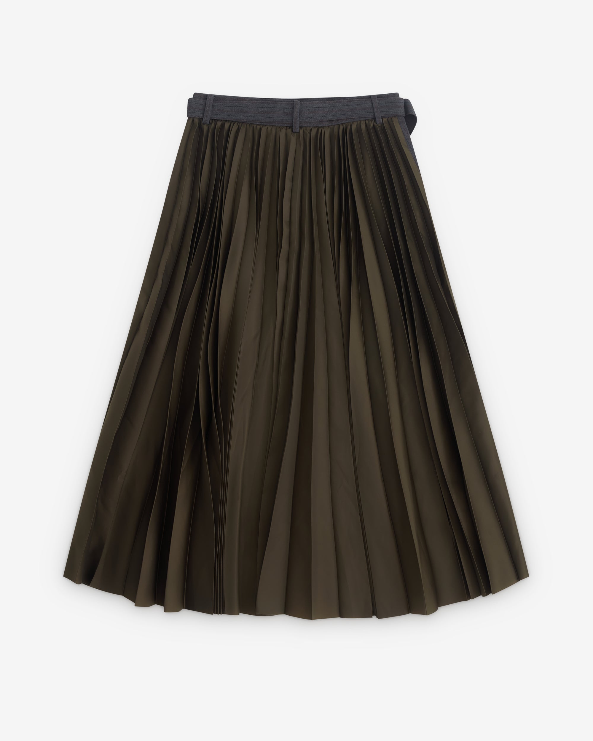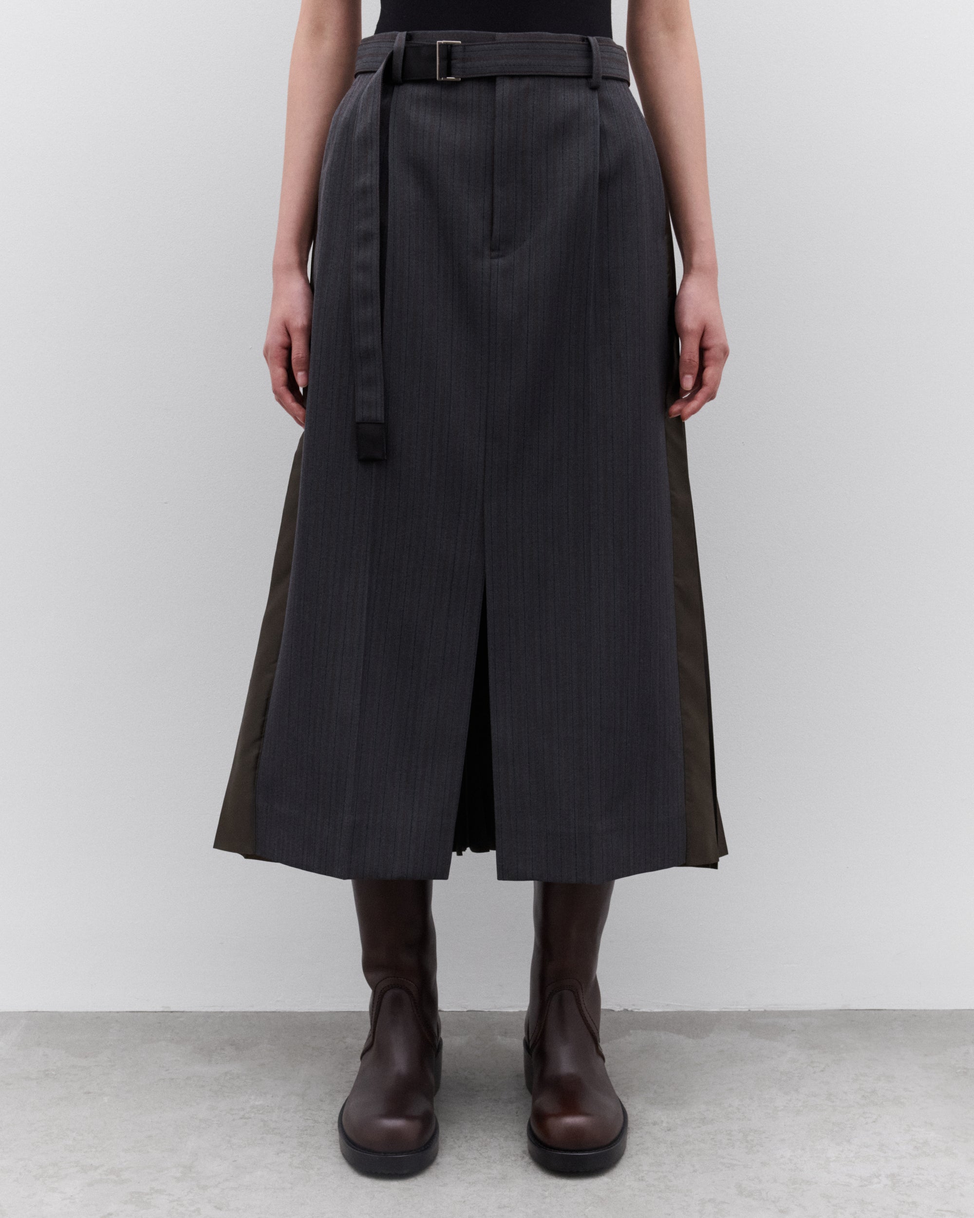 Striped fabric front panelAdjustable belted waistSide seam pocketsA-line silhouetteMidi skirt length Pleated back panel