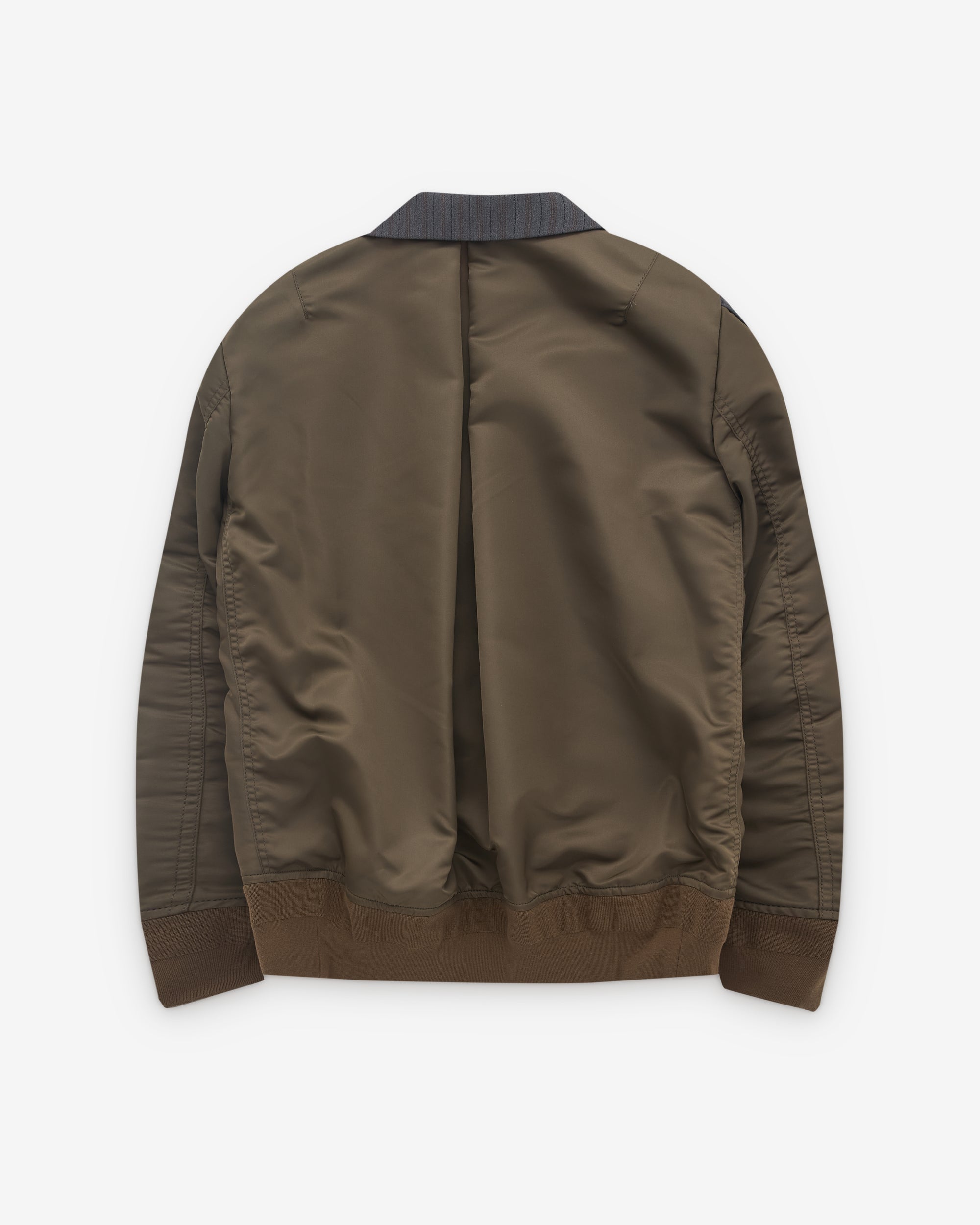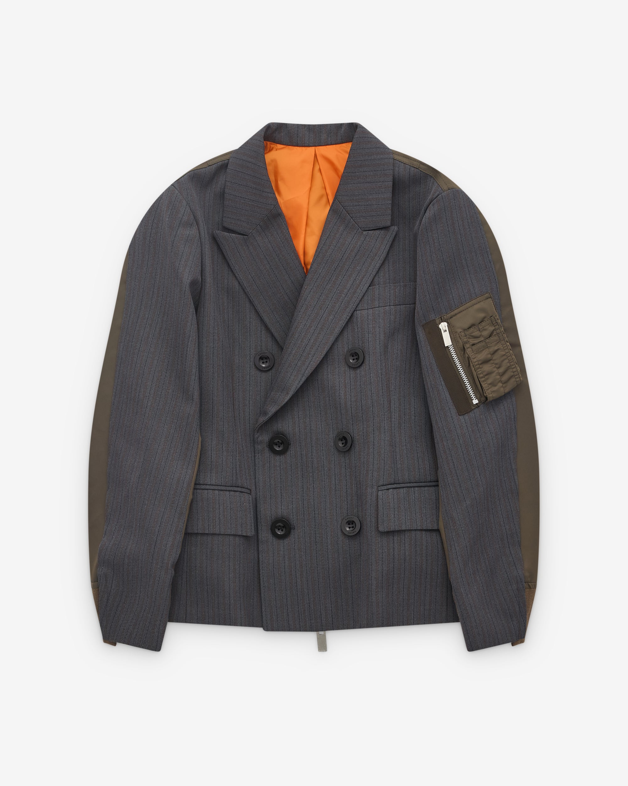 Notch lapelsDouble breastedFront flap pocketsChest welt pocketRear bomber jacket panelPaddedContrast liningRear inverted central pleatRib knit trims55% Polyethylene, 45% WoolMade in Japan